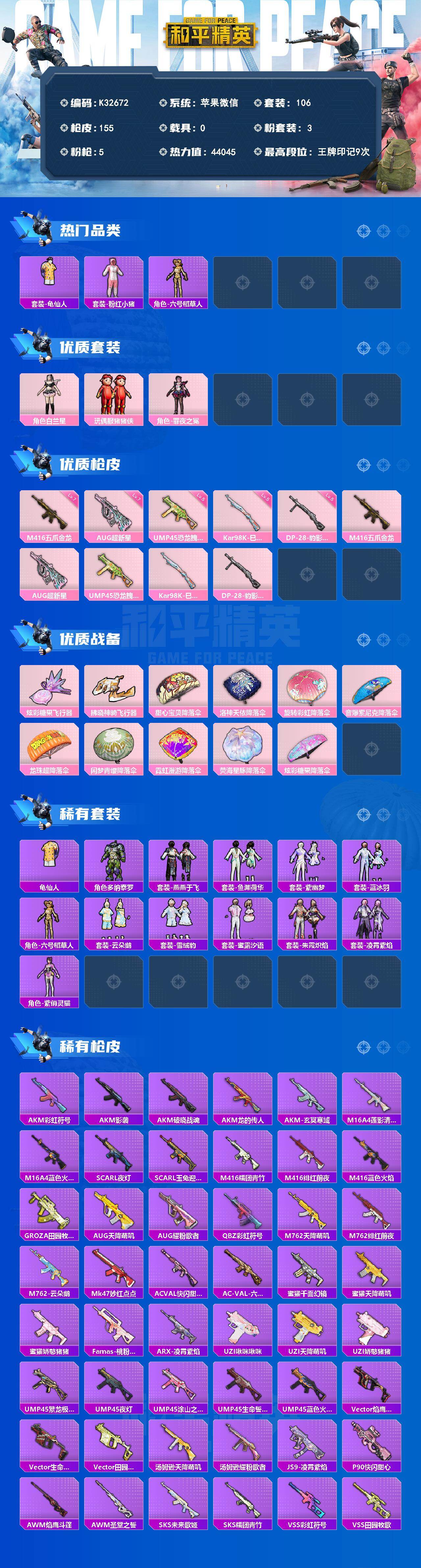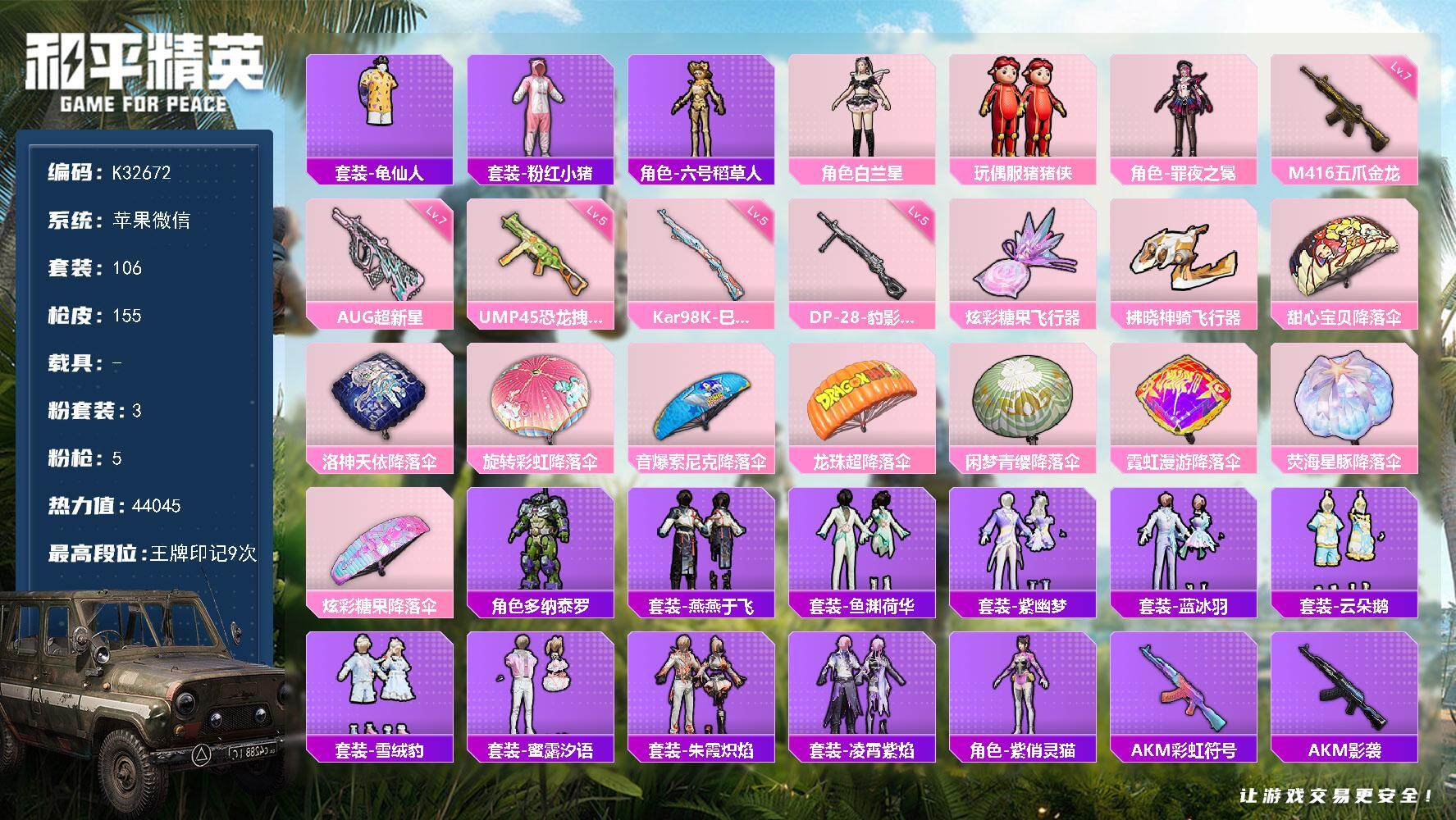 苹果 微信-3粉装-5特效枪-0载具-2粉色飞行器-44045热力值-9王牌印记-106套装-155枪皮