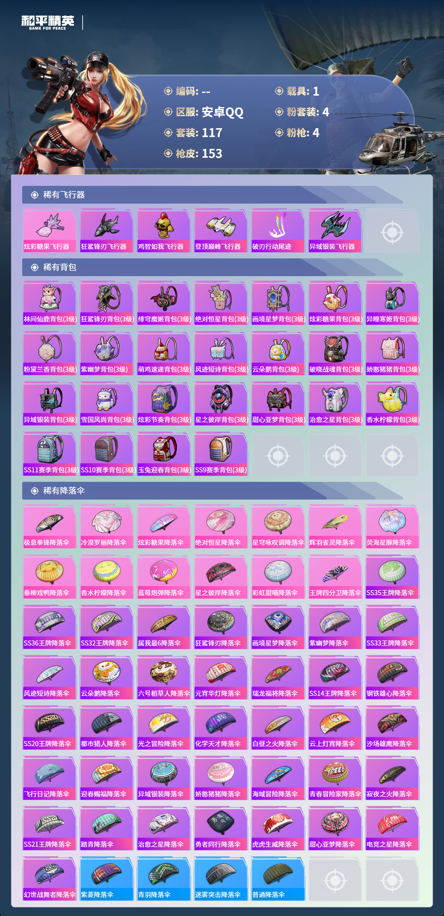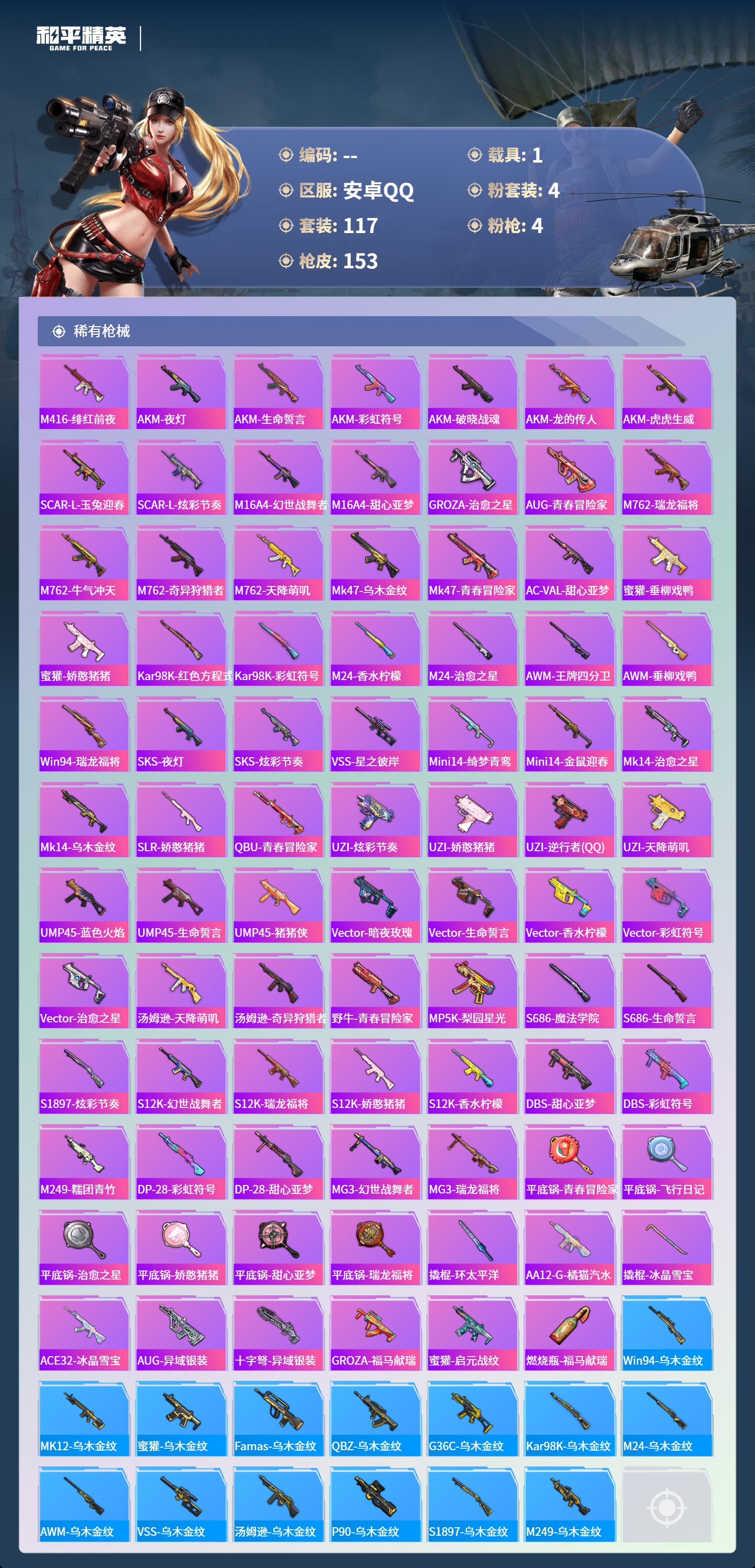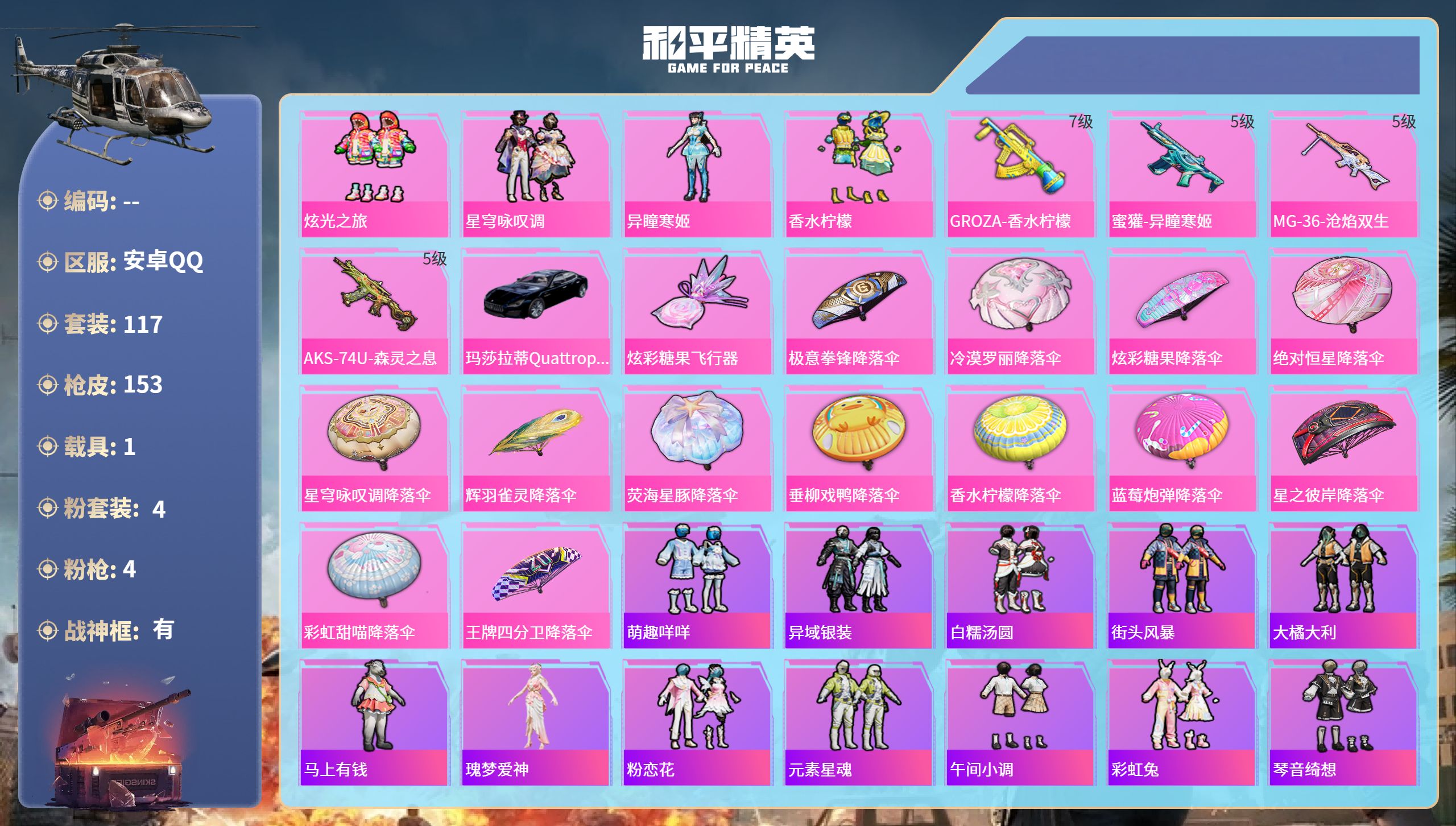hs65818安卓手Q-7王牌印记-有战神框-4粉装-4特效枪-1载具-48243热力值-117套装-153枪皮-2卓越印记-2传奇印记