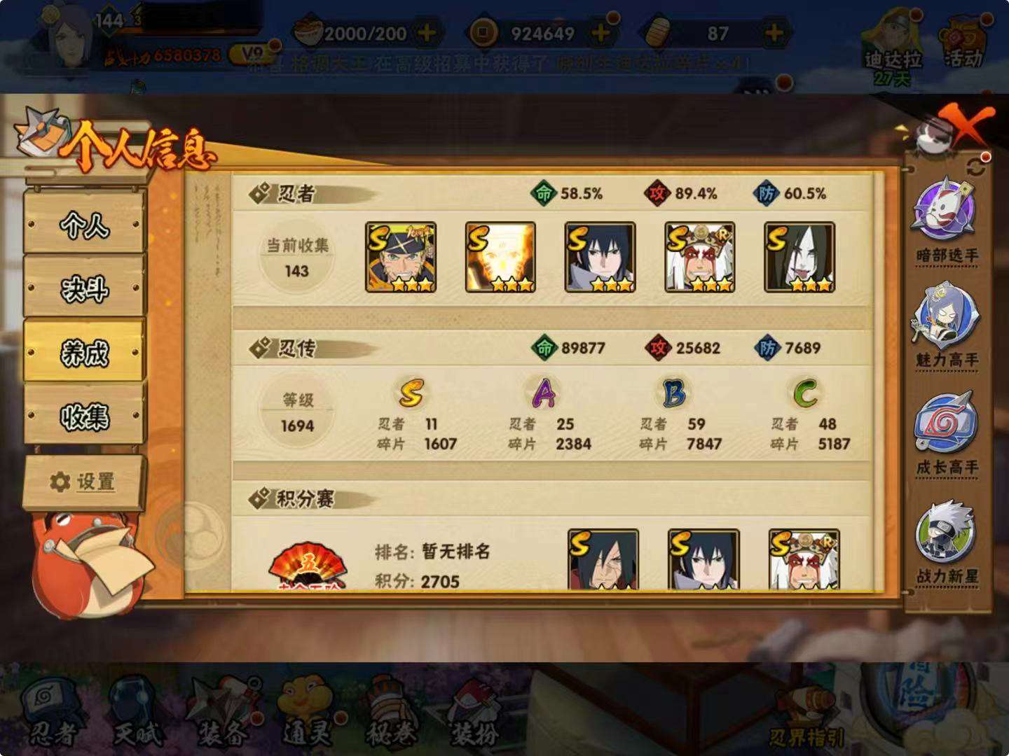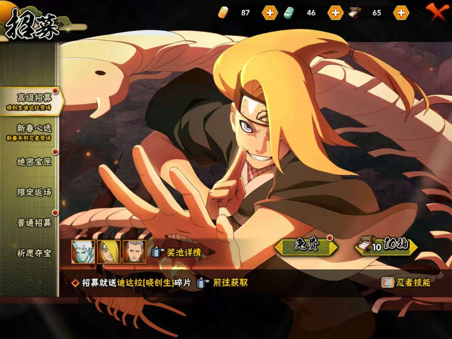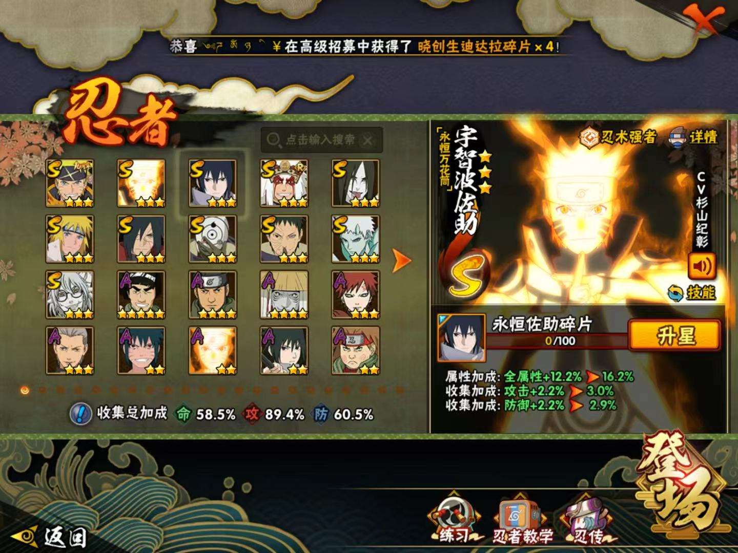 【S级】宇智波带土「忍界大战」 大蛇丸 漩涡鸣人·宇智波佐助 波风水门 宇智波斑「白面具」 漩涡鸣人「九喇嘛连结」 宇智波佐助「永恒万花筒」 自来也「舞之豪杰」 宇智波带土「十尾人柱力」 药师兜「仙人模式」 宇智波斑「秽土转生·解」