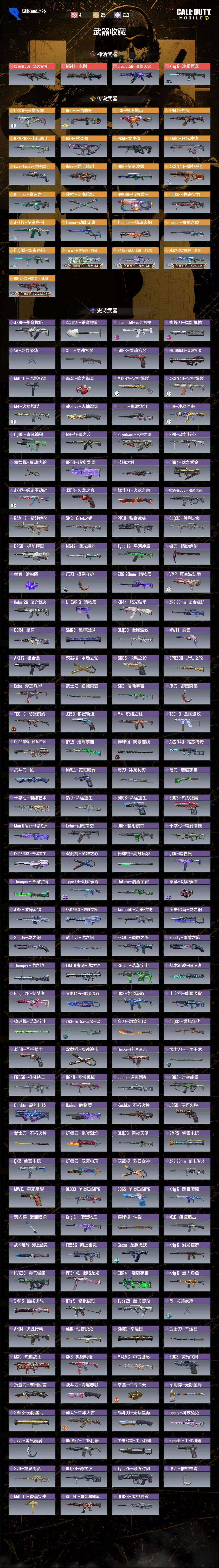 ,拉克曼556-燧火雷鸣,MG42-永别,Krig 6-冰霜巨龙,Grau 5.56-源核天灾,DLQ33-炫彩冬日,AK117-炫彩冬日,DLQ33-先进火力,AKS 74U-凛冬盛典,HG40-灵魂羁绊·典藏,Locus-海神之戟,藤棍-沙海蛇影,HDR-炫彩泼墨,HVK30-街机霸王,AK117-火龙咆哮·典藏,NA45-狼人传说·典藏,Locus-动能无限,Oden-混