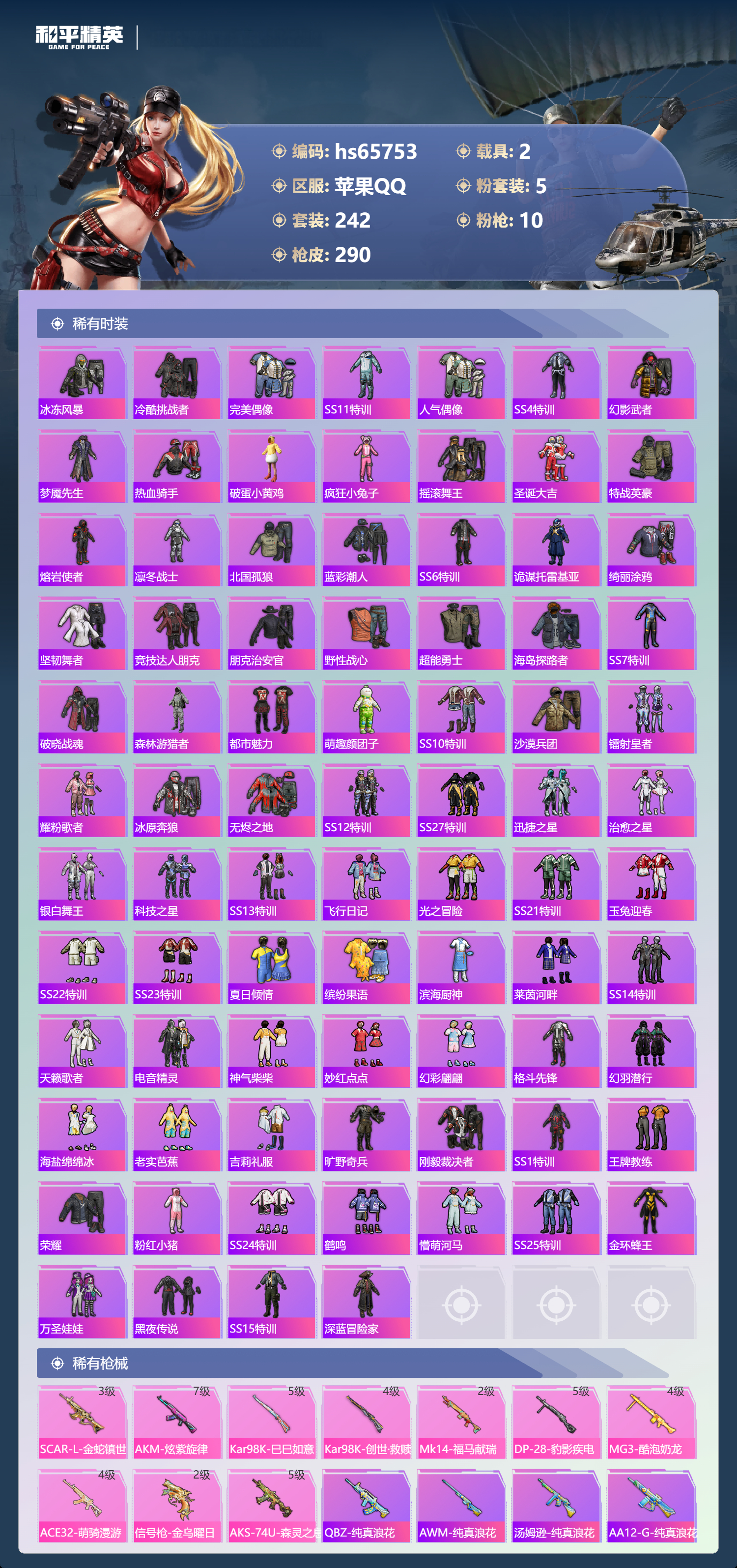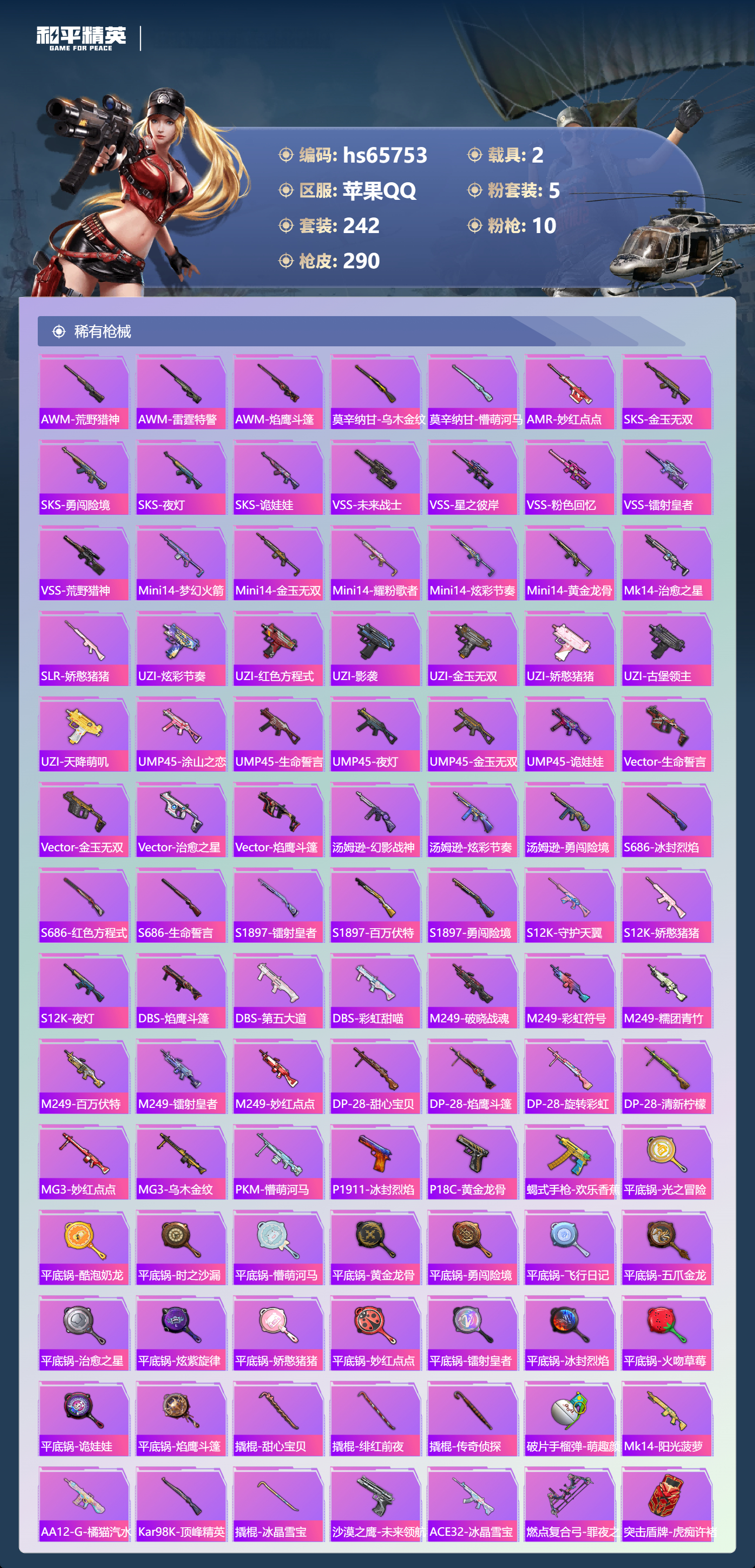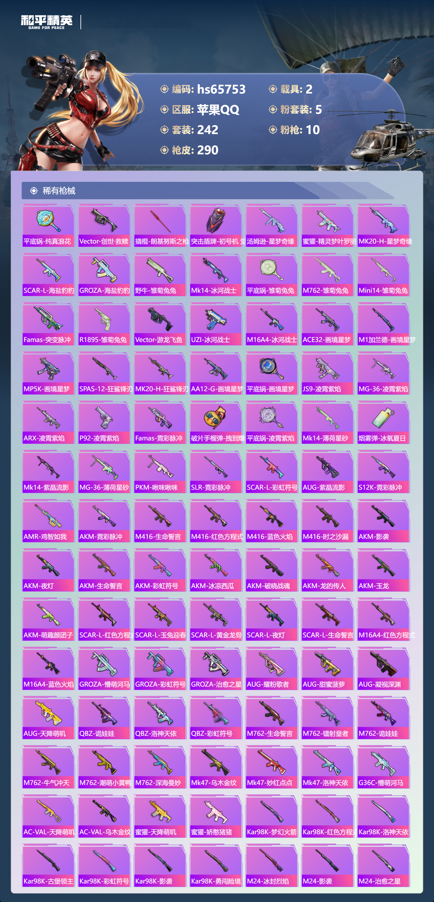 hs65753 苹果手Q-14王牌印记-5粉装-10特效枪-2载具-87766热力值-242套装-290枪皮