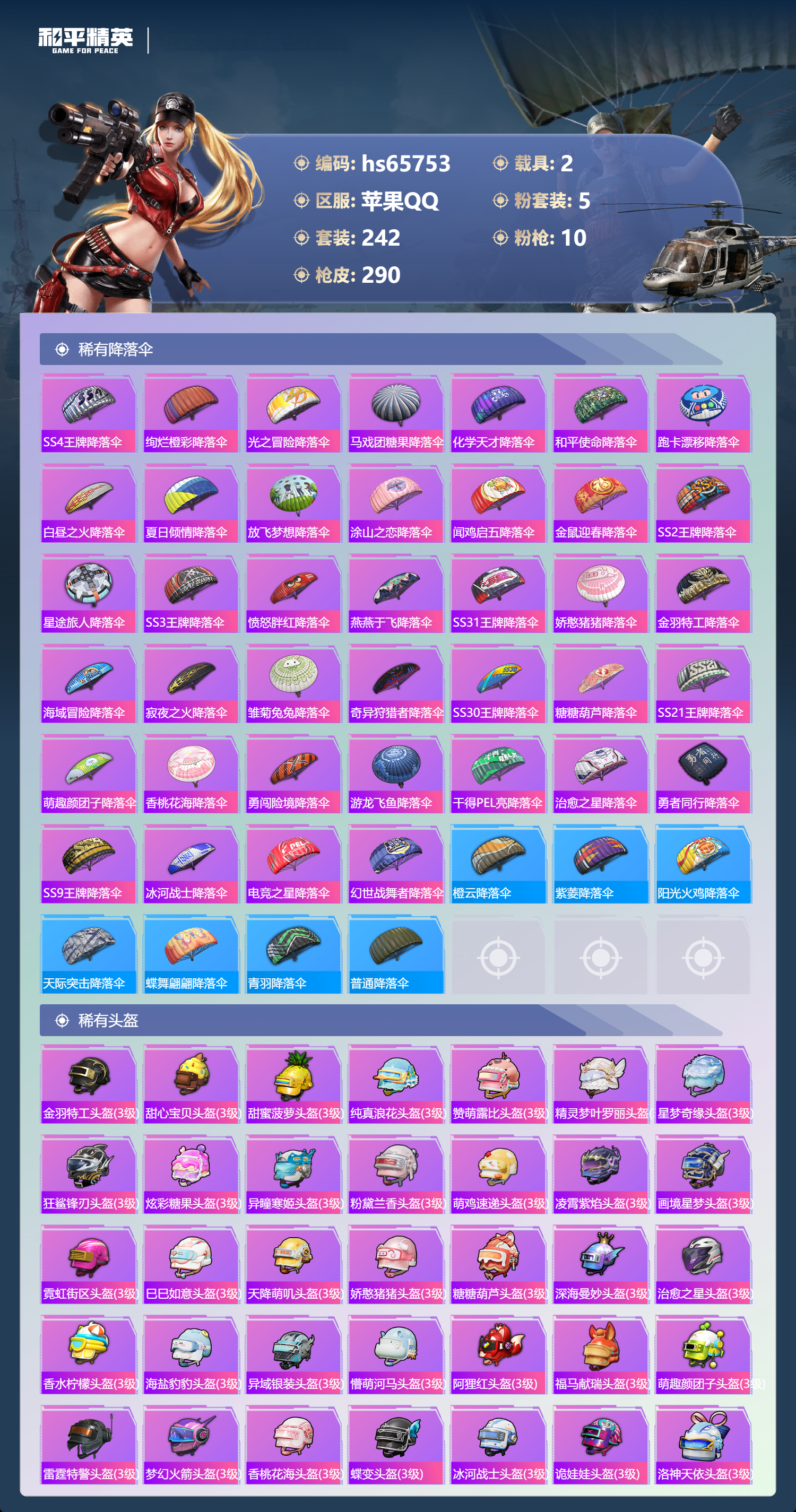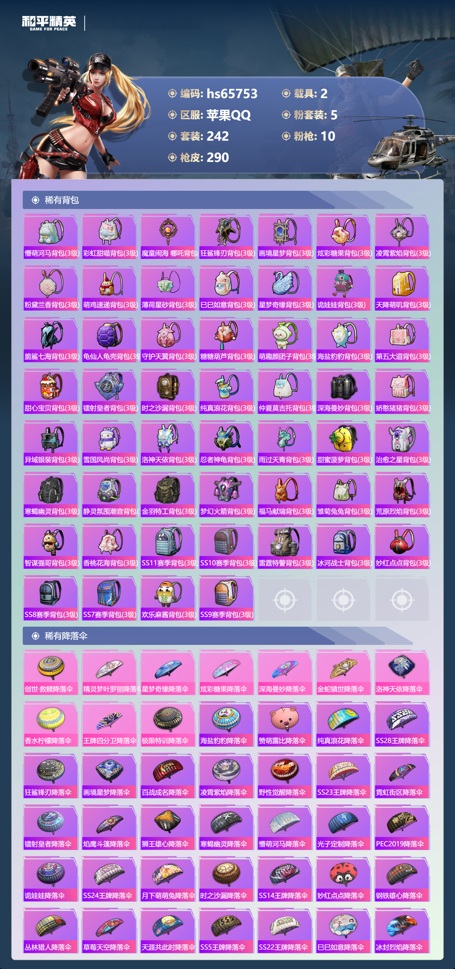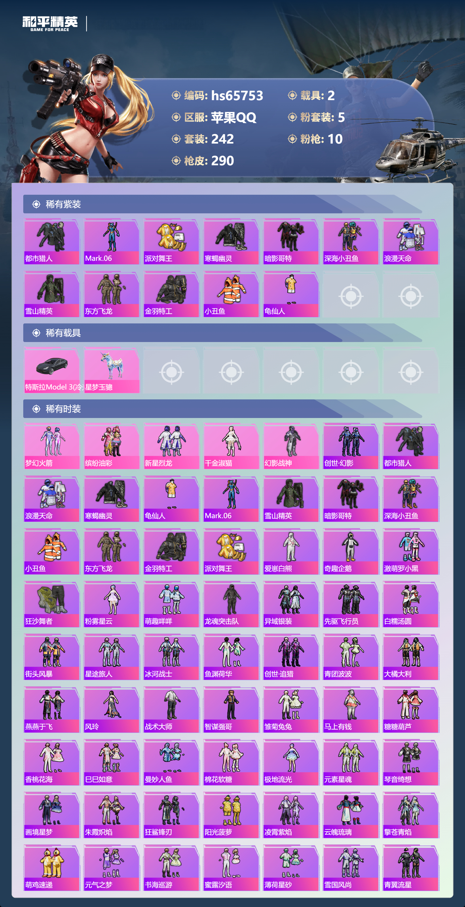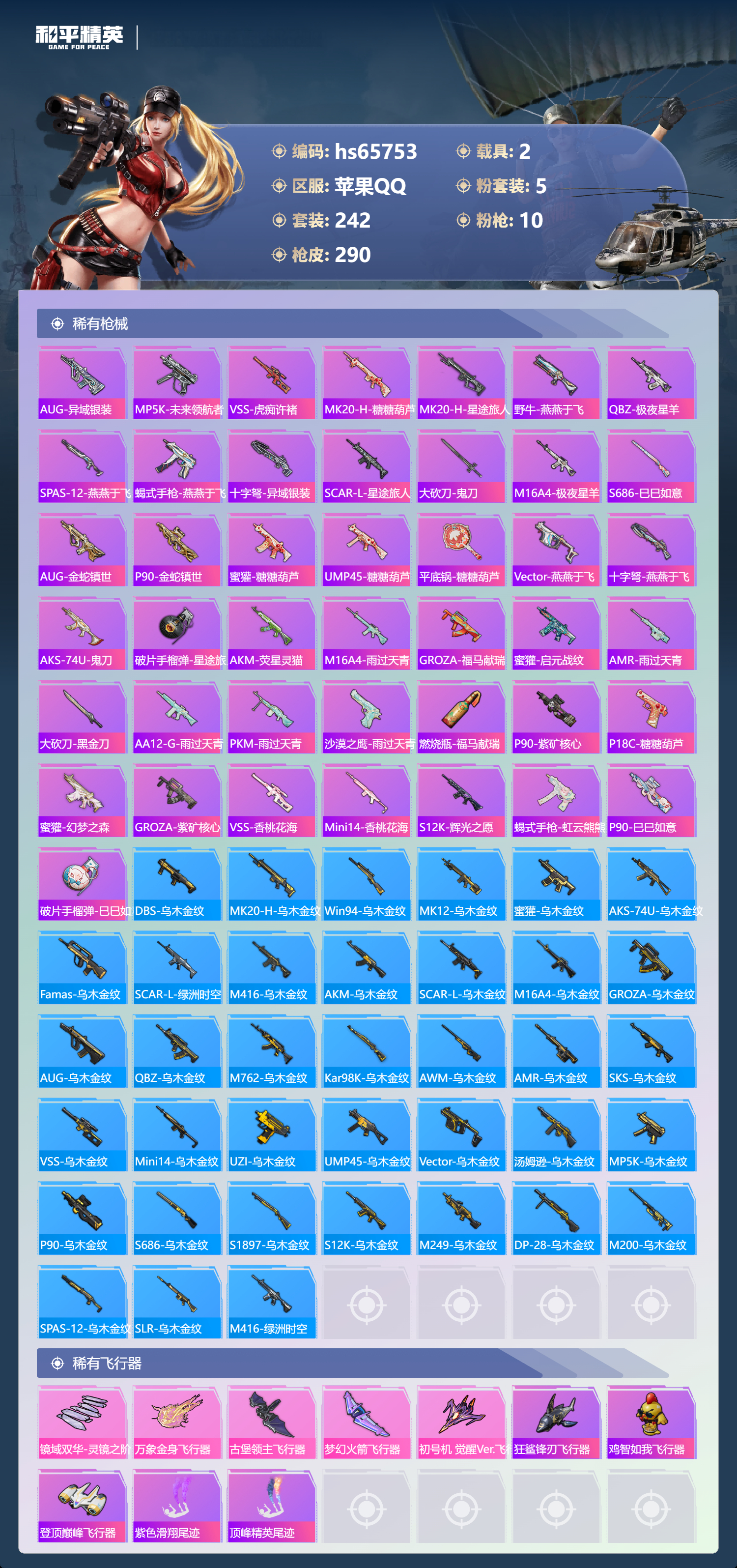 hs65753 苹果手Q-14王牌印记-5粉装-10特效枪-2载具-87766热力值-242套装-290枪皮