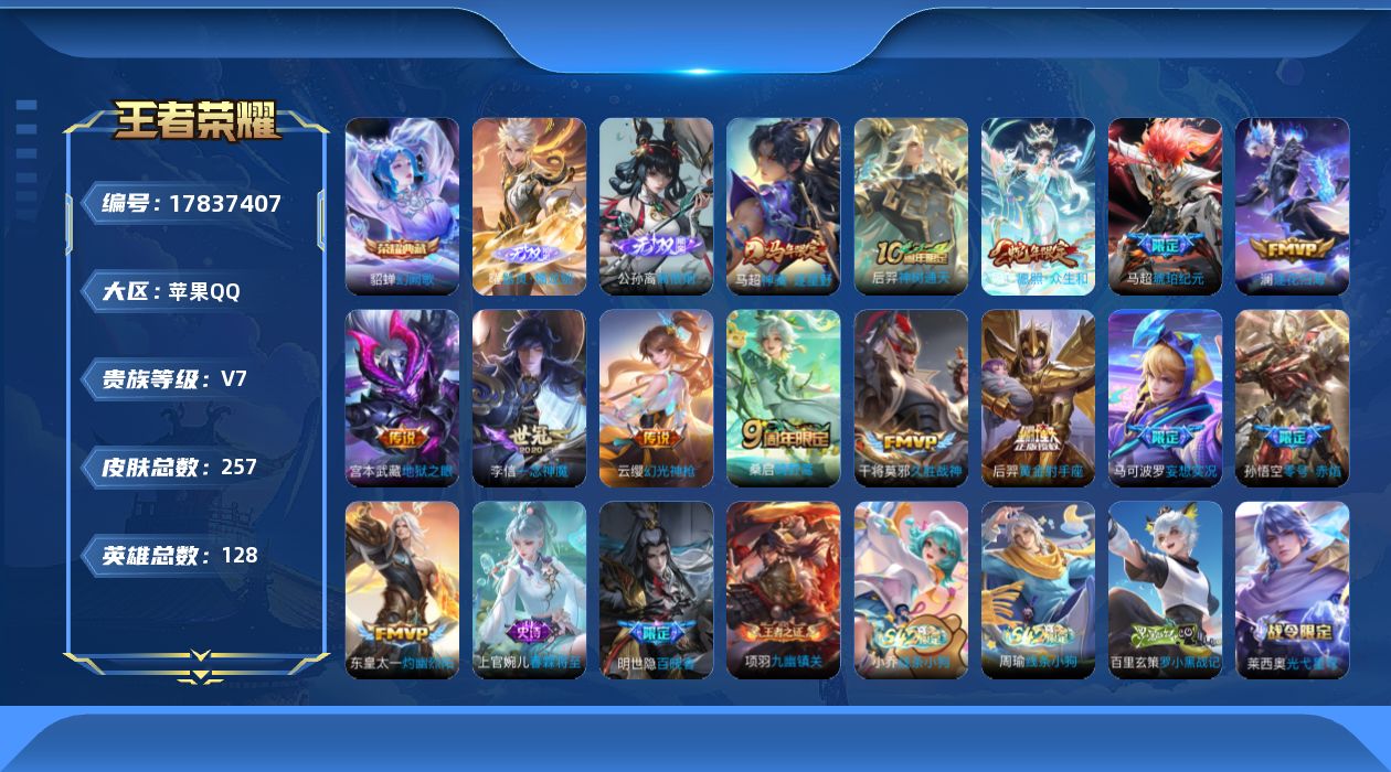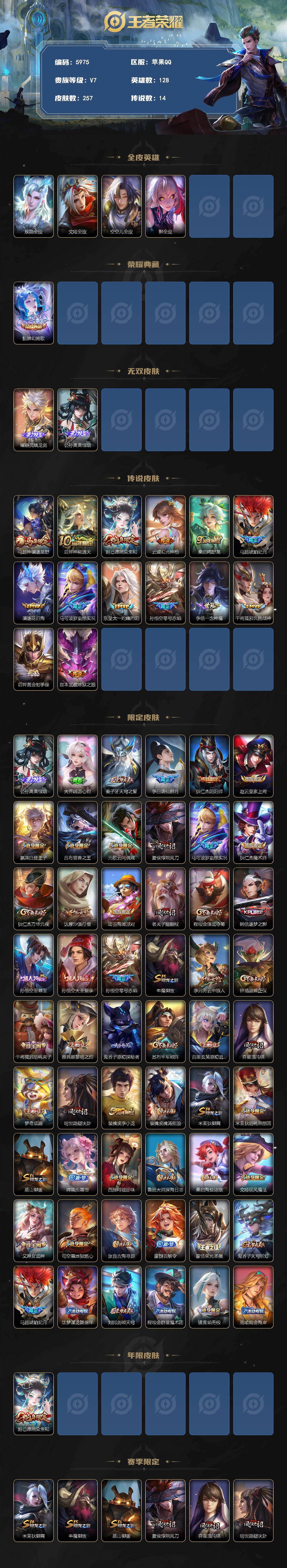 952-[17837407]幽冥眼苹果手Q130区257皮1典藏14传说2无双V7 营地ID547114311无双王者【无双皮肤】:离恨烟,器灵·螭龙剑【荣耀典藏】:幻阙歌【优质限定皮肤】:神威,至尊宝【传说皮肤】:灼幽烈阳,神骥·逐星野,黄金射手座,神树通天,琥珀纪元,久胜战神,逐花归海,零号·赤焰,愿照·众生和,鸣野蒿,地狱之眼,一念神魔,幻光神枪,妄想实况【史诗皮肤】:线条小狗,九幽镇关,舞动绿茵,春霖将至,乘风破浪,闲日渔趣,百晓客,未来纪元,地狱燃心,胡桃异想国,光弋星穹,罗小黑战记,