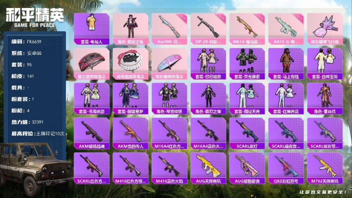 49点满天赋-游戏等级53-10王牌印记-角色-罪夜之冕-1粉装4特效枪-身法素材号】 安卓 手Q-1粉装-4特效枪-0载具-1粉色飞行器-32391热力值-10王牌印记-95套装-141枪皮 【热门品类】:套装-龟仙人 【粉色套装】:角色-罪夜之冕 【粉色枪皮等级】:Kar98K-巳巳如意(五级),Mk14-福马献瑞(五级),AA12-G-萌骑幻想(三级),DP-28-豹影疾