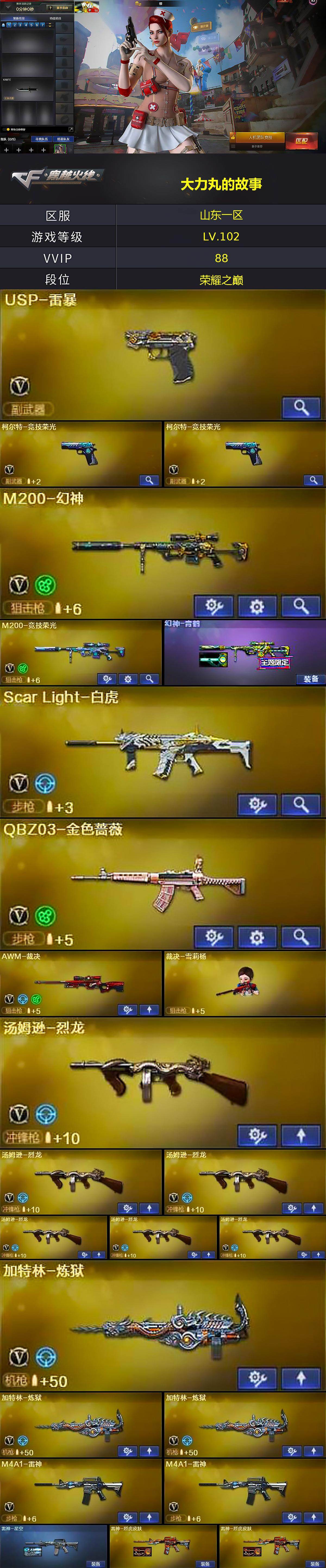 【店主推荐/有二次/秒换绑】幻神皮肤!山东一区-93V-4王者武器数-5炫金武器数【热门武器】:QBZ03-金色蔷薇,Scar Light-白虎,HK417-朱雀,M200-幻神,M200-竞技荣光,死亡之眼,M4A1-黑骑士,汤姆逊-烈龙*6,加特林-炼狱*3,裁决-雪莉杨,USP-雷暴【王者炫金武器】:炫金骑士*2,炫金毁灭,炫金天神*2【皮肤】:幻神-青鹤,雷神-星空,雷神-烈虎皮肤*2,火麒麟-AG战队皮肤,毁灭-星空,毁灭-CFS2020,黑骑士-暗月*2,战神-粉色甜心皮肤,战神-流