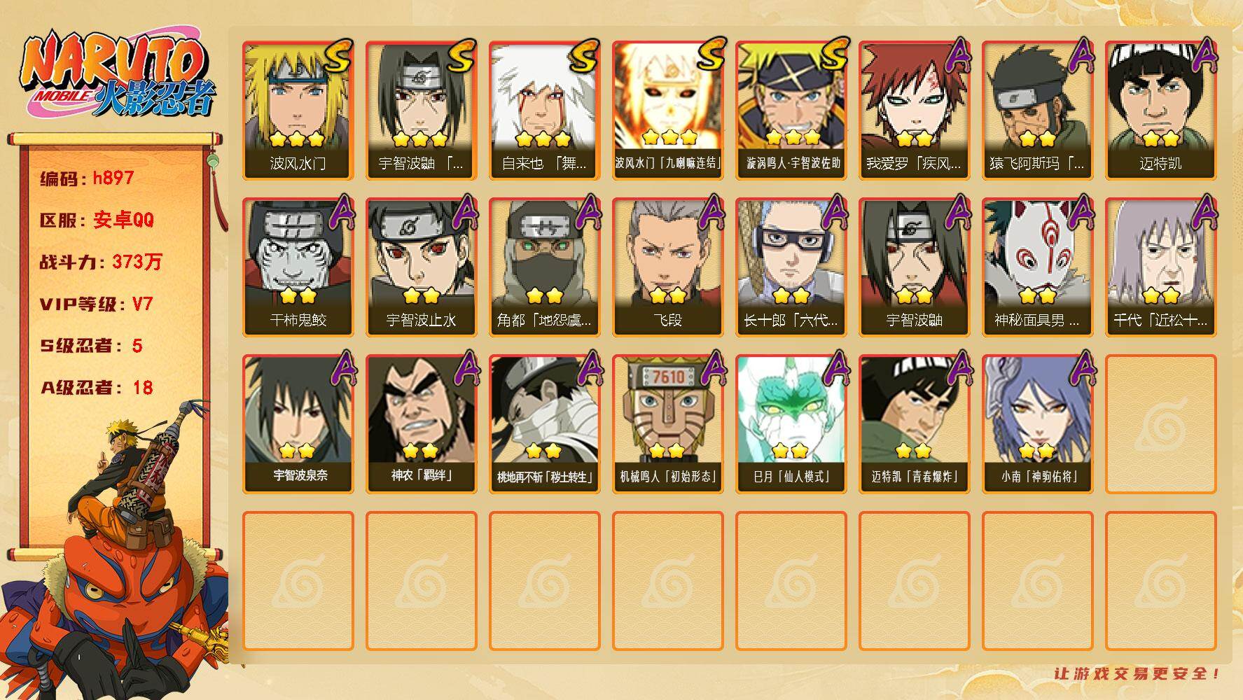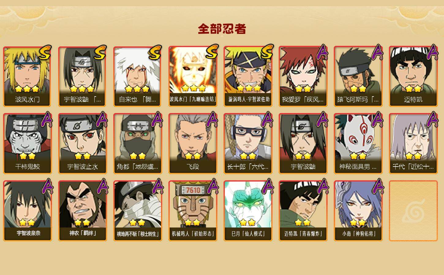 5S级忍者数-18A级忍者数【S级忍者】:宇智波鼬「须佐能乎」(3星),自来也「舞之豪杰」(3星),波风水门(3星),波风水门「九喇嘛连结」(3星),漩涡鸣人·宇智波佐助(3星)【A级忍者】:飞段(2星),干柿鬼鲛(2星),机械鸣人「初始形态」(2星),迈特凯(2星),桃地再不斩「秽土转生」(2星),我爱罗「疾风传」(2星),小南「神驹佑将」(2星),角都「地怨虞」(2星),猿飞阿斯玛「秽土转生」(2星),宇智波止水(2星),宇智波鼬(2星),长十郎「六代目水影」(2星),神秘面具男「忍者之路」