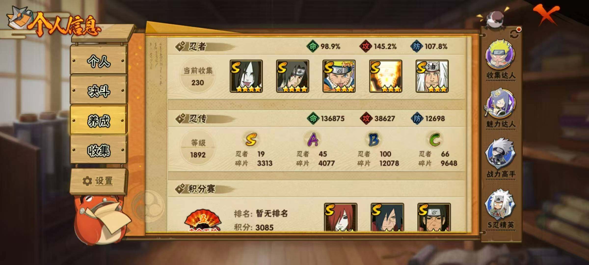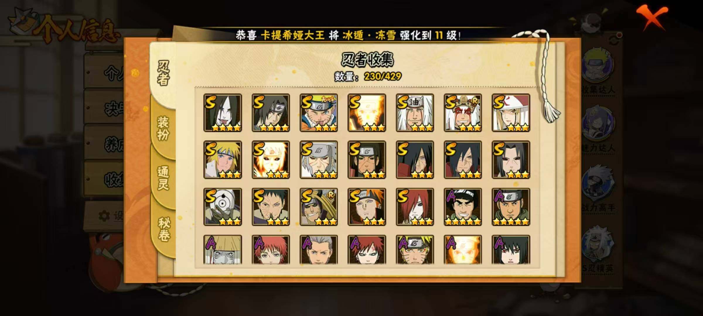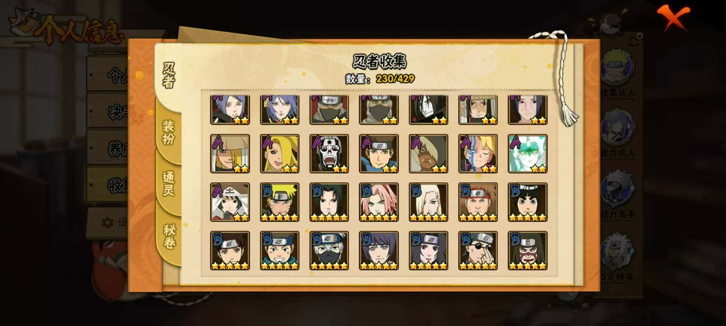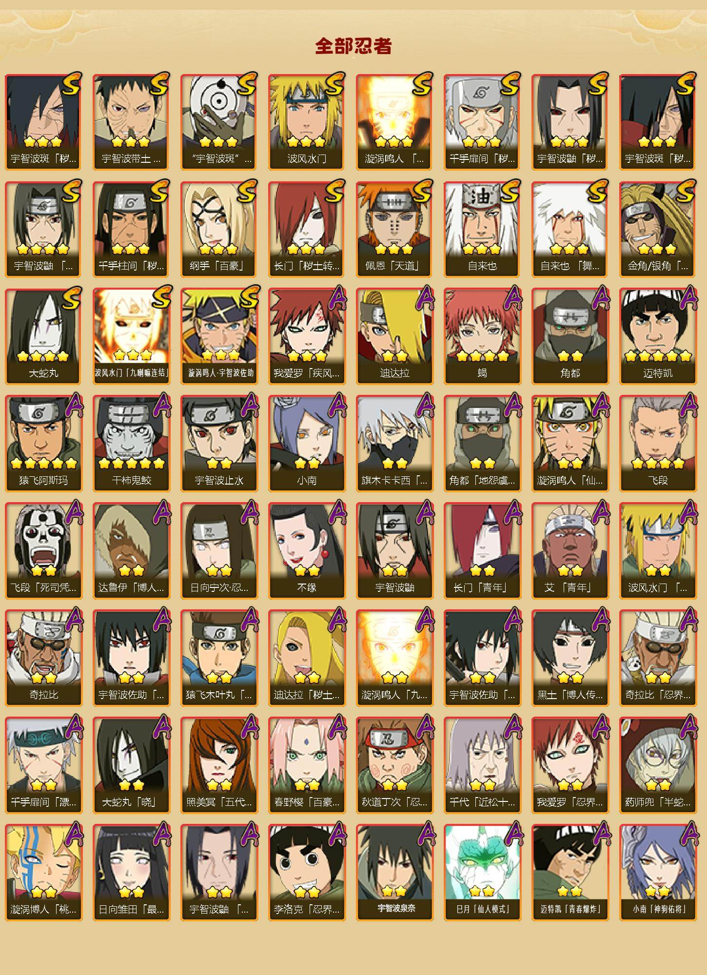 19S级忍者数-45A级忍者数【S级忍者】:长门「秽土转生」(3星),金角·银角「秽土转生」(3星),千手扉间「秽土转生」(3星),千手柱间「秽土转生」(3星),宇智波鼬「秽土转生」(3星),宇智波斑「秽土转生」(3星),宇智波斑「秽土转生·解」(3星),宇智波带土「忍界大战」(3星),宇智波鼬「须佐能乎」(4星),自来也(3星),自来也「舞之豪杰」(3星),大蛇丸(4星),纲手「百豪」(3星),波风水门(3星),漩涡鸣人「九喇嘛连结」(3星),佩恩「天道」(3星),宇智波斑 「白面具」(3星宇