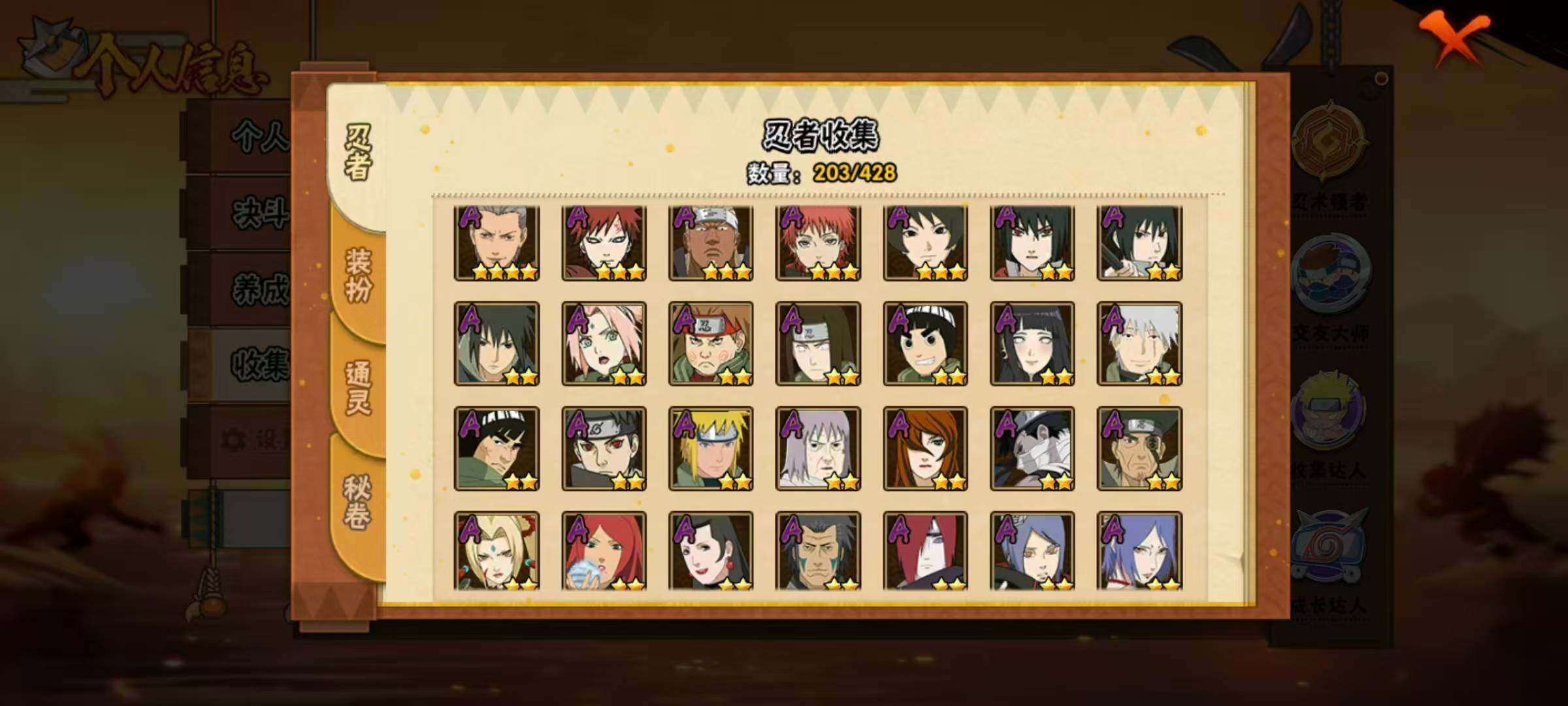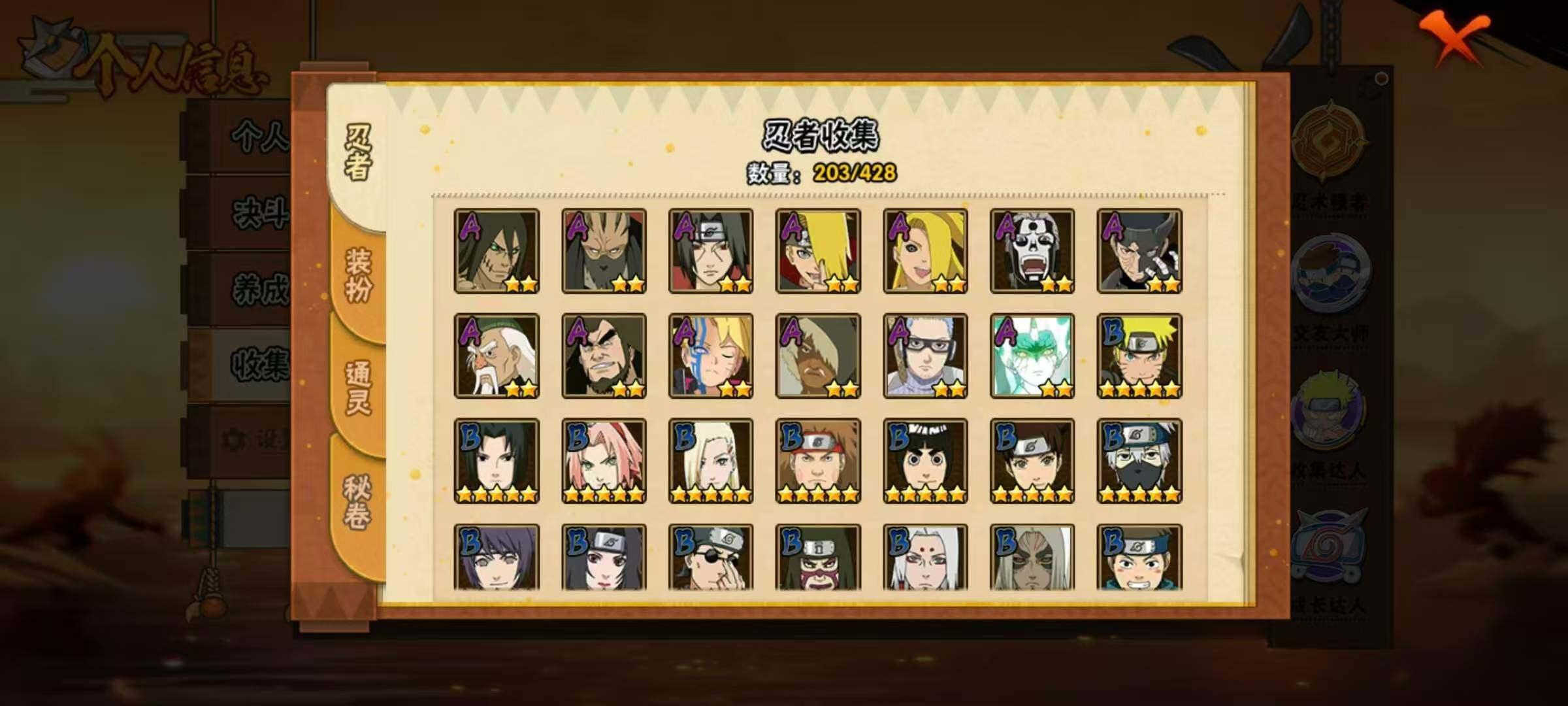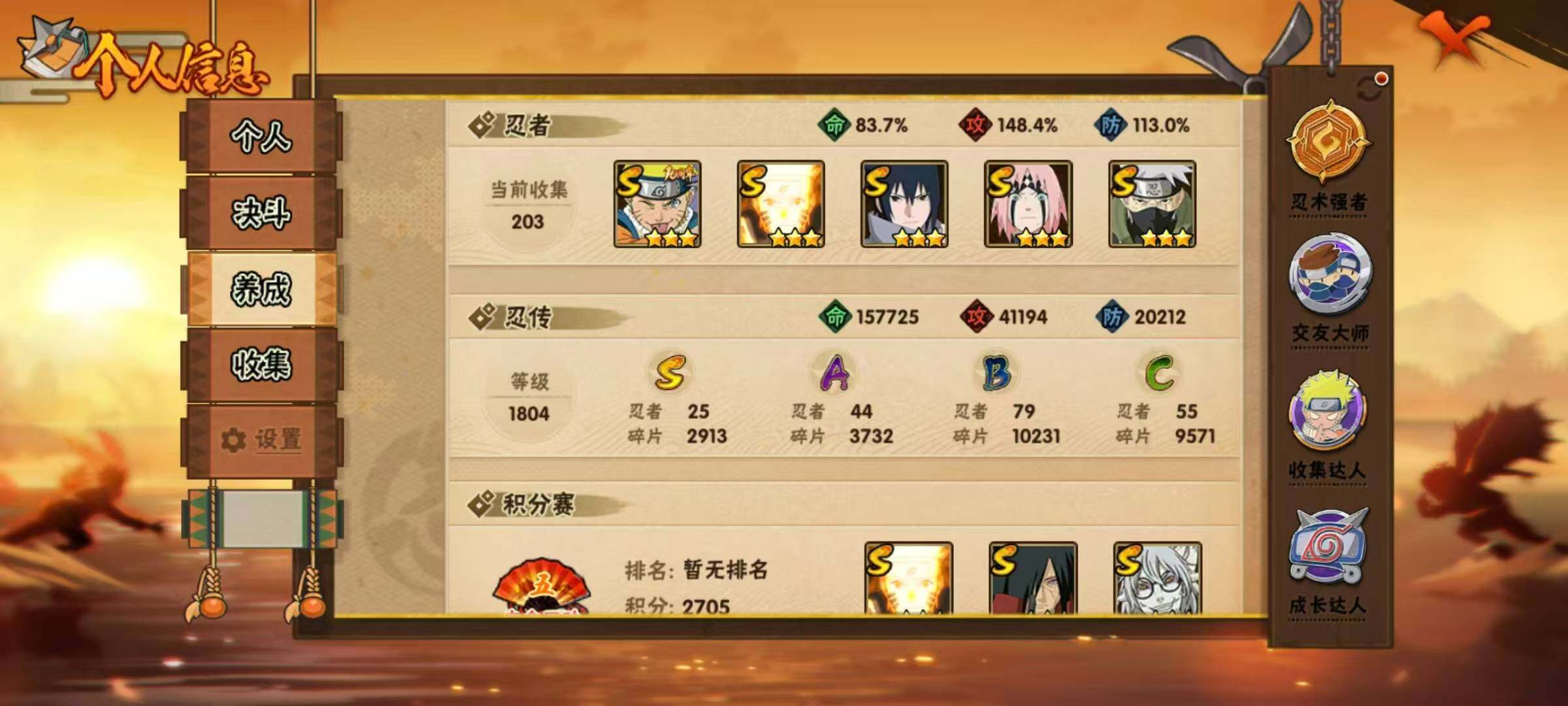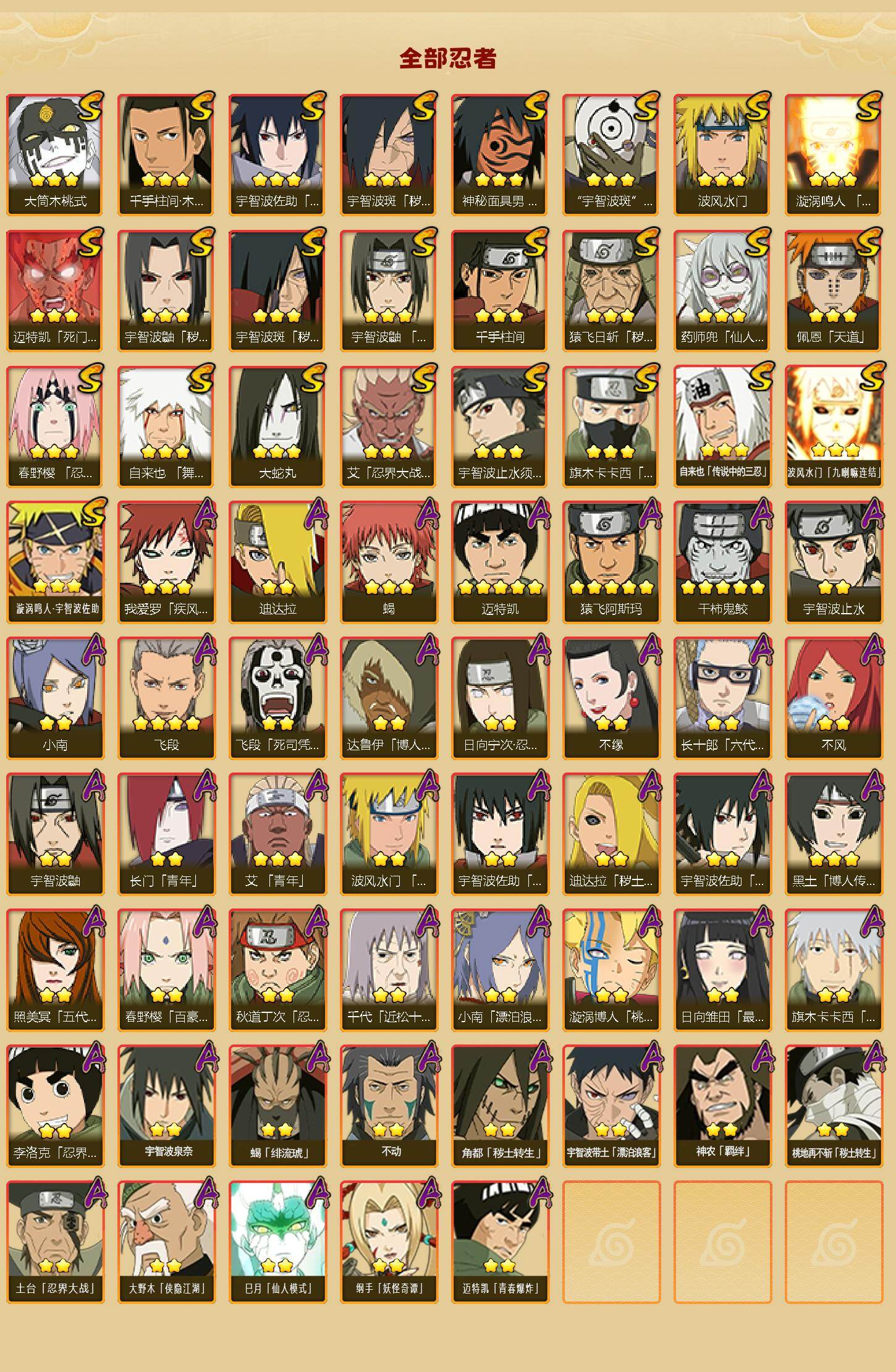 25S级忍者数-44A级忍者数【S级忍者】:猿飞日斩「秽土转生」(3星),宇智波鼬「秽土转生」(3星),宇智波斑「秽土转生」(3星),宇智波斑「秽土转生·解」(3星),春野樱「忍界大战」(3星),艾「忍界大战」(3星),宇智波鼬「须佐能乎」(3星),宇智波止水「须佐能乎」(3星),旗木卡卡西「须佐能乎」(3星),千手柱间「木叶创立」(3星),自来也「舞之豪杰」(3星),大蛇丸(3星),自来也「传说中的三忍」(3星),千手柱间(3星),波风水门(3星),药师兜「仙人模式」(3星),神秘面具男「红夜