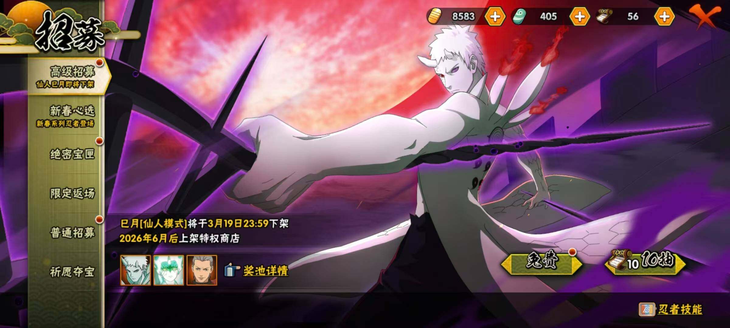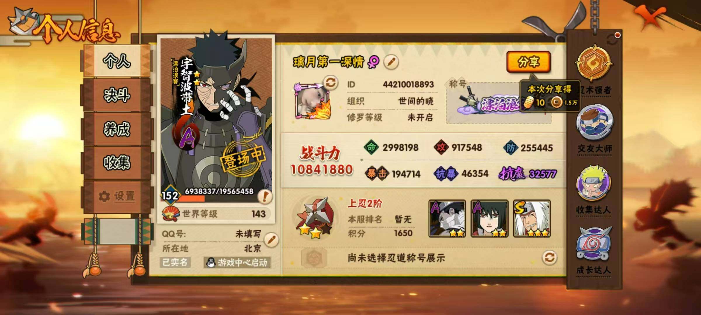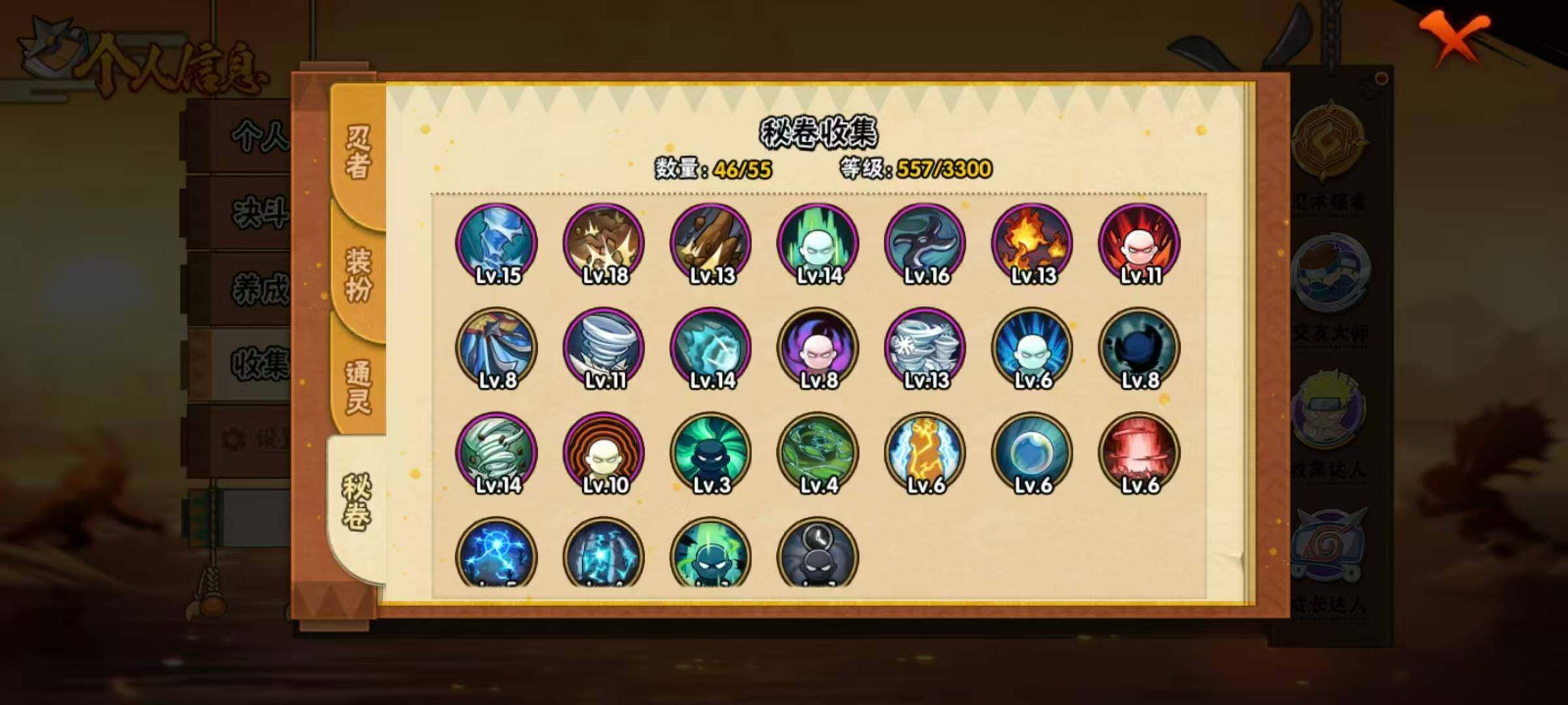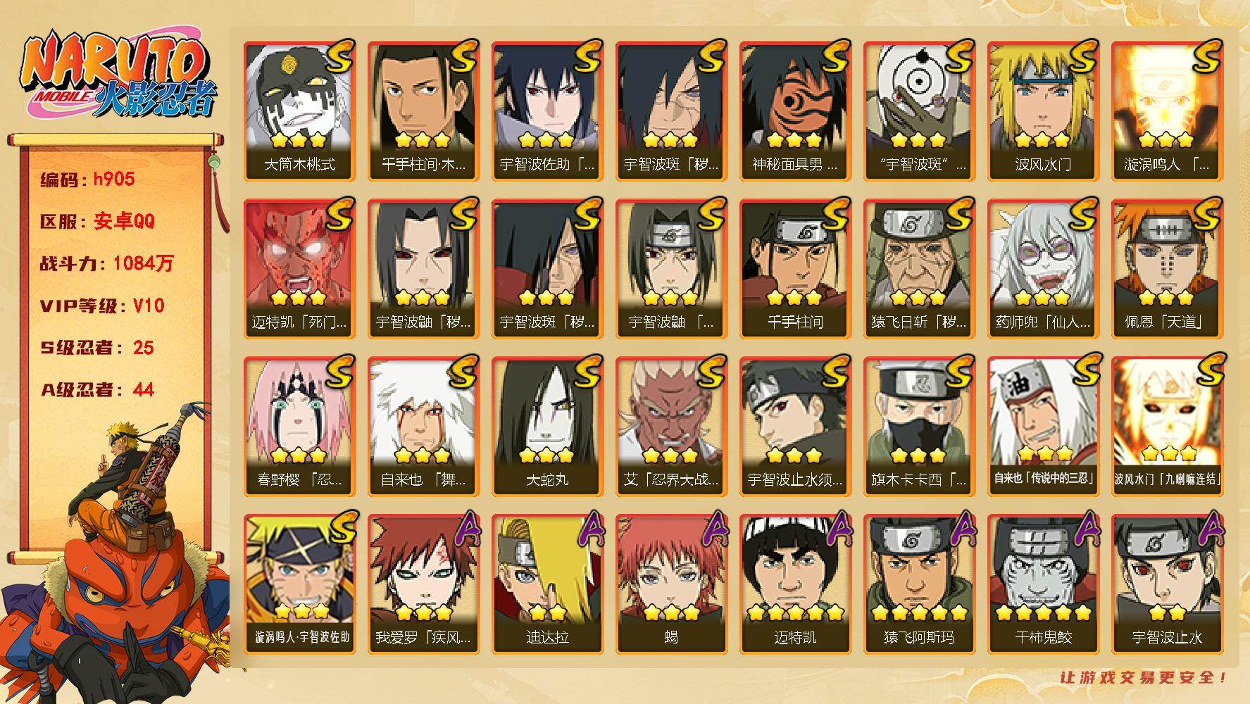 25S级忍者数-44A级忍者数【S级忍者】:猿飞日斩「秽土转生」(3星),宇智波鼬「秽土转生」(3星),宇智波斑「秽土转生」(3星),宇智波斑「秽土转生·解」(3星),春野樱「忍界大战」(3星),艾「忍界大战」(3星),宇智波鼬「须佐能乎」(3星),宇智波止水「须佐能乎」(3星),旗木卡卡西「须佐能乎」(3星),千手柱间「木叶创立」(3星),自来也「舞之豪杰」(3星),大蛇丸(3星),自来也「传说中的三忍」(3星),千手柱间(3星),波风水门(3星),药师兜「仙人模式」(3星),神秘面具男「红夜