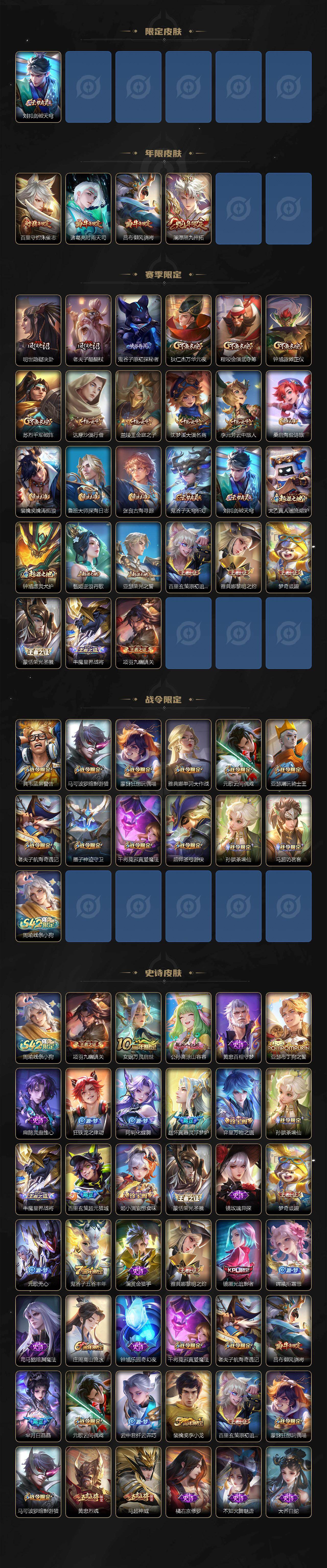 【传说皮肤】:澜愿照九州拓,裴擒虎祥瑞亨通,澜逐花归海,诸葛亮时雨天司,镜炽阳神光,虞姬启明星使,关羽武圣,曜云鹰飞将,李信一念神魔,干将莫邪久胜战神