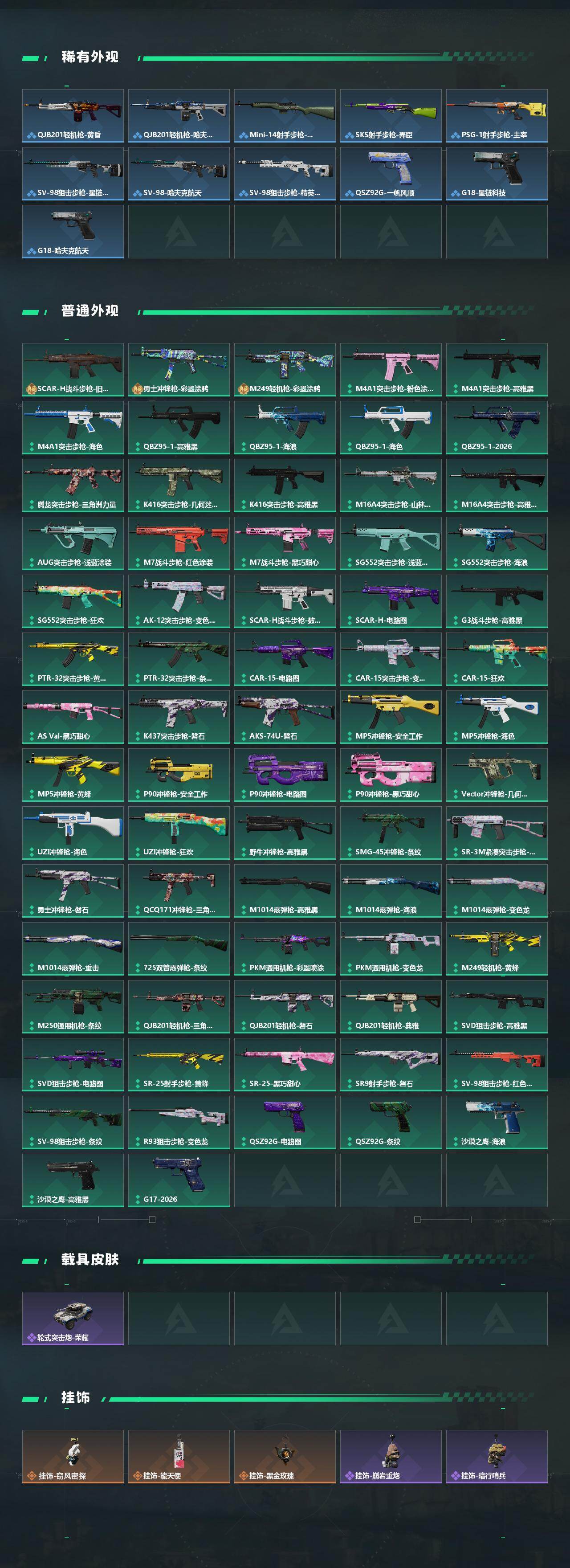 【传说外观】:M4A1突击步枪-蚀金玫瑰,M4A1突击步枪-阿米娅,K416突击步枪-行动记录,AUG突击步枪-悠然茶歇,SG552突击步枪-运动员,AK-12突击步枪-特斯拉线圈,SCAR-H战斗步枪-启航,腾龙突击步枪-捞点薯条,KC17突击步枪-电锯惊魂,MK47突击步枪-悠然茶歇