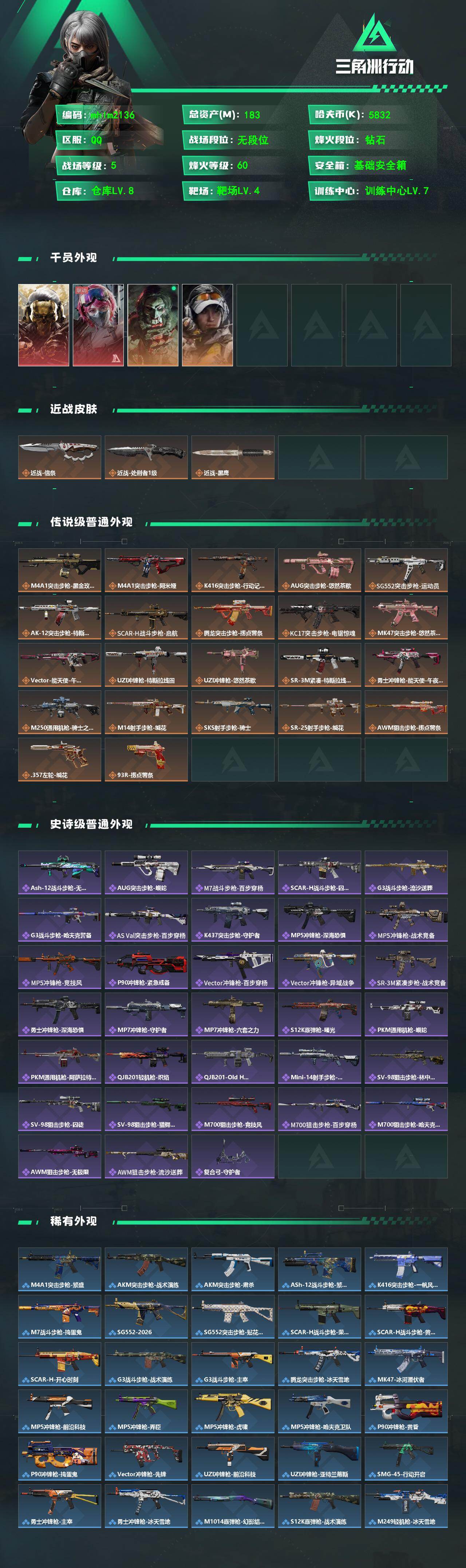 183m总资产-5832k哈夫币-60烽火等级-钻石-5战场等级-无军衔