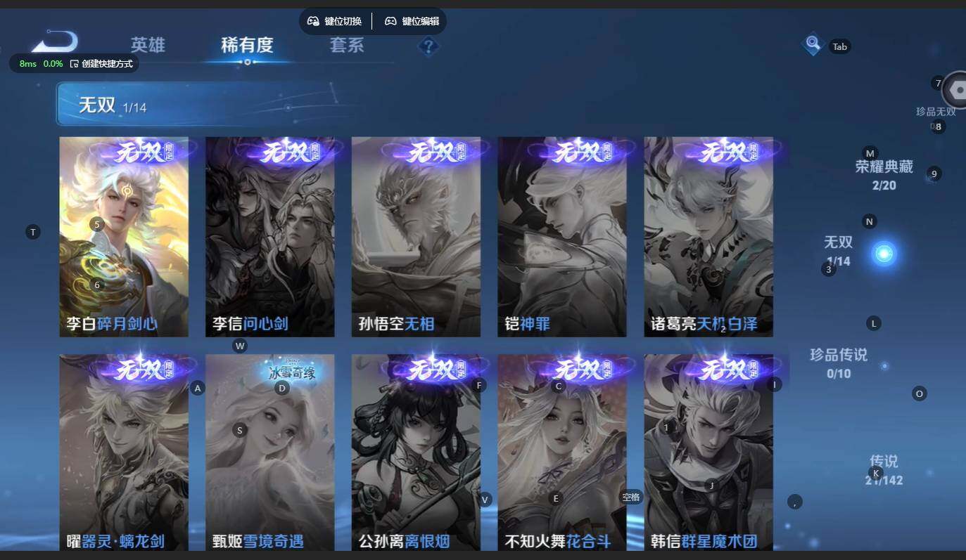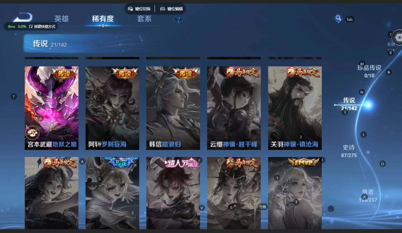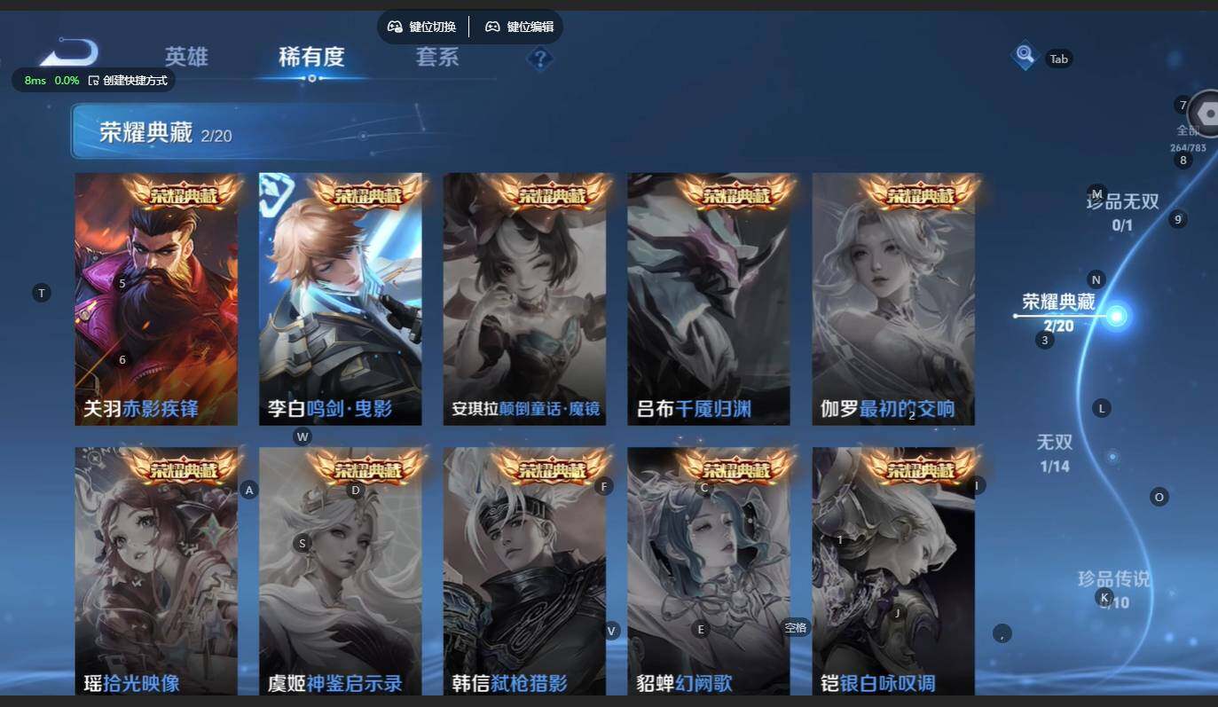V8-最强王者段位-128英雄-264皮肤-2典藏皮肤-1无双-21传说-86史诗