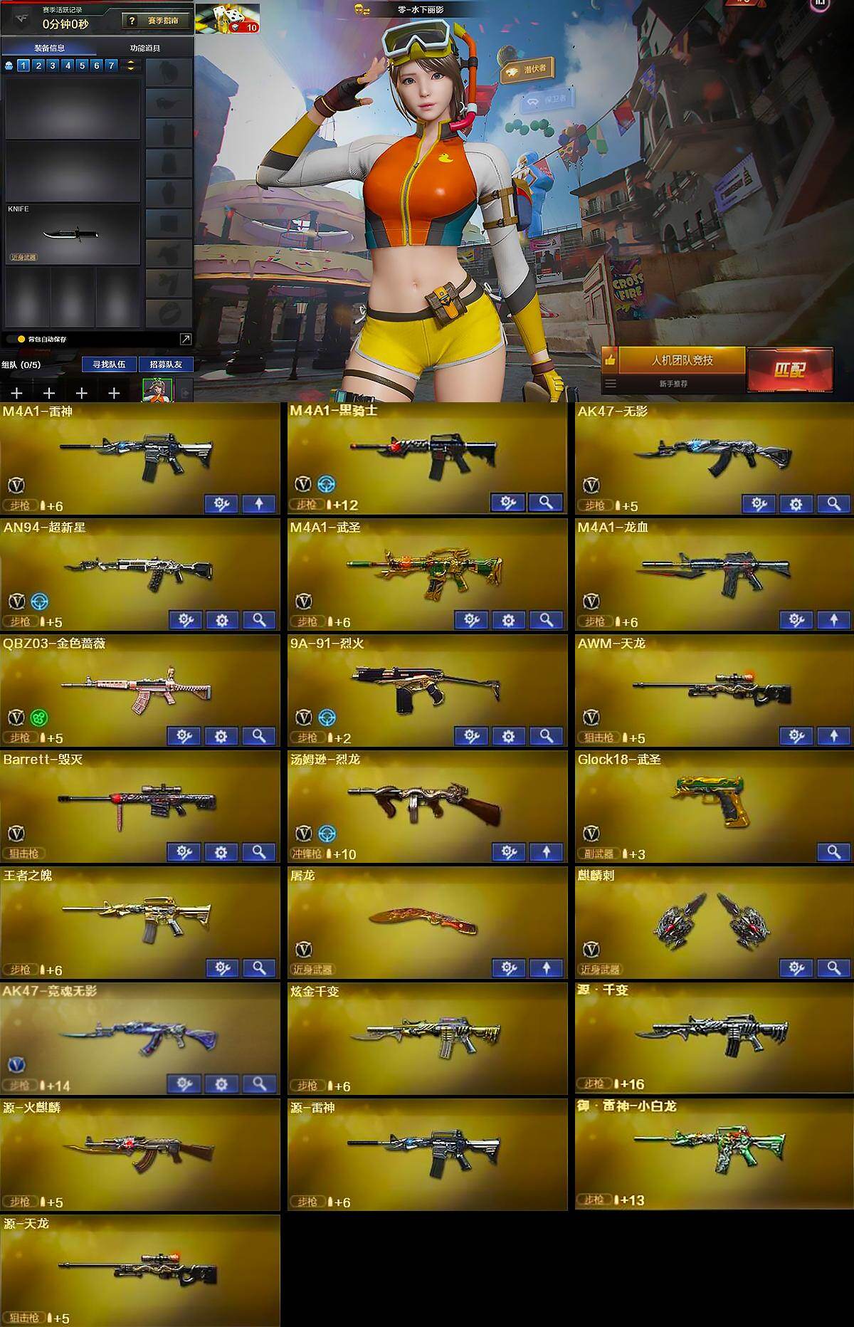 【英雄级武器】:M4A1-雷神,M4A1-黑骑士,AK47-无影,AN94-超新星,M4A1-武圣,M4A1-龙血,QBZ03-金色蔷薇,9A91-烈火,AWM-天龙,B