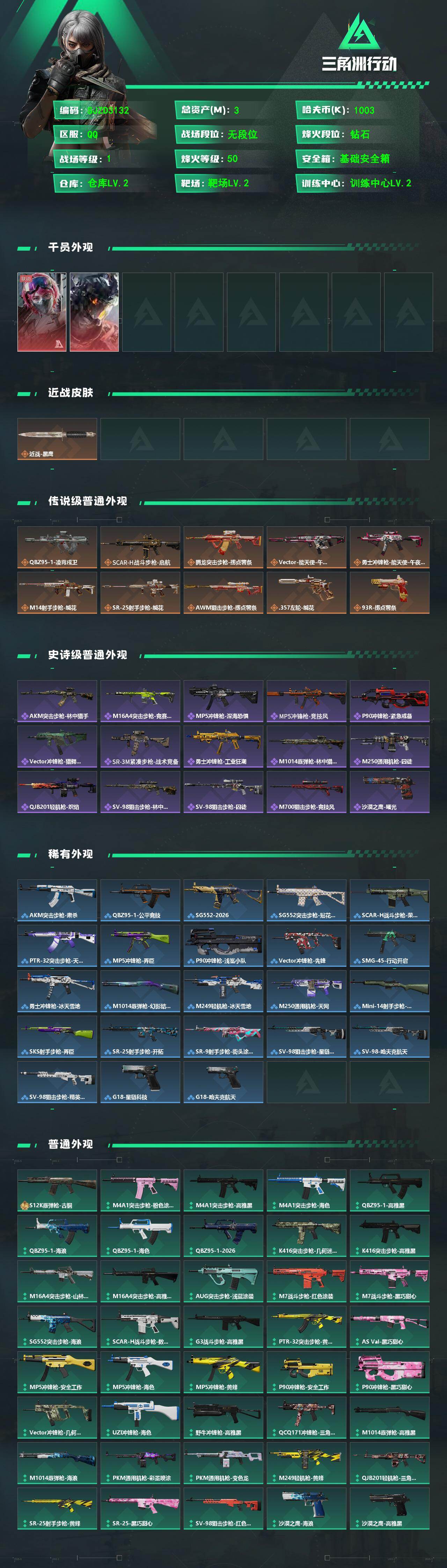 【SJZD3132】总资产(M):3M/哈夫币(K):1003K/哈夫币(K):1003K/传说枪皮数:10/全面战场等级:1_段位:无段位/烽火地带等级:50_段位:钻石/蛊-能天使午夜邮差/威龙-凌霄戍卫/近战-黑鹰/QBZ95-1突击步枪-凌霄戍卫/SCAR-H战斗步枪-启航/腾龙突击步枪-捞点薯条/Vector冲锋枪-能天使-午夜邮差/勇士冲锋枪-能天使-午夜邮差/M14射手步枪-缄花/SR-25射手步枪-缄花/AWM狙击步枪-捞点薯条/.357左轮-缄花/93R-捞点薯条/AKM突击步