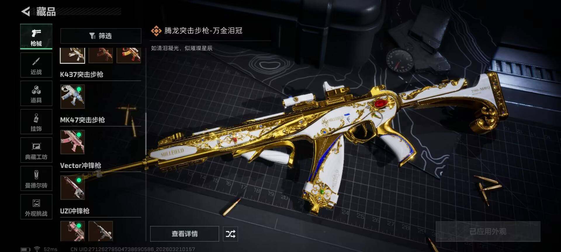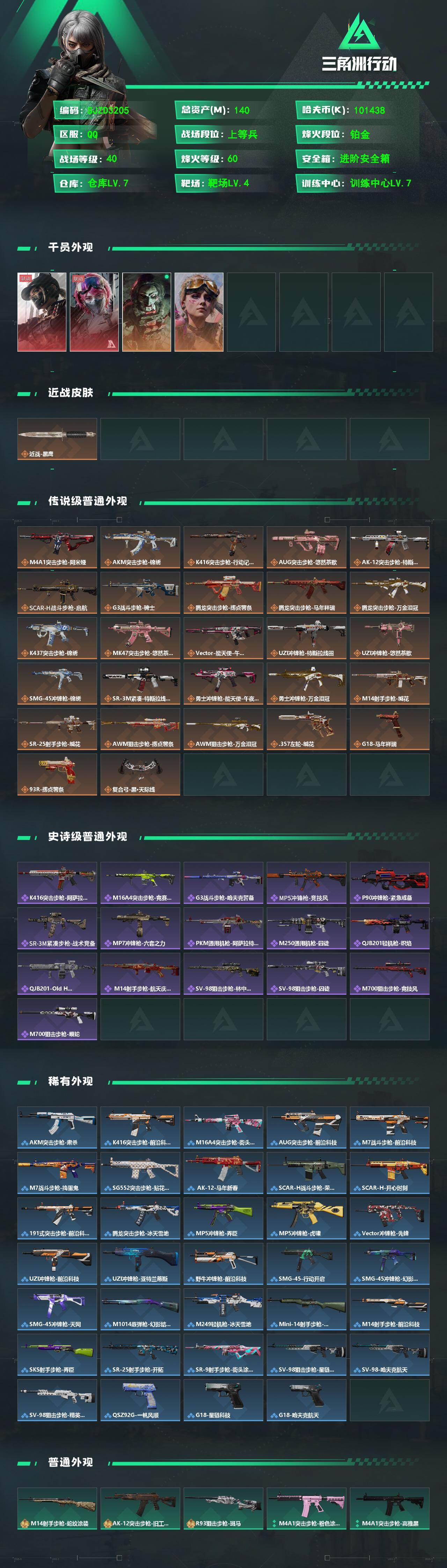 【SJZD3205】总资产(M):140M/哈夫币(K):101438K/哈夫币(K):101438K/传说枪皮数:27/全面战场等级:40_段位:上等兵/烽火地带等级:60_段位:铂金/露娜-黑·天际线/蛊-能天使午夜邮差/红狼-电锯惊魂/蛊-不羁人生/近战-黑鹰/M4A1突击步枪-阿米娅/AKM突击步枪-锦绣/K416突击步枪-行动记录/AUG突击步枪-悠然茶歇/AK-12突击步枪-特斯拉线圈/SCAR-H战斗步枪-启航/G3战斗步枪-骑士/腾龙突击步枪-捞点薯条/腾龙突击步枪-马年祥瑞/腾