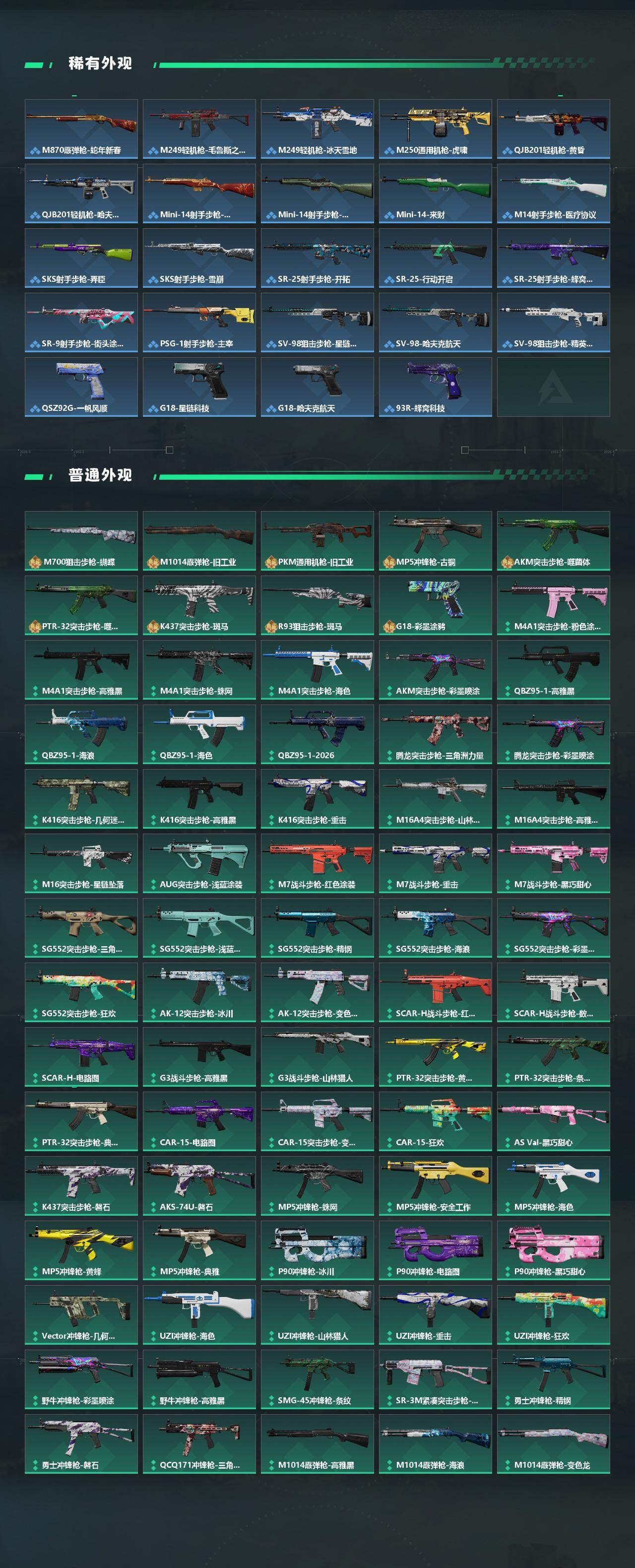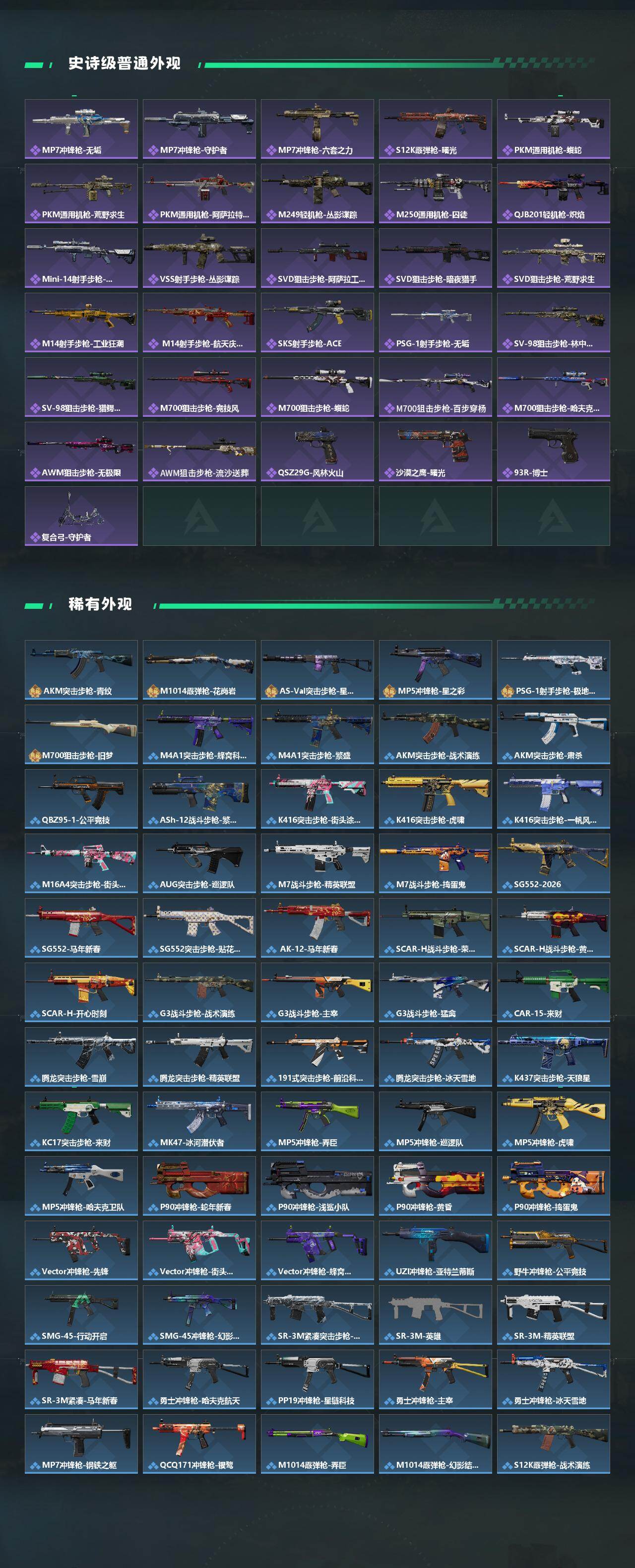 【传说外观】:M4A1突击步枪-阿米娅,AKM突击步枪-锦绣,K416突击步枪-行动记录,AUG突击步枪-悠然茶歇,M7战斗步枪-怜悯,SG552突击步枪-运动员,AK-12突击步枪-特斯拉线圈,SC