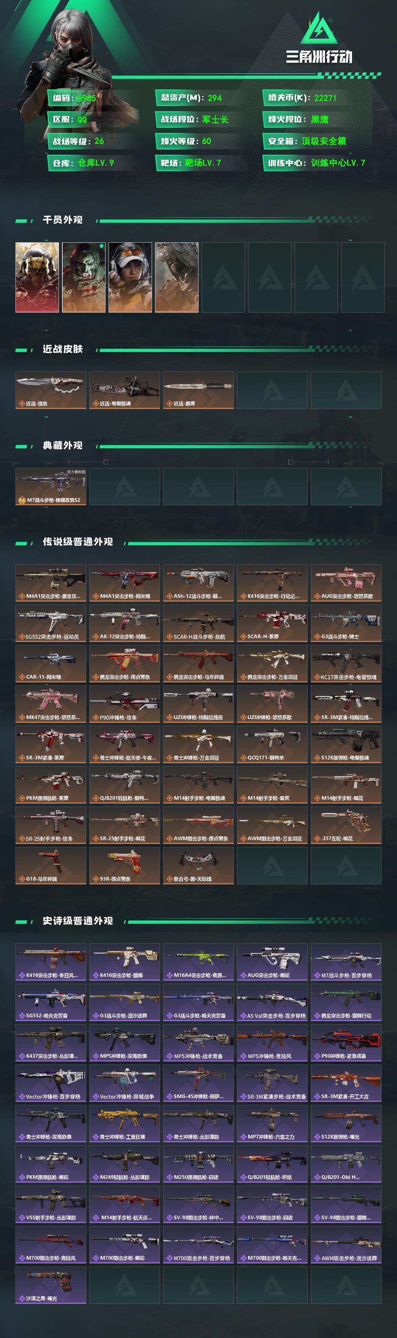 等级:60总资产294.9m 纯币22271k s8赛季 3*3 人物皮 饰金玫瑰 枪皮 优品s m7 刀皮 信条 电锯 特勤仓库9级 体力负重满级