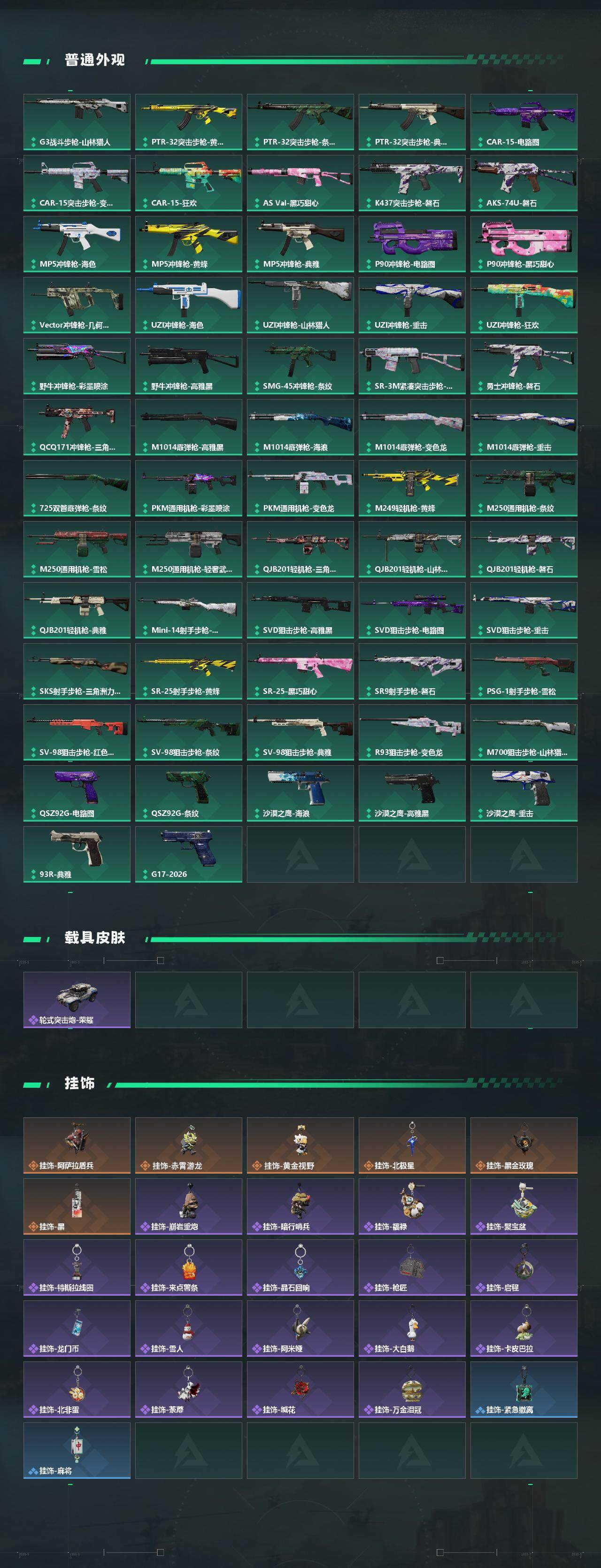 【传说外观】:M4A1突击步枪-蚀金玫瑰,M4A1突击步枪-阿米娅,ASh-12战斗步枪-鹅鸭杀,K416突击步枪-行