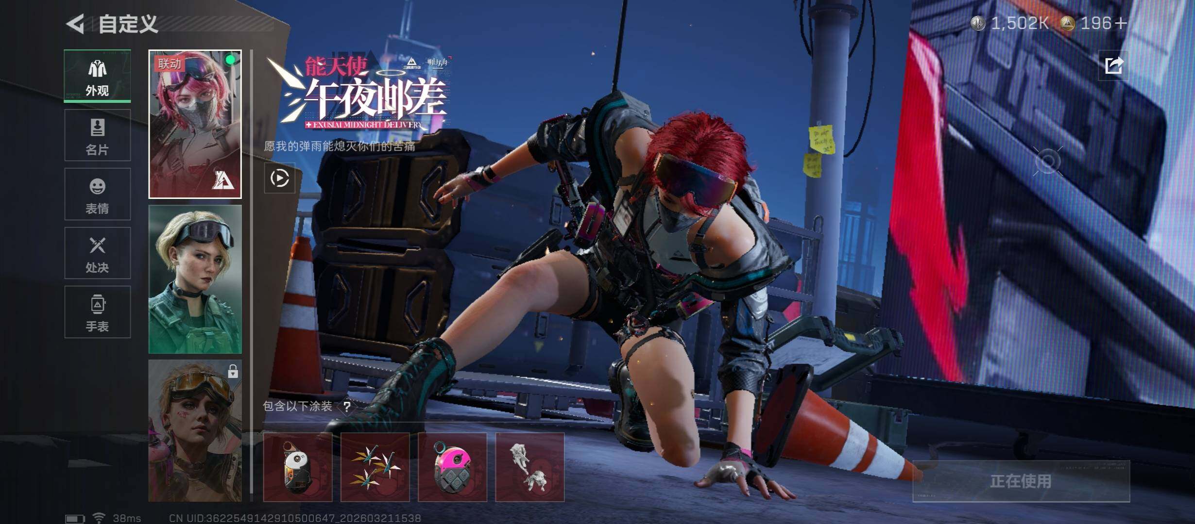 【干员外观】:蛊-能天使午夜邮差,威龙-凌霄戍卫,深蓝-不破誓约,红狼-电锯惊魂,露娜-金牌射手,乌鲁鲁-荒原猎手