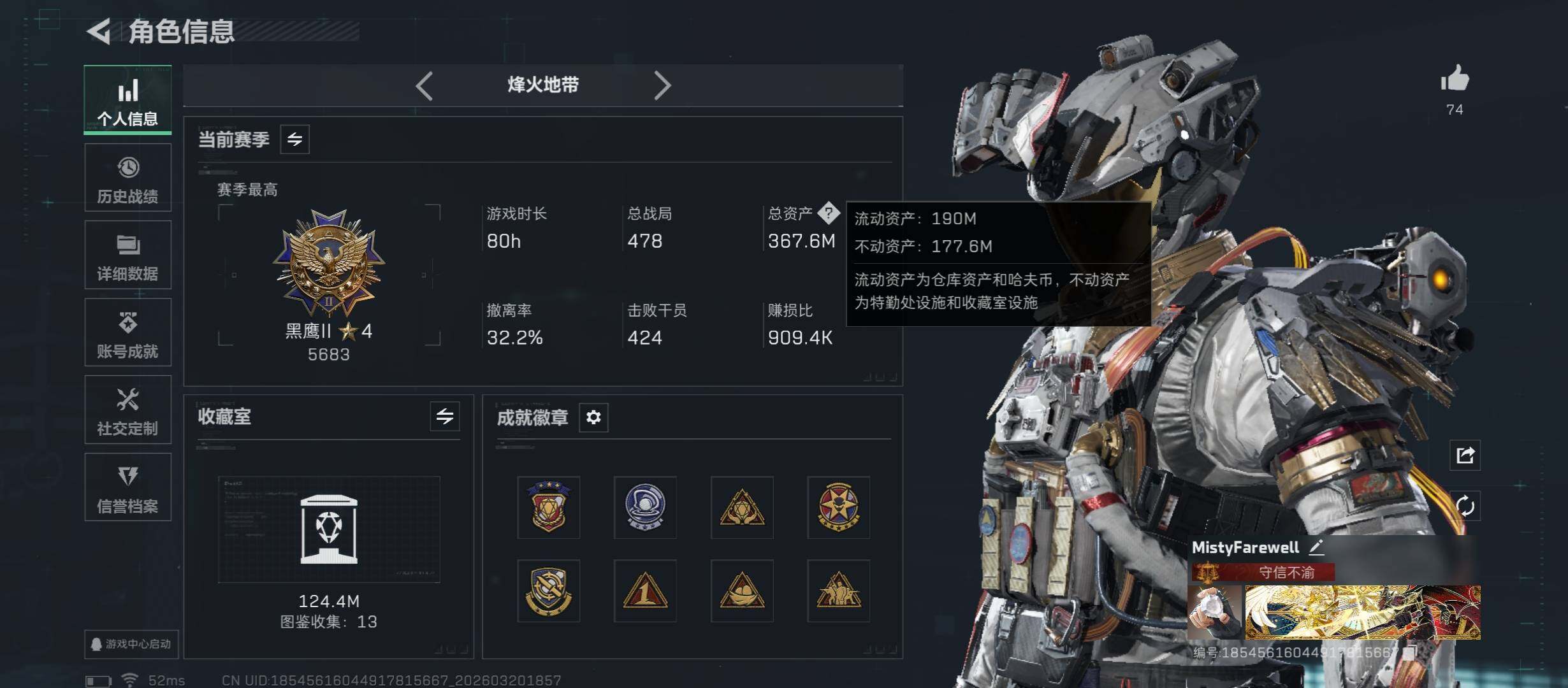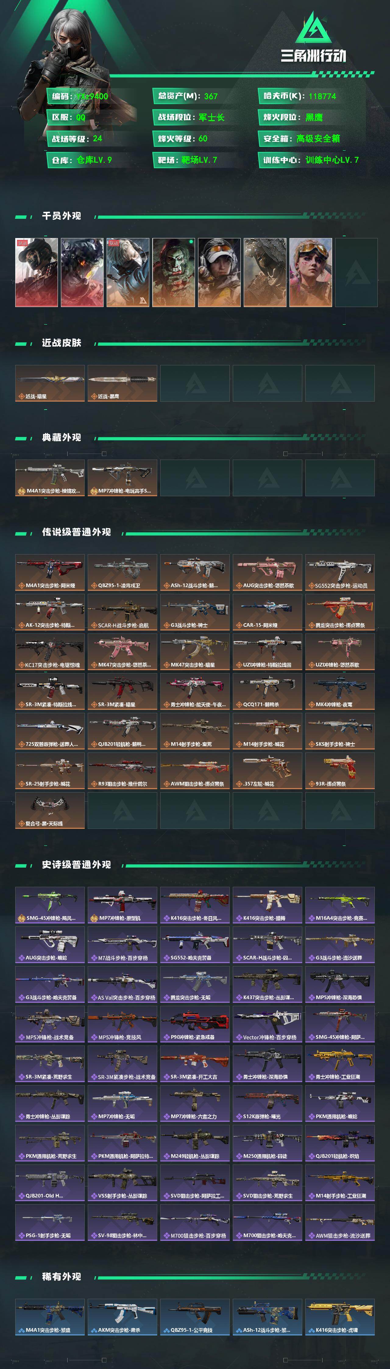 【热门皮肤组合搭配:双红皮+单刀皮+双典藏枪皮.高额资产367M+纯现金118M】【凌霄戍卫+黑天际线+暗星+M4A1突击步枪-棱镜攻势(优品B),MP7冲锋枪-电玩高手S2(优品A)】【Q区三端互通】【无二次】YXz9400-特勤处:仓库9级/靶场7级/训练中心7级-总资产367m-哈夫币118m-烽火等级:60级