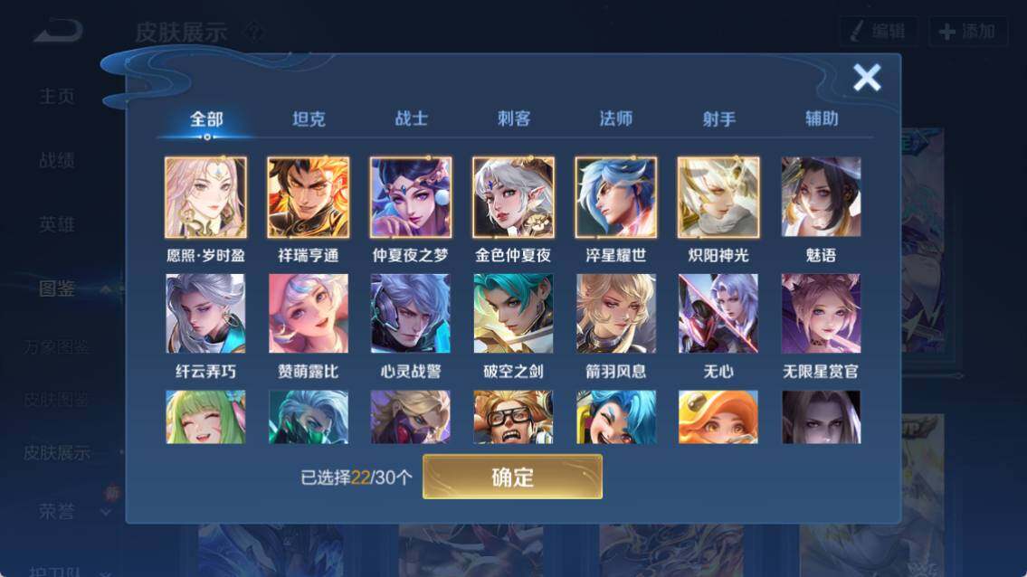 【传说皮肤】:后羿神树通天,司空震愿照山河定,女娲愿照千秋盛,妲己愿照众生和,澜愿照九州拓,蔡文姬愿照福禄聚,虞姬愿照岁时盈