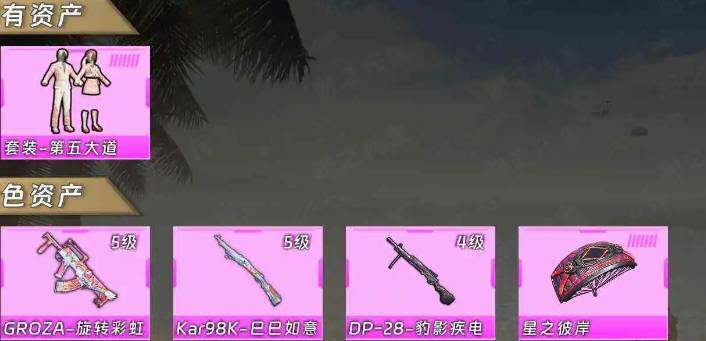 【粉色枪皮等级】:GROZA-旋转彩虹(五级),Kar98K-巳巳如意(五级),DP-28-豹影疾电(四级)