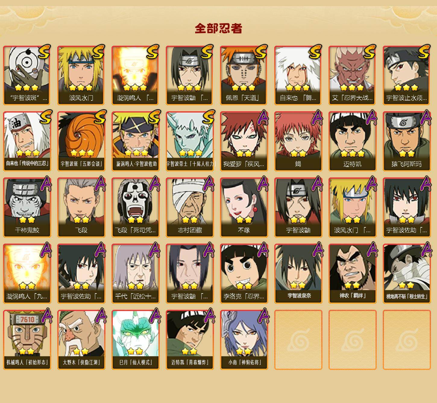 【HYYT395】V8/S忍12/A忍25/2星大野木「侠隐江湖」/疾风传-我爱罗/3星宇智波带土「十尾人柱力」/死司凭血-飞段/宇智波鼬/2星小南「神驹佑将」/蝎/天道-佩恩/3星漩涡鸣人·宇智波佐助/波风水门/九喇嘛连结-漩涡鸣人/忍界大战-李洛克/青年-波风水门/舞之豪杰-自来也/2星桃地再不斩「秽土转生」/白面具-宇智波斑/3星自来也「传说中的三忍」/须佐能乎-宇智波止水/飞段/2星神农「羁绊」/猿飞阿斯玛/夏日限定-宇智波鼬/万花筒写轮眼-宇智波佐助/志村团藏/2星宇智波泉奈/2星巳月