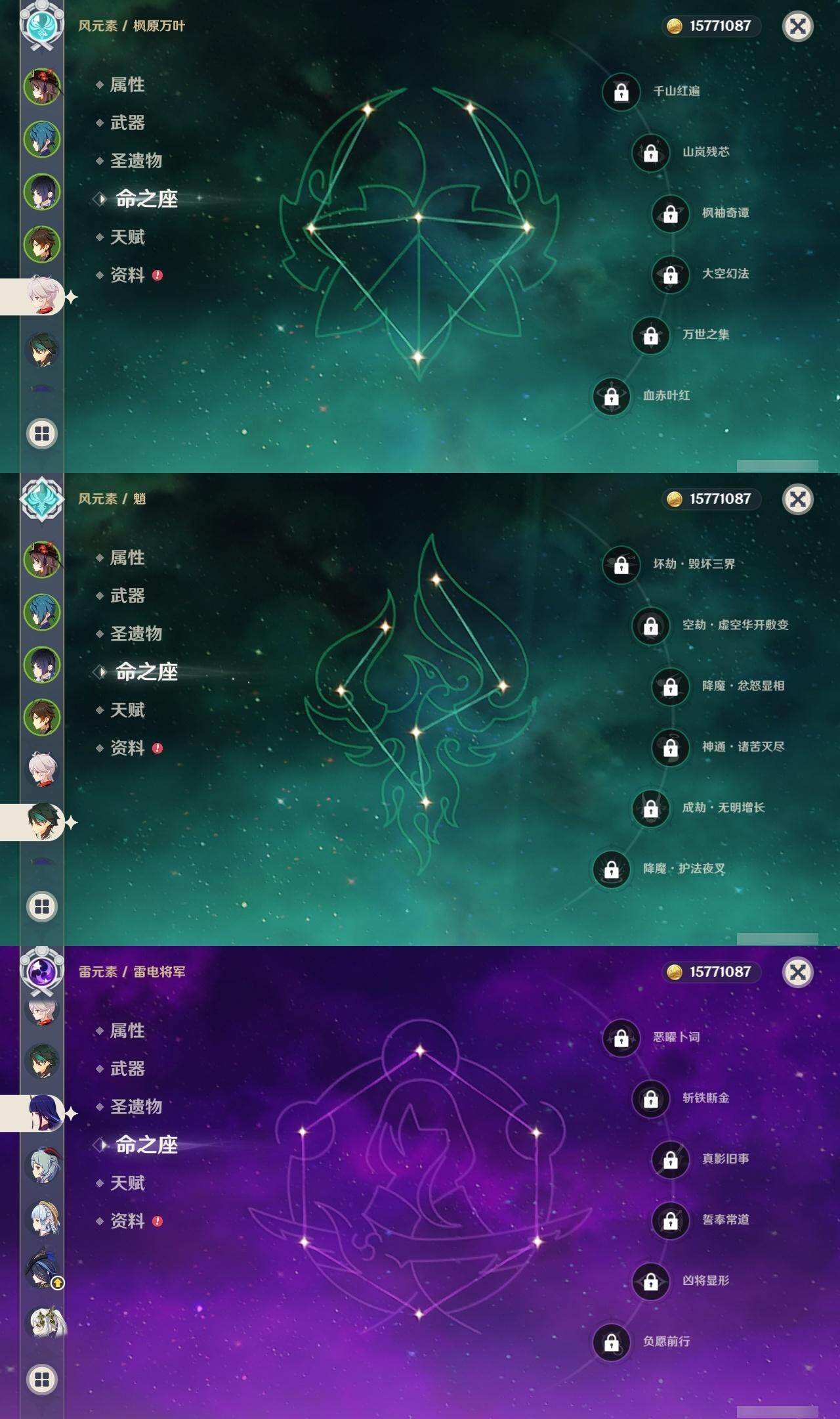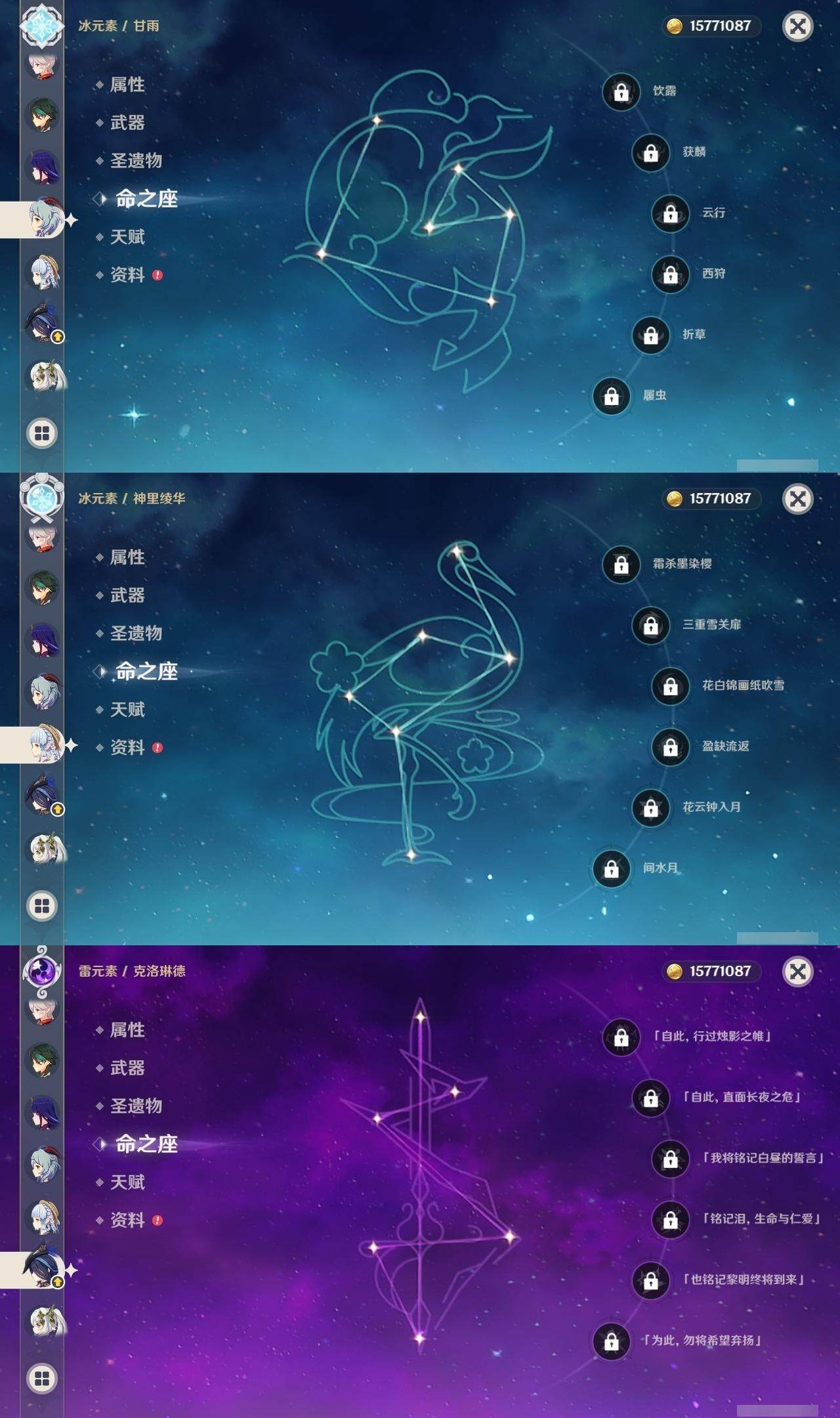 0命克洛琳德,0命迪希雅,0命纳西妲,0命提纳里,0命夜兰,0命申鹤,0命雷电将军,0命枫原万叶,0命神里绫华,0命钟离,0命胡桃,0命甘雨,0命魈,0命宵宫,0命温迪,0命达达利亚,0命刻晴,0命七七,1命琴,2命莫娜,3命迪卢克,0命希诺宁,精1万世流涌大典,精1赤沙之杖,精1四风原典,精1和璞鸢,精1天空之翼,精1阿莫斯之弓,精1天空之卷