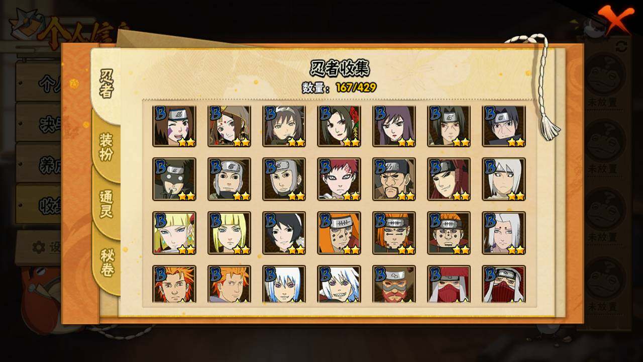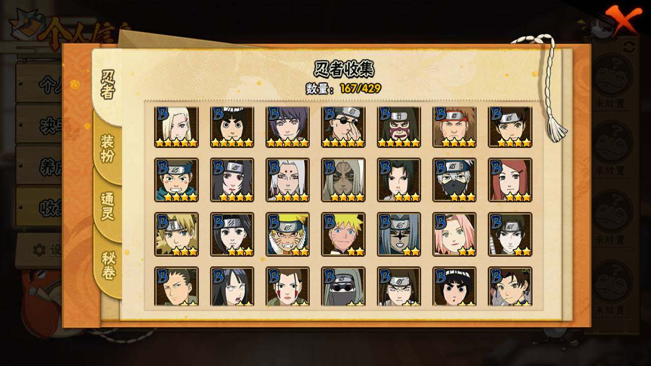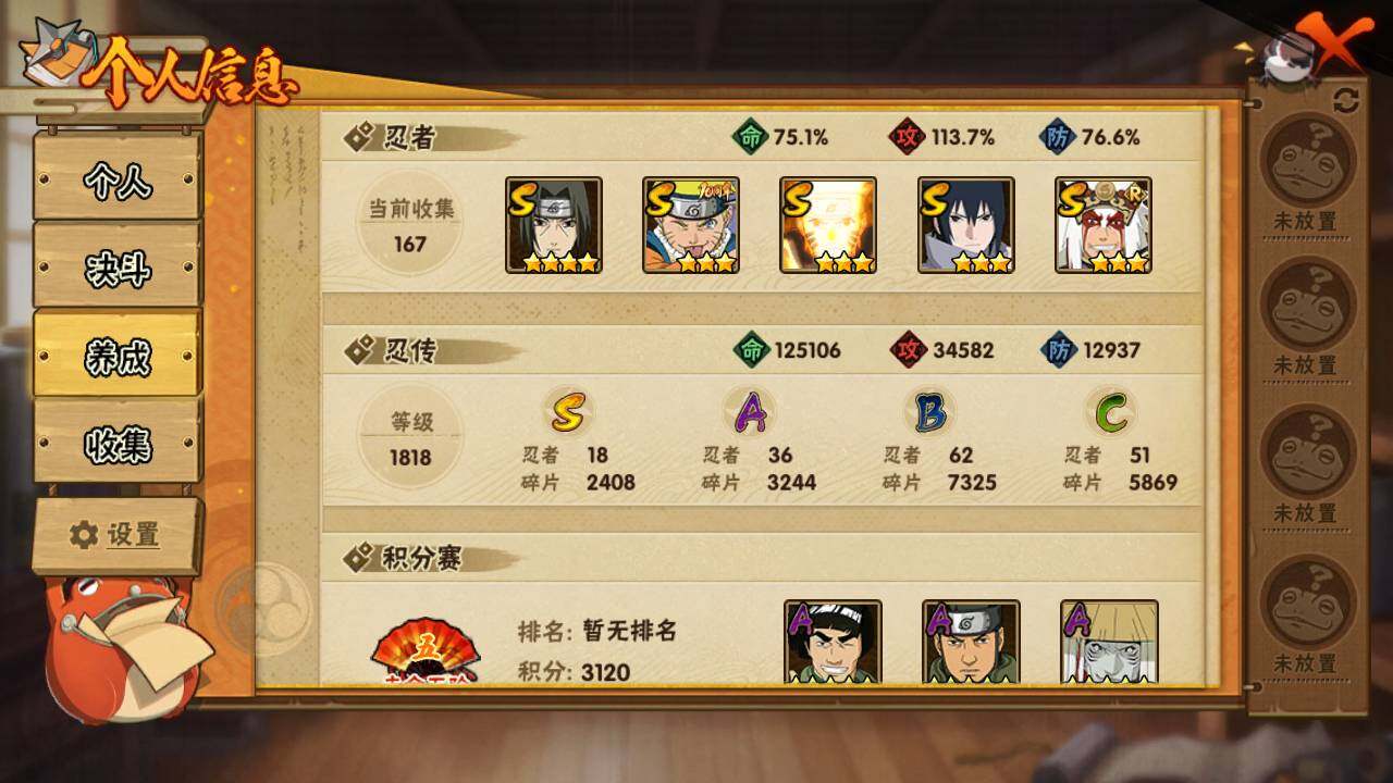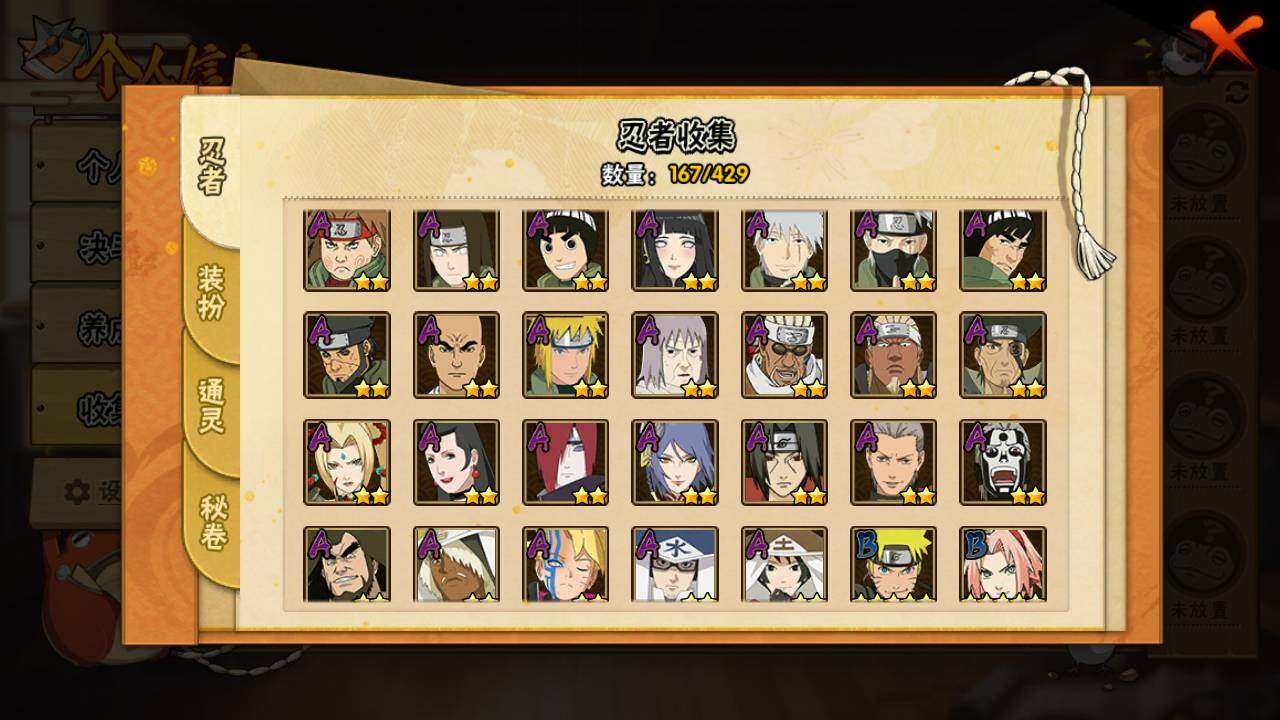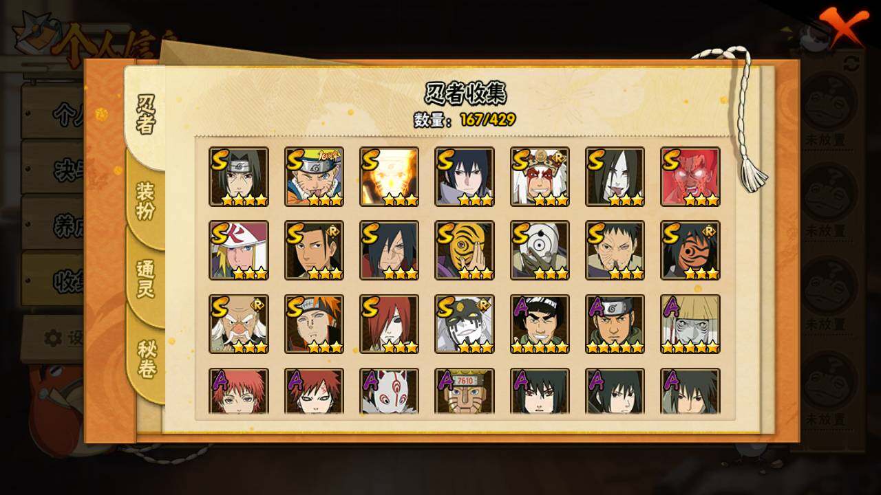 【S级忍者】:长门「秽土转生」(3星),宇智波斑「秽土转生·解」(3星),大野木「忍界大战」(3星),宇智波带土「忍界大战」(3星),宇智波鼬「须佐能乎」(4星),千手柱间「木叶创立」(3星),自来也「舞之豪杰」(3星),大蛇丸(3星),波风水门(3星),神秘面具男(3星),神秘面具