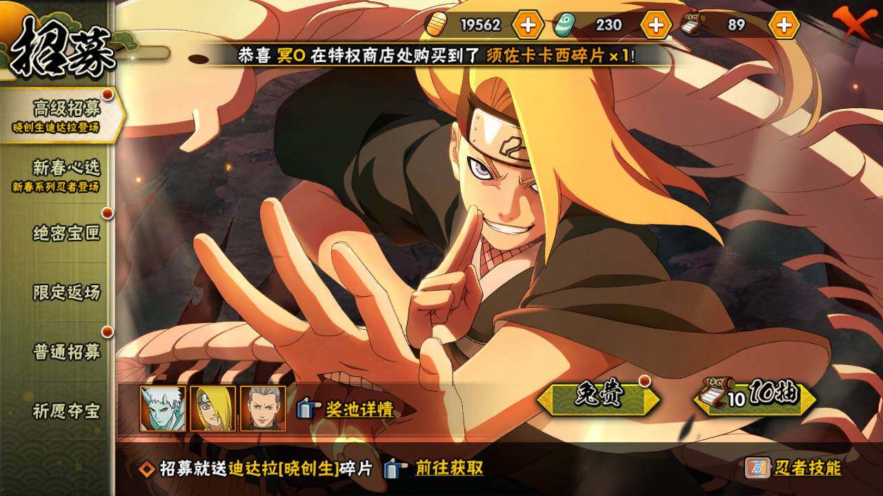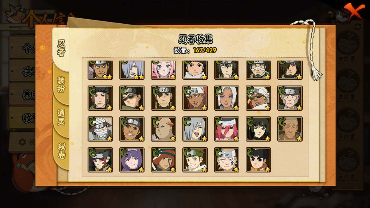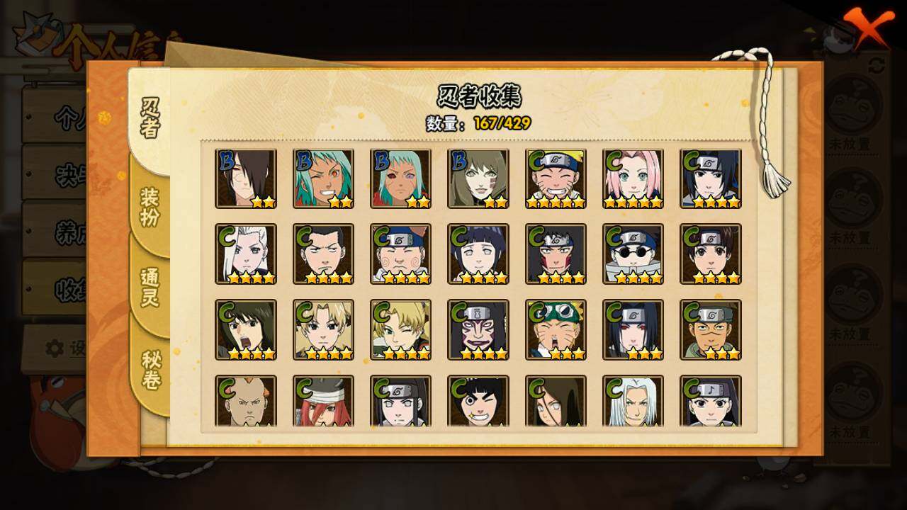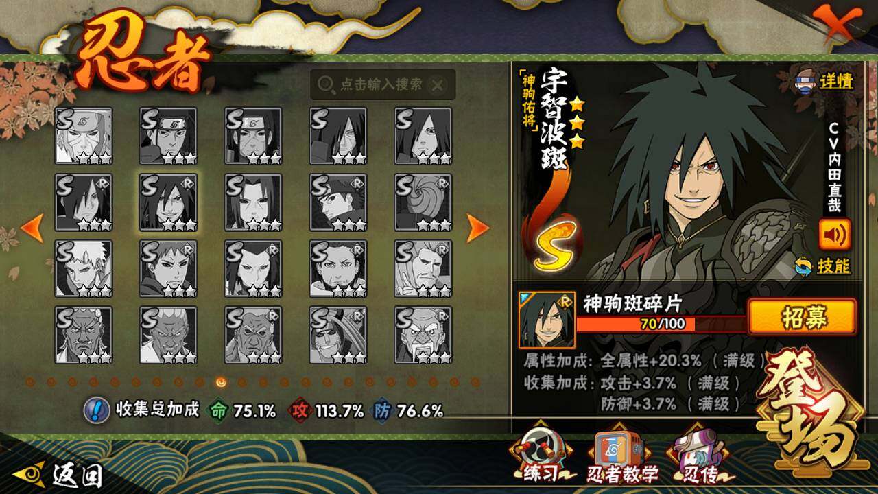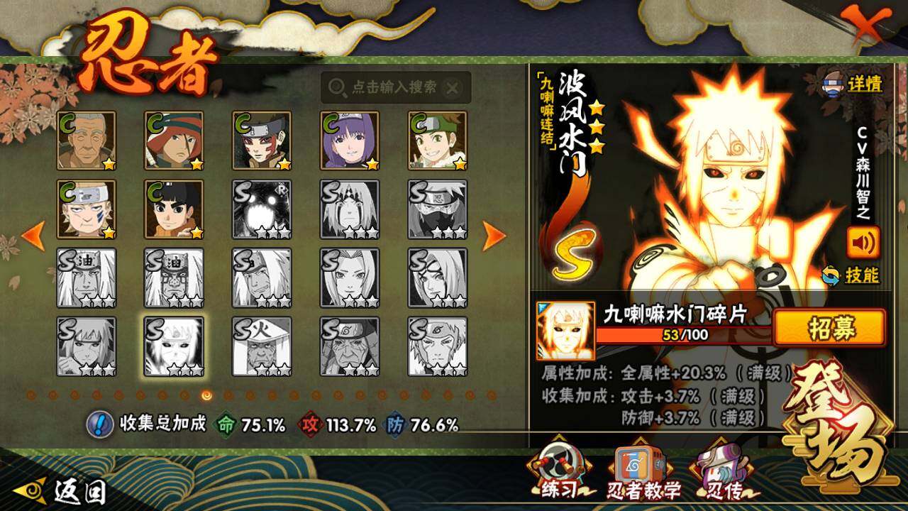 【S级忍者】:长门「秽土转生」(3星),宇智波斑「秽土转生·解」(3星),大野木「忍界大战」(3星),宇智波带土「忍界大战」(3星),宇智波鼬「须佐能乎」(4星),千手柱间「木叶创立」(3星),自来也「舞之豪杰」(3星),大蛇丸(3星),波风水门(3星),神秘面具男(3星),神秘面具