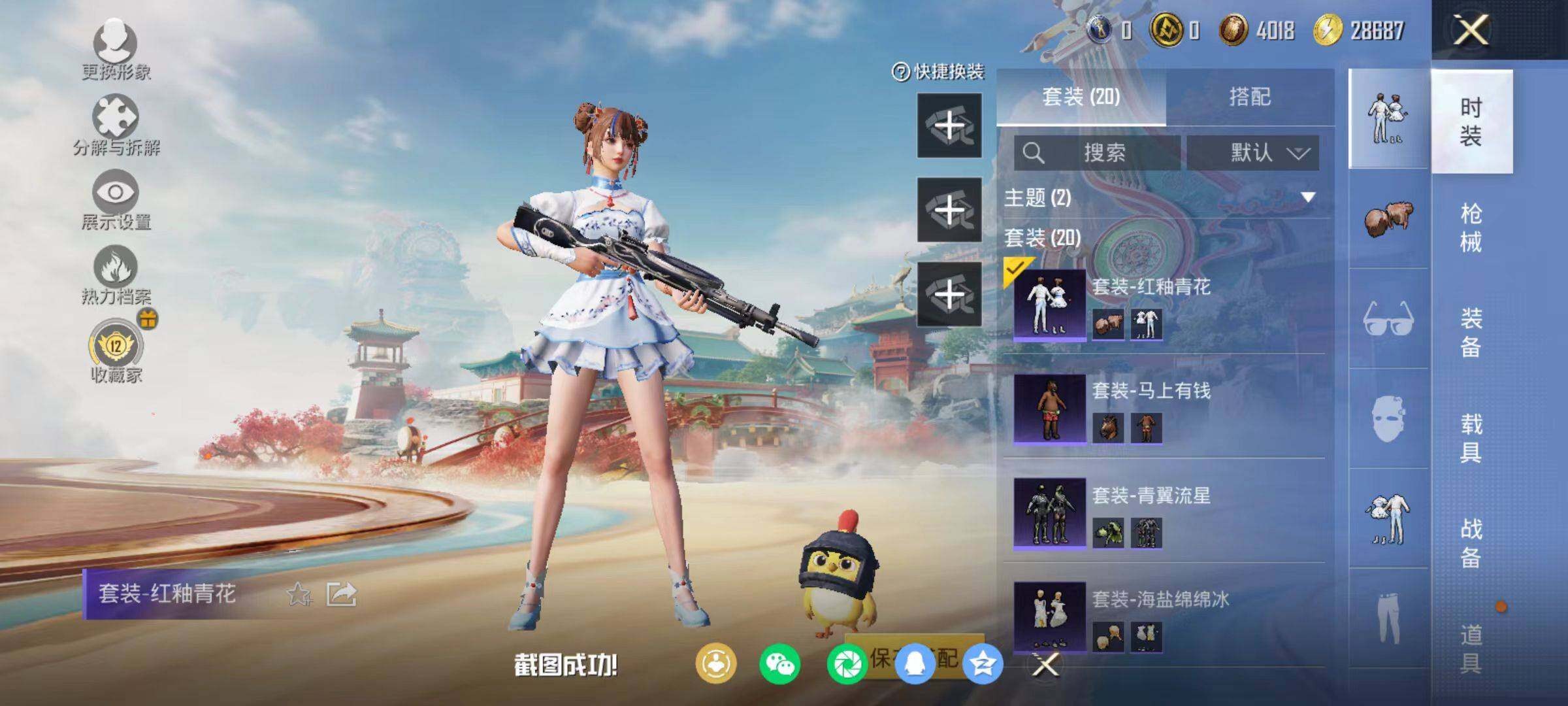 20套装/枪械2/装备31/战备22/热力值6227/一级Mk14-福马献瑞/一级DP-28-豹影疾电/套装-龟仙人/Mk14-福马献瑞/DP-28-豹影疾电/忍者神龟降落伞/虎痴许褚降落伞/龟仙人/套装-雪国风尚/套装-马上有钱/套装-红釉青花/AKM-影袭/SCAR-L-炫彩节奏/AUG-天降萌叽/QBZ-彩虹符号/蜜獾-天降萌叽/汤姆逊-像素花束/DP-28-彩虹符号/夏日倾情/橘黑制服/