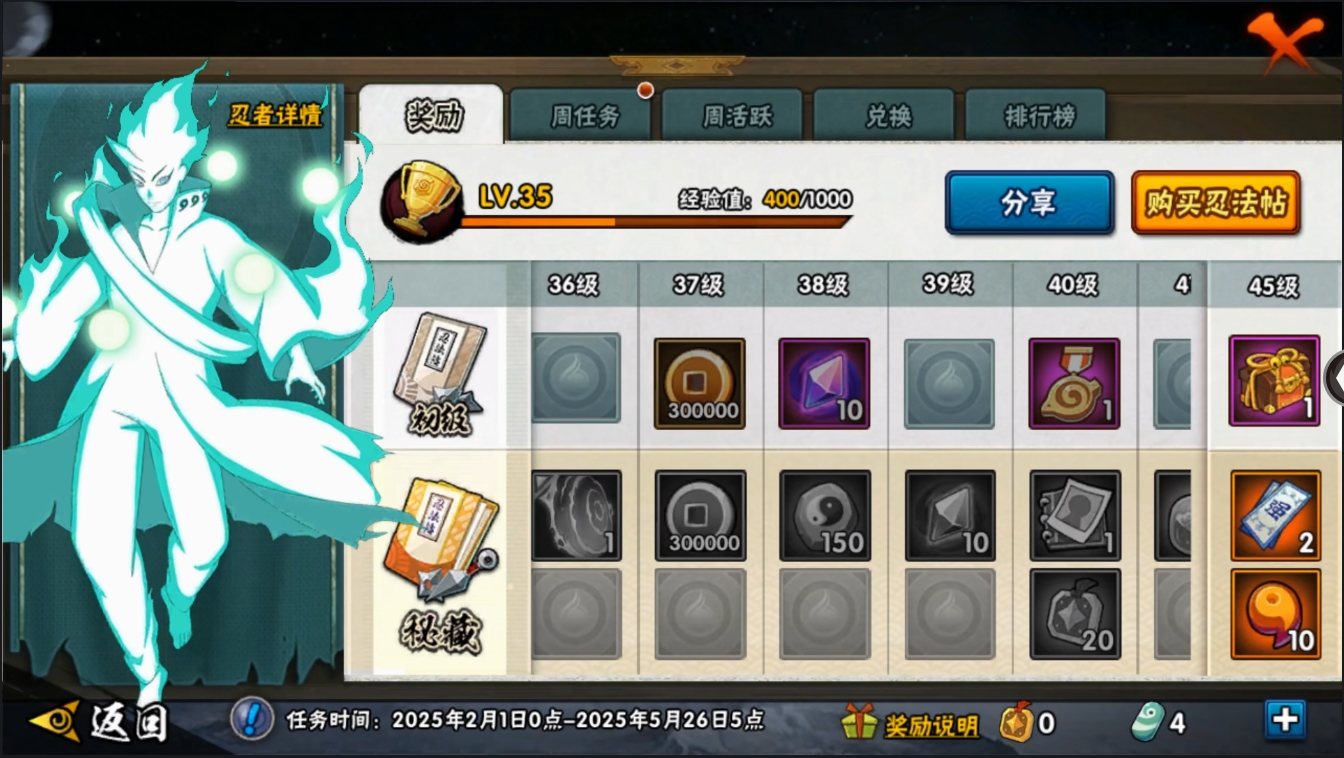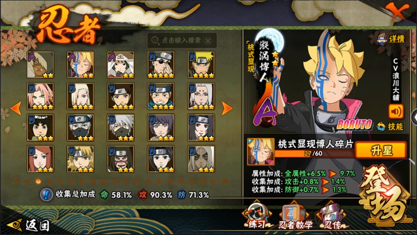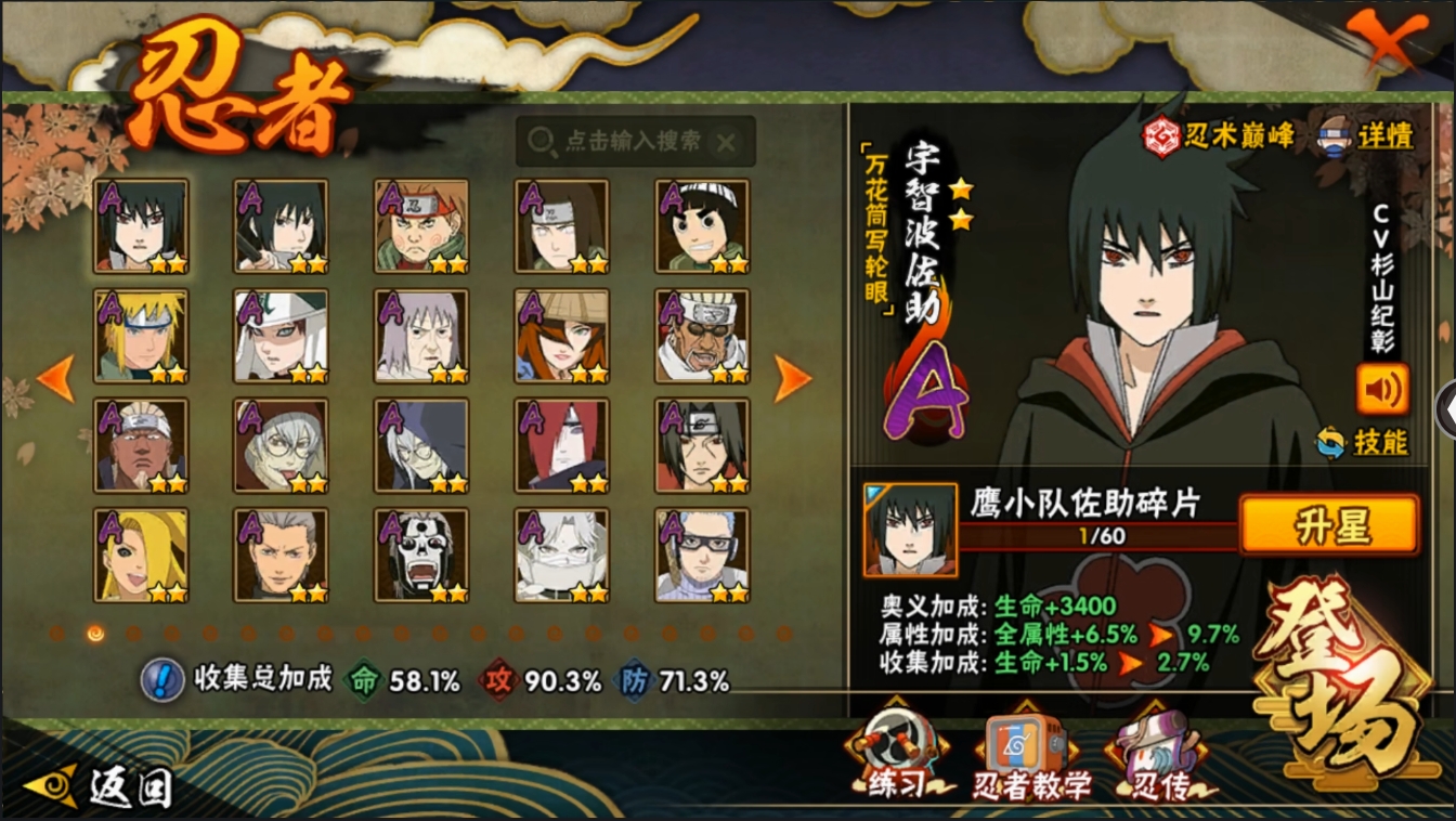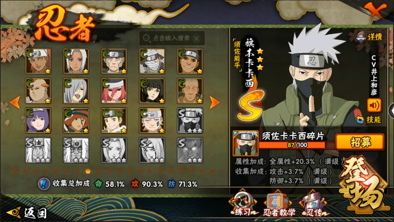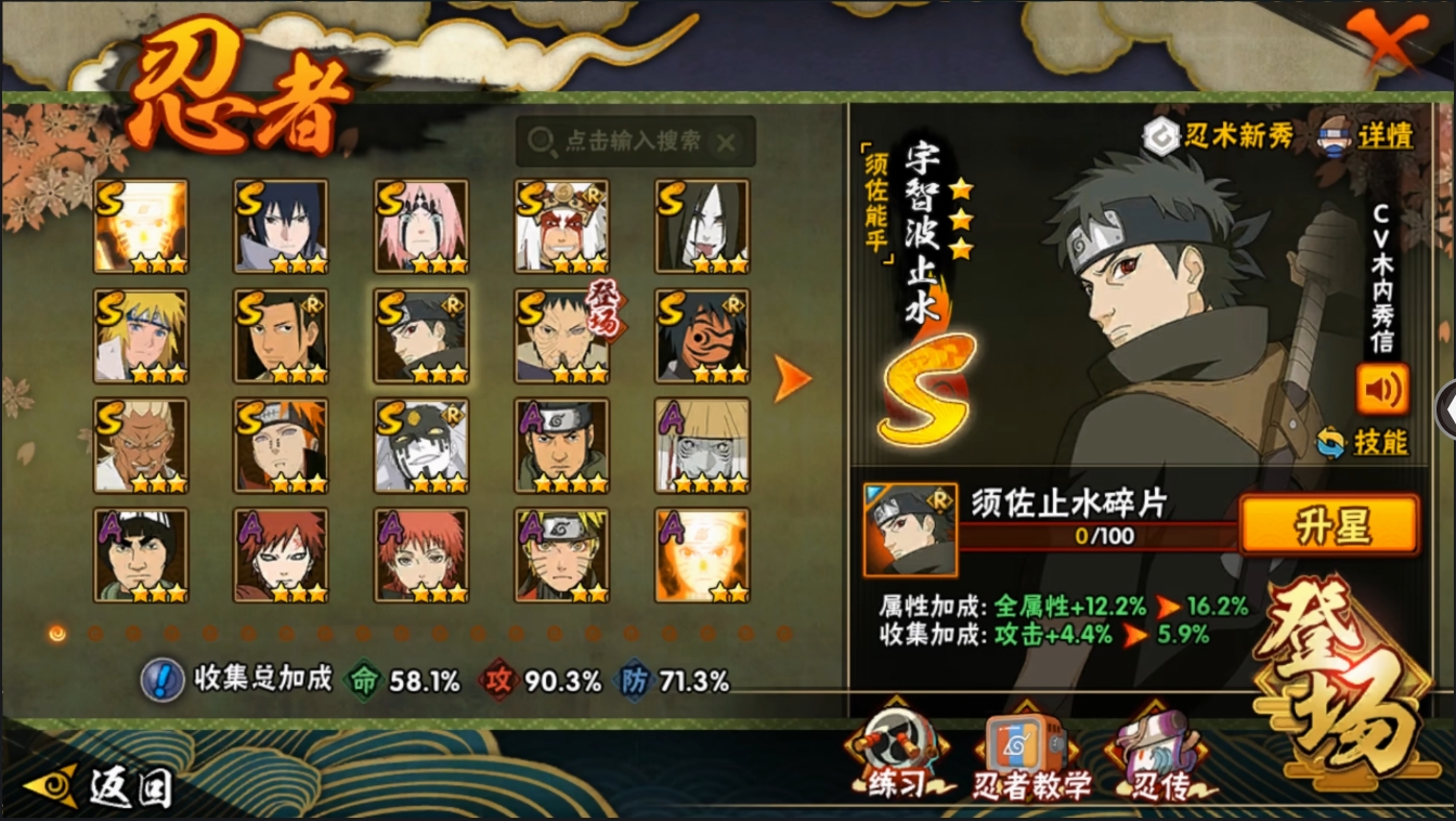 【编号63203可秒换绑】店长推荐特价处理精品号13S级忍者数-30A级忍者数【S级忍者】:春野樱「忍界大战」(3星),宇智波带土「忍界大战」(3星),艾「忍界大战」(3星),宇智波止水「须佐能乎」(3星),千手柱间「木叶创立」(3星),自来也「舞之豪杰」(3星),大蛇丸(3星),波风水门(3星),神秘面具男「红夜之刃」(3星),漩涡鸣人「九喇嘛连结」(3星),佩恩「天道」(3星),宇智波佐助「永恒万花筒」(3星),大筒木桃式(3星)【A级忍者】:艾「青年」(2星),长门「青年」(2星),波风水