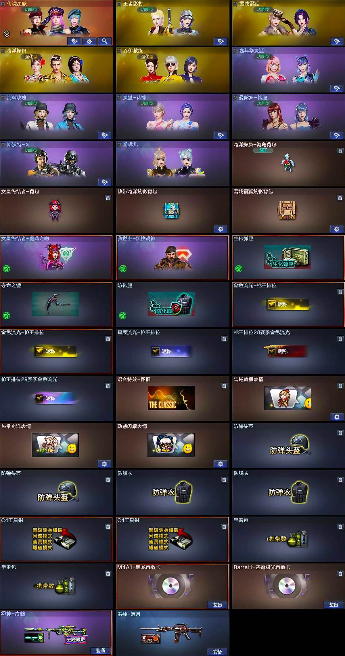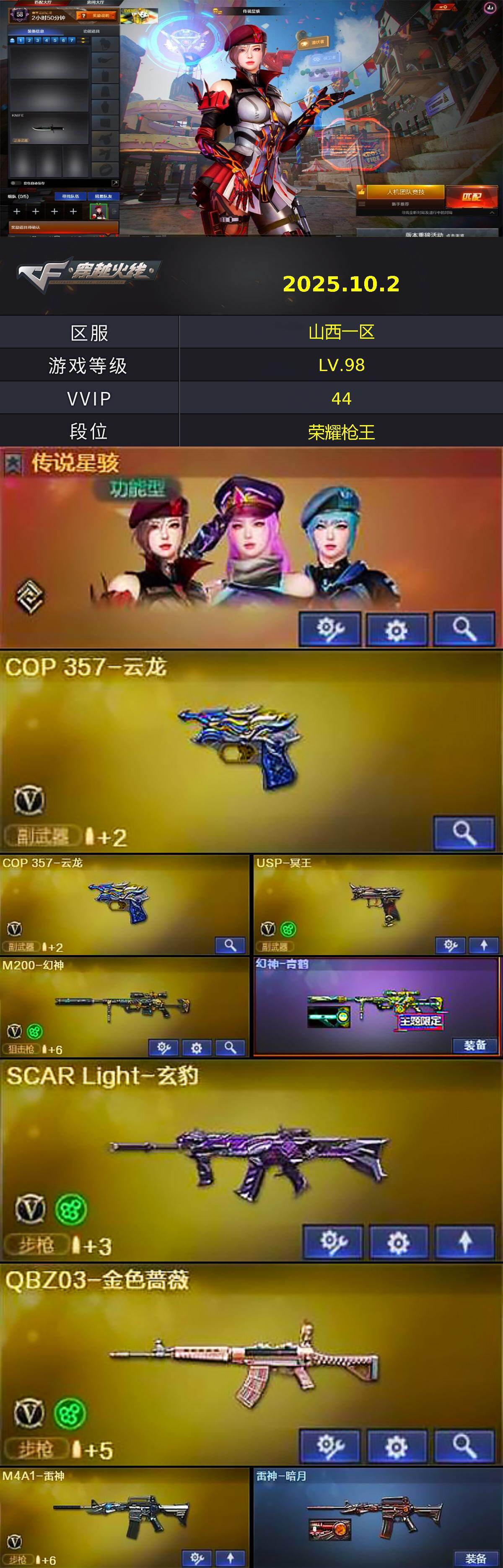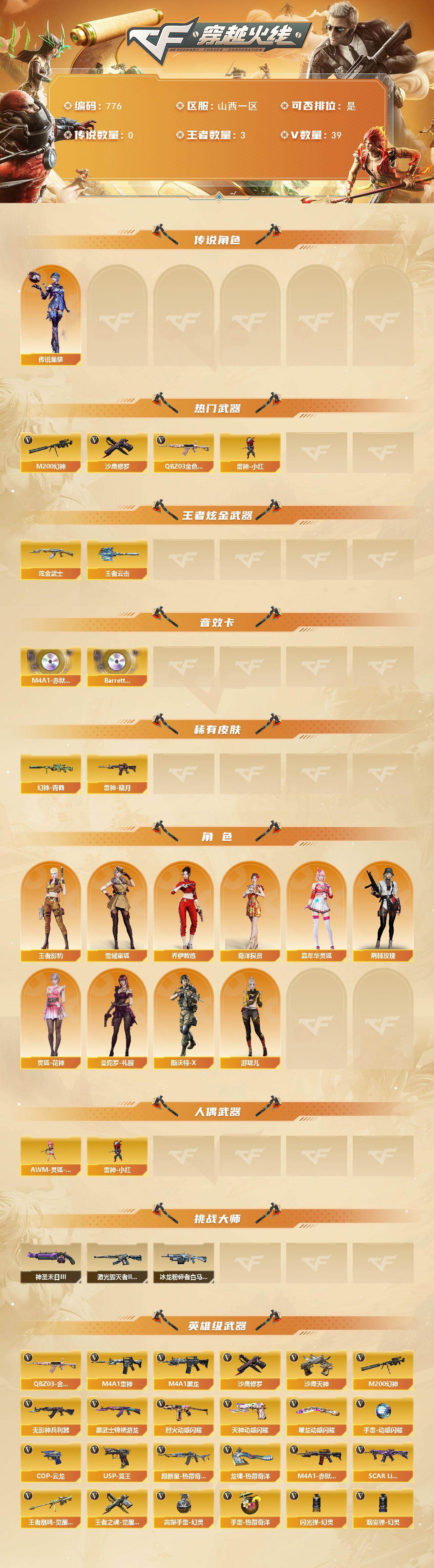 山西一区-39V-3王者-1炫金【传说角色】:传说星骇【热门武器】:QBZ03-金色蔷薇,M200-幻神,雷神-小红,沙鹰-修罗【王者炫金武器】:王者云击,炫金武士【音效卡】:M4A1-赤狱骑士-怀旧音效卡,Barrett-碧霄极光音效卡【皮肤】:幻神-青鹤,雷神-暗月【角色】:王者影豹,雪域霜狐,奇洋探员,乔伊教练,嘉年华灵狐,荆棘玫瑰,灵狐-花神,曼陀罗-礼服,斯沃特-X,游珑儿【人偶武器】:雷神-小红,AWM-灵狐-15周年嘉年华【挑战大师】:冰龙粉碎者-白马银枪,激光毁灭者III-白马银