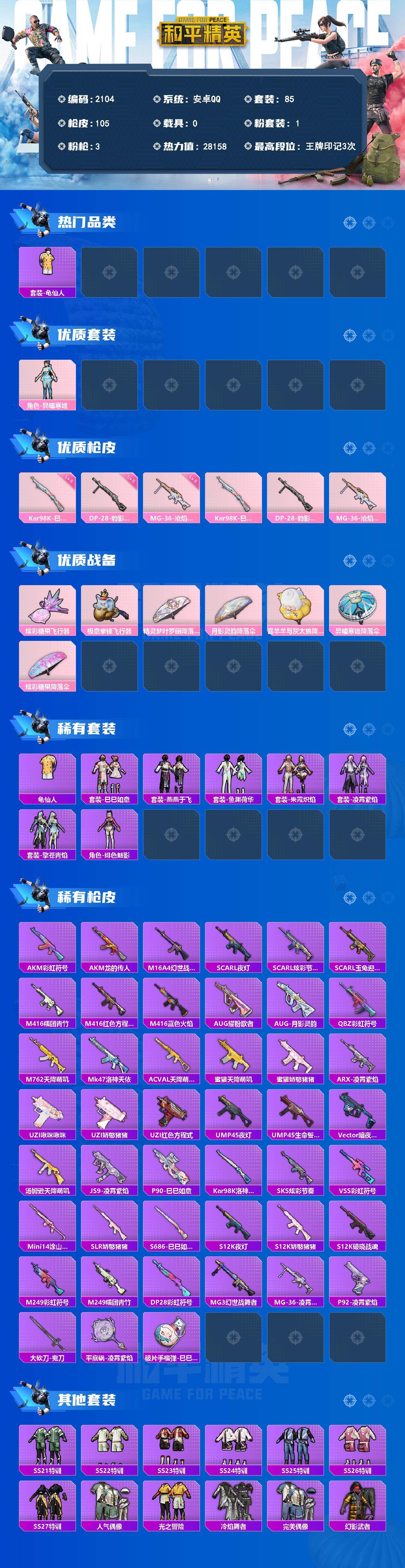 df安卓 【地铁老号,满天赋,特价出】手Q-1粉装-3特效枪-0载具-2粉色飞行器-28158热力值-3王牌印记-85套装-105枪皮