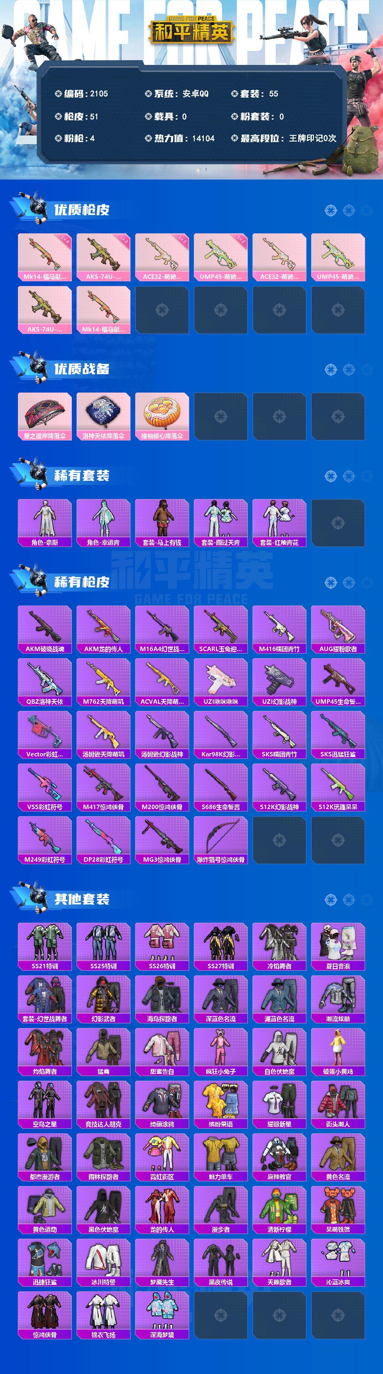 df安卓 【身法小号,迅捷狂鲨,呆萌铁蟹,漫步者,4个特效 特价】手Q-0粉装-4特效枪-0载具-0粉色飞行器-14104热力值-1王牌印记-55套装-51枪皮