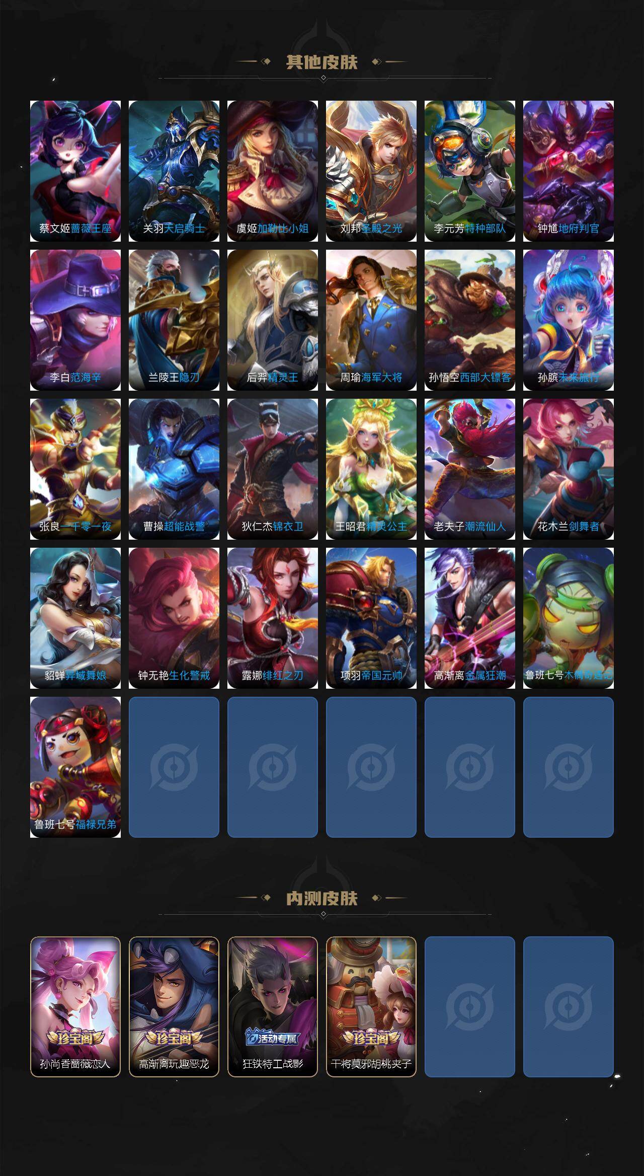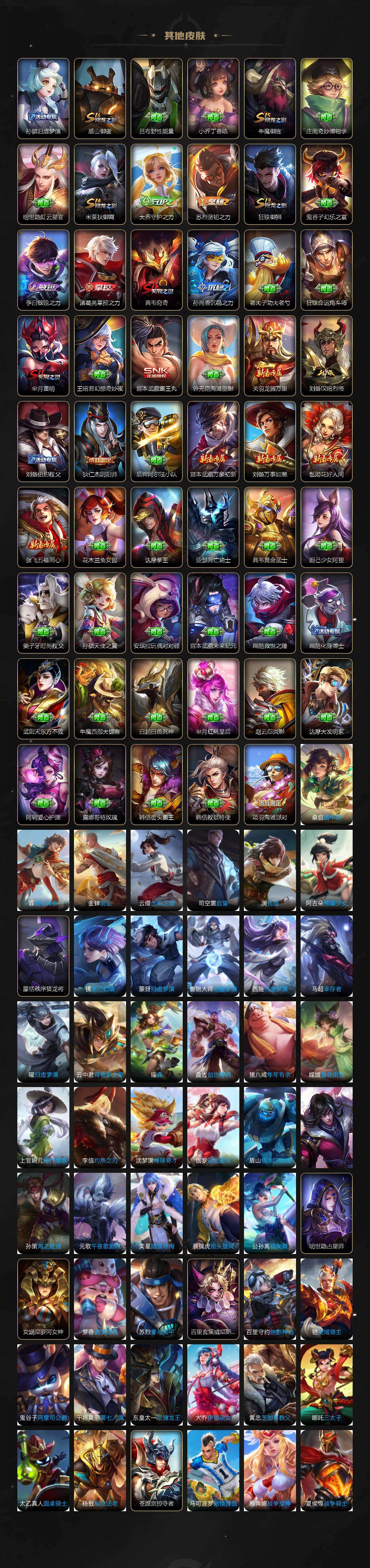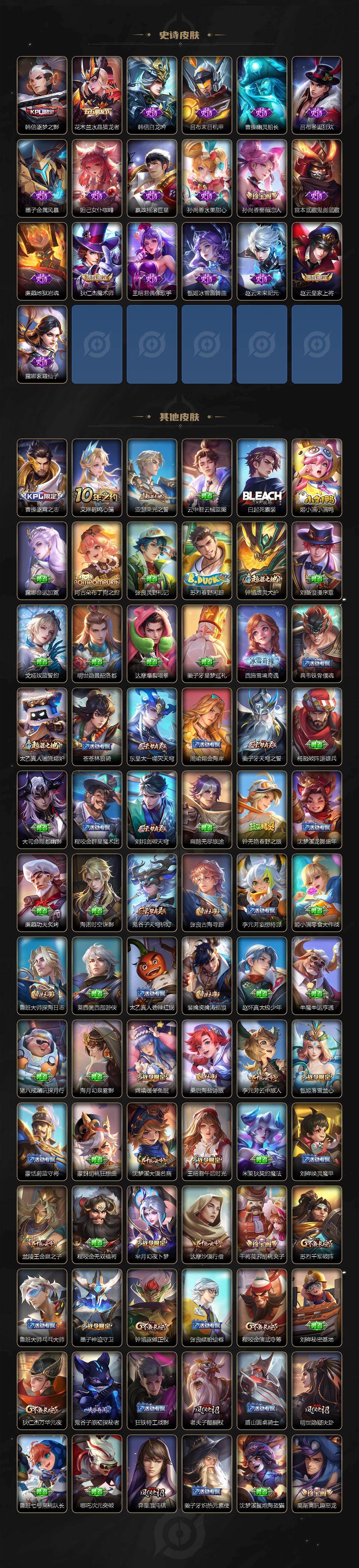 【传说皮肤】:司空震愿照山河定,云缨幻光神枪,赵云乘龙铭钟鼎,诸葛亮鹤羽星尊,张飞百相守梦,曜山海苍雷引,李信山海炽霜斩,李白诗剑行,橘右京枫霜尽,马超无双飞将,孙策挚爱之约,曜李逍遥 ,铠绛天战甲,镜炽阳神光,虞姬启明星使,曜云鹰飞将,李信一念神魔,刘备时之恋人,达摩黄金狮子座,狄仁杰超时空战士