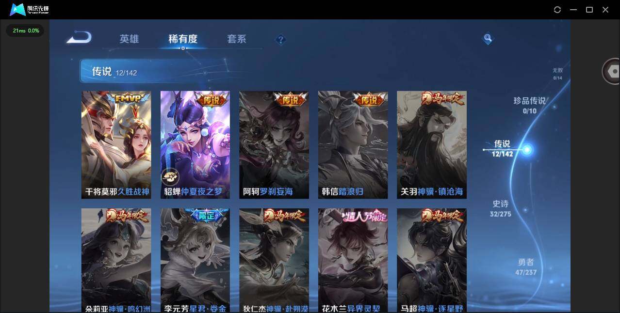 实名: 可修改 贵族等级: V7 英雄数: 125 皮肤数: 111 星传说: 金色仲夏夜 传说皮: 云鹰飞将,久胜战神,仲夏夜之梦,音你心动-小乔,飞鸢探春,游龙清影,续相思,神骥·越千峰,神骥·聚万邦 限定皮: 游园惊梦,一生所爱,山海·碧波行,鸣野蒿,映山客,愿照·众生和