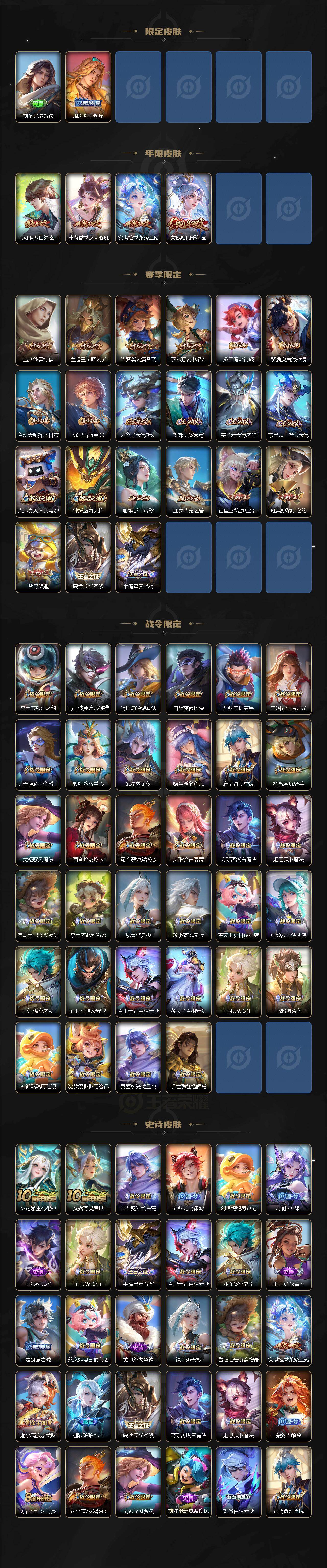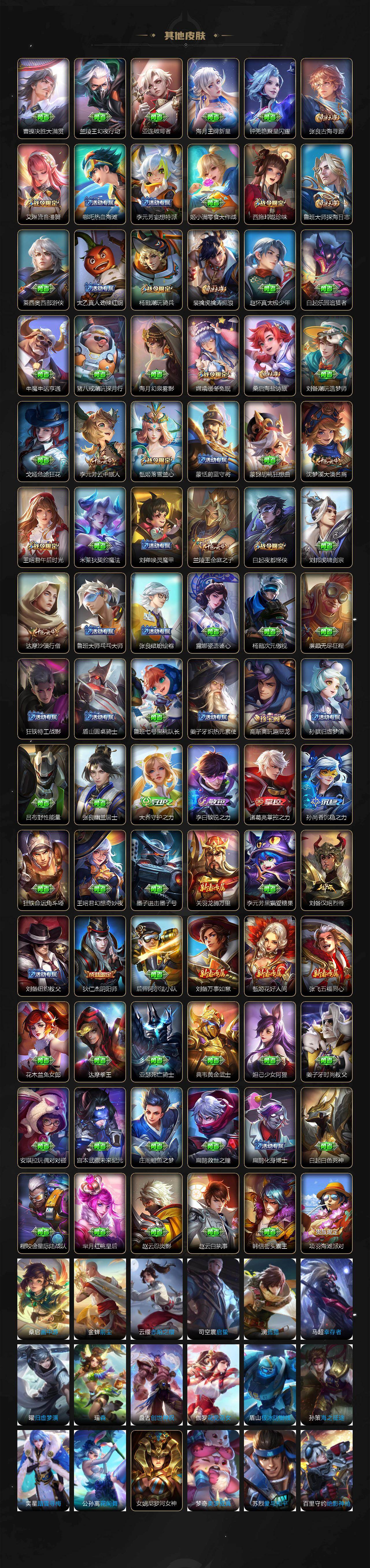 【传说皮肤】:后羿神树通天,女娲愿照千秋盛,云缨幻光神枪,桑启鸣野蒿,孙尚香乘龙问璇玑,马可波罗妄想实况,虞姬无限倾心,项羽无限倾心,孙悟空齐天大圣,吕布怒海麟威,孙尚香音你闪耀,虞姬启明星使,刘备时之恋人,貂蝉仲夏夜之梦,宫本武藏地狱之眼,孙悟空地狱火
