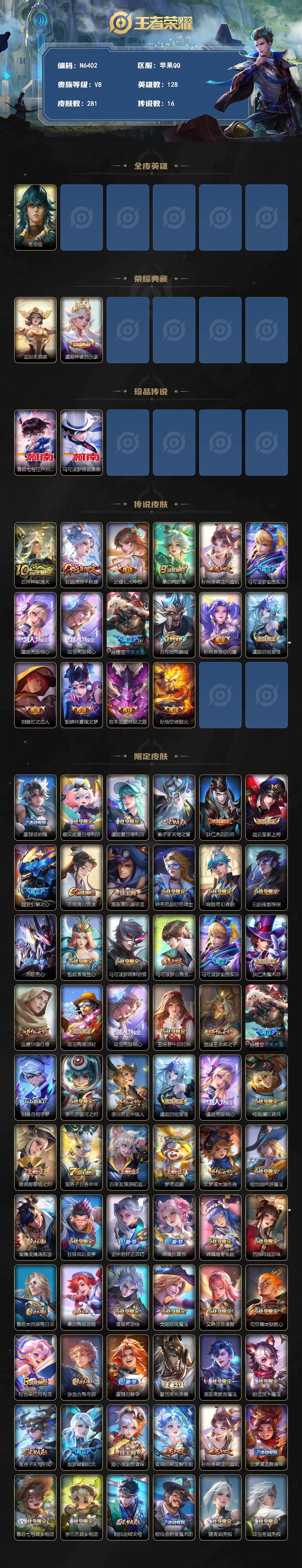 苹果Q-V8-至尊星耀IV段位-128英雄-281皮肤-1典藏皮肤-1典藏英雄-2珍品传说-16传说-82史诗