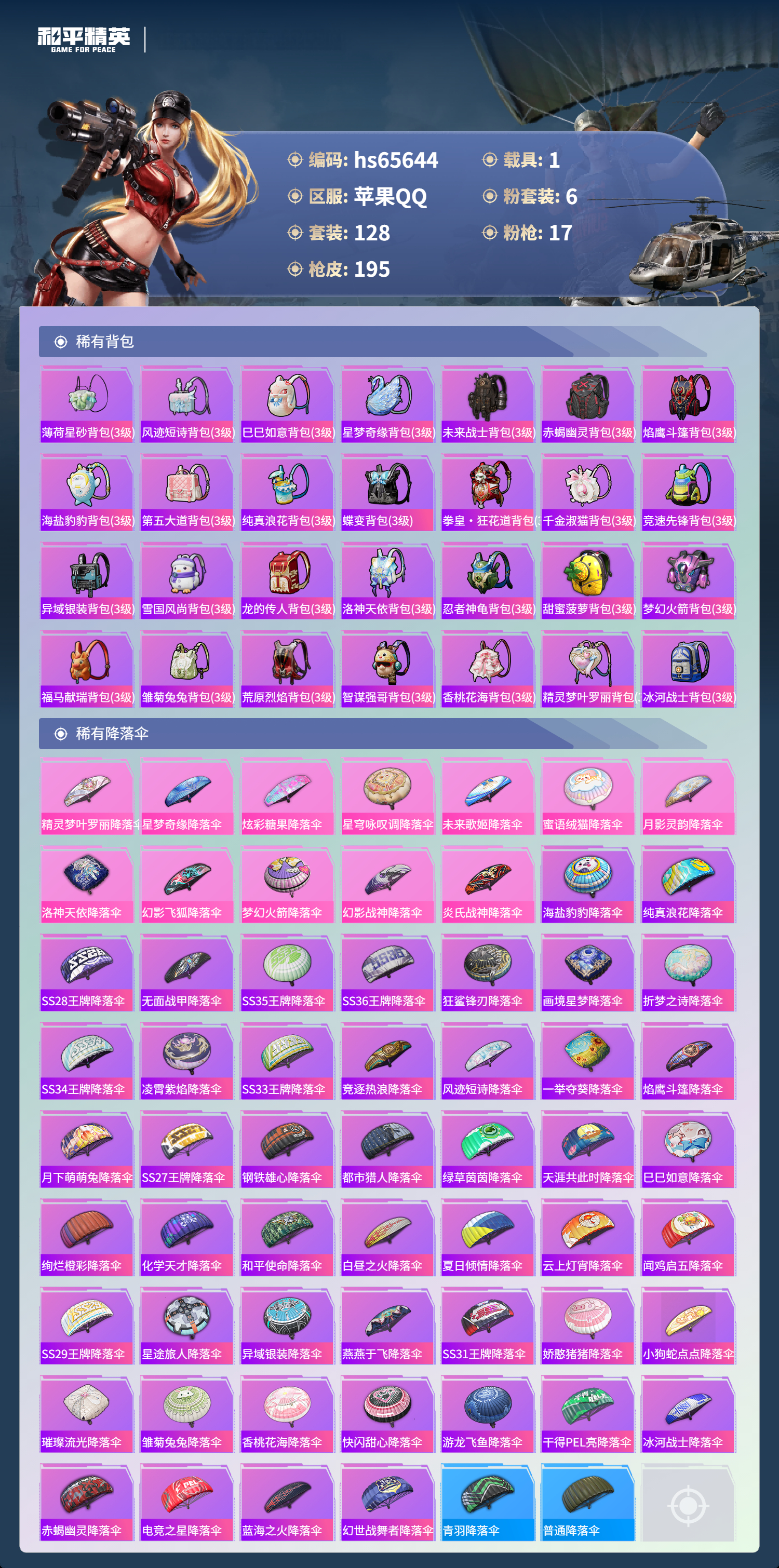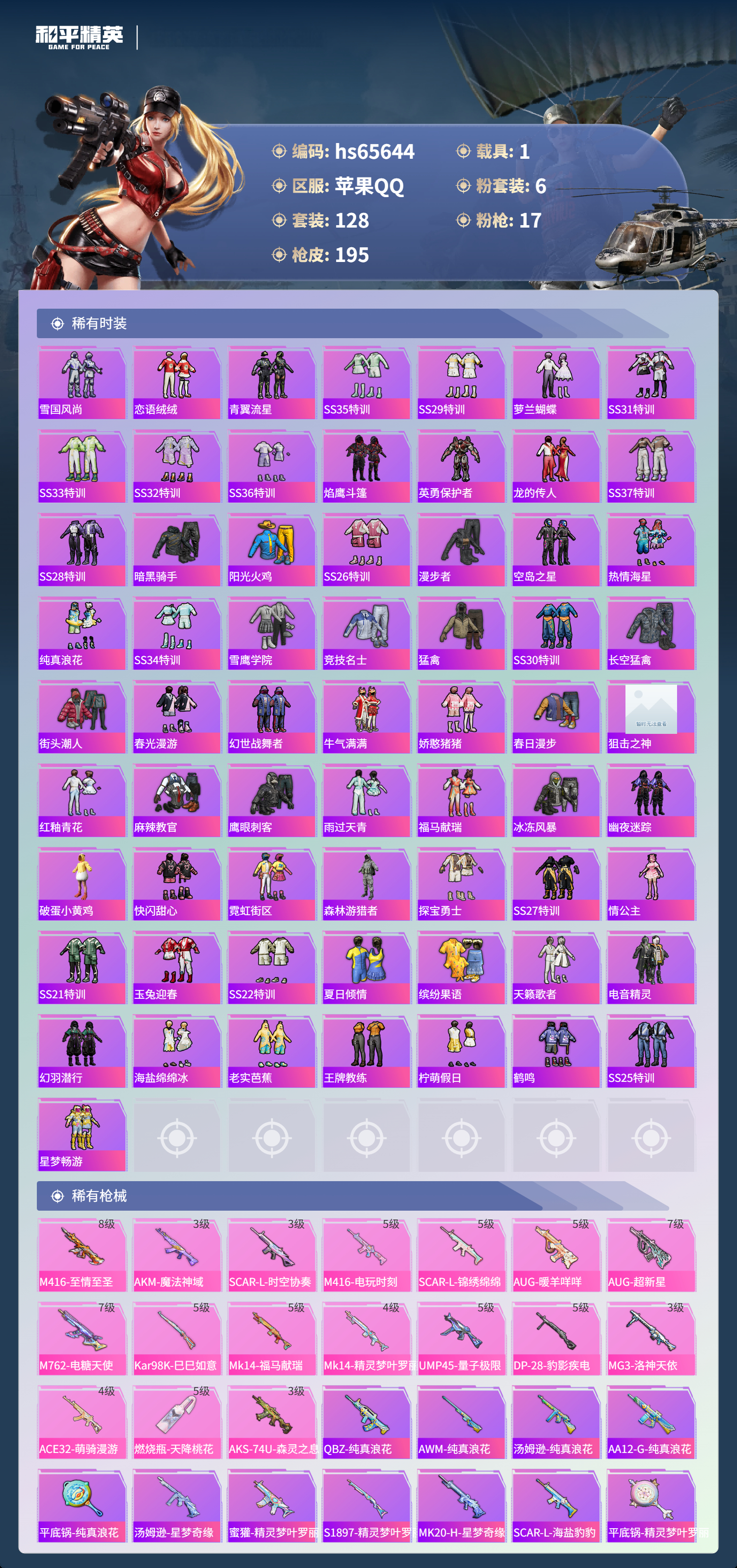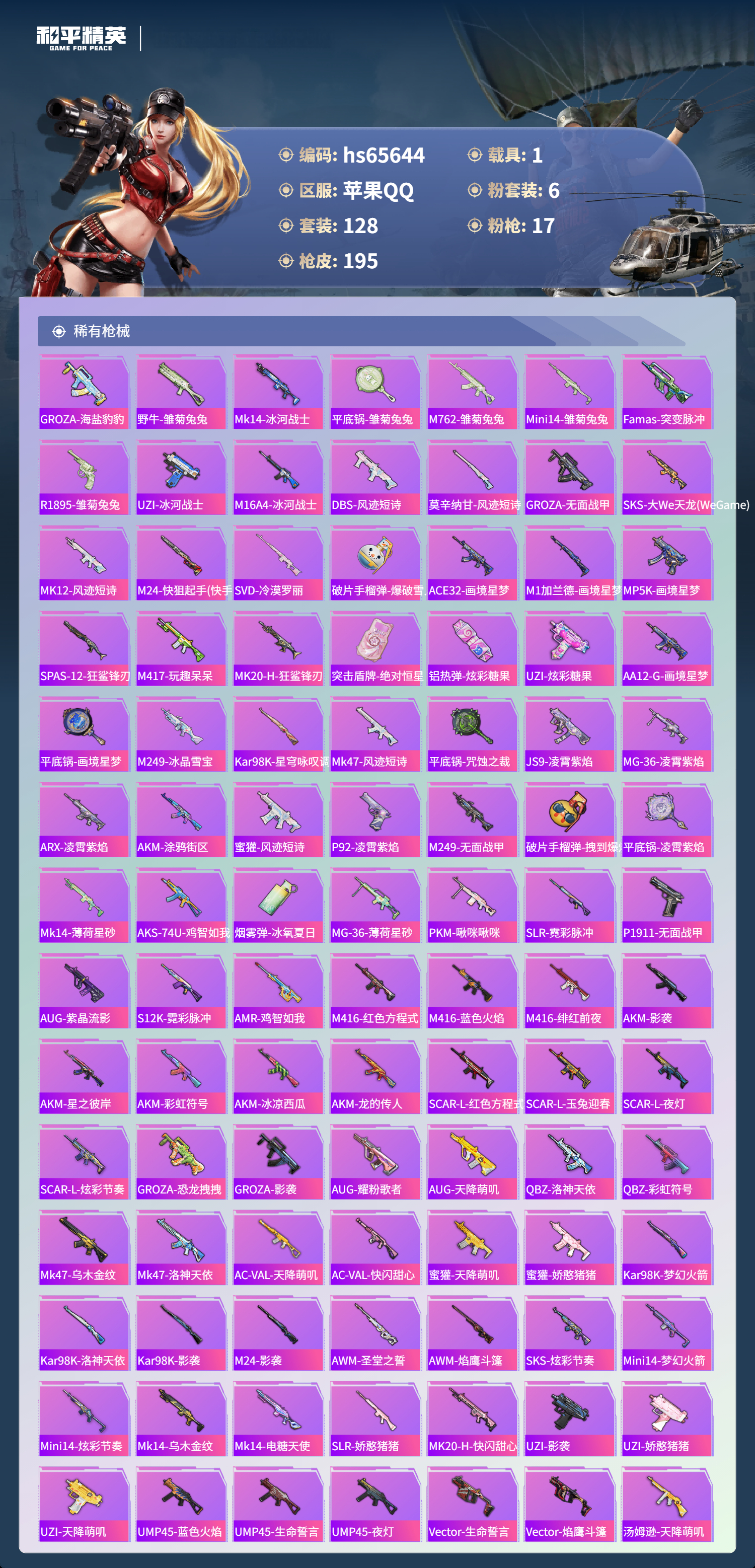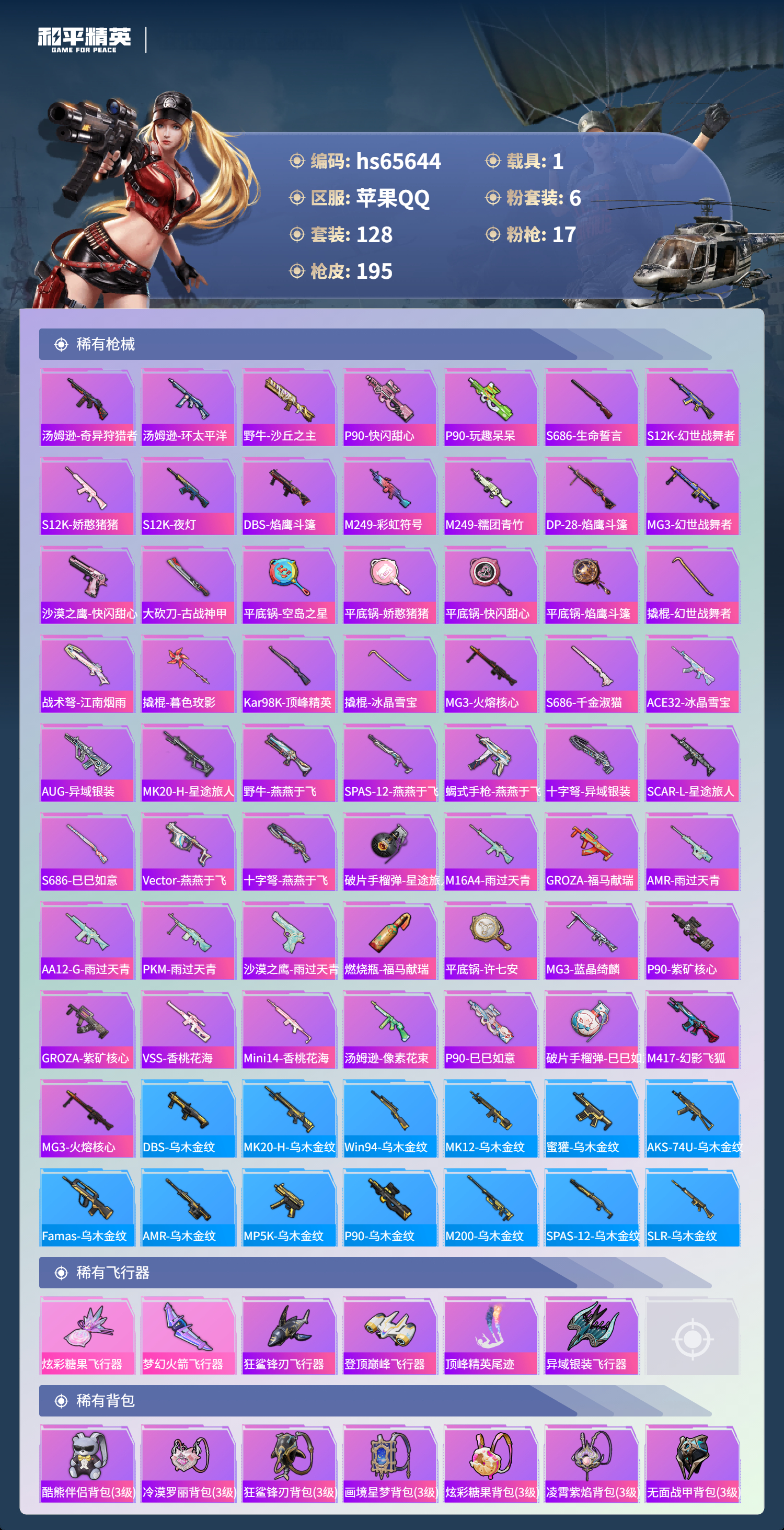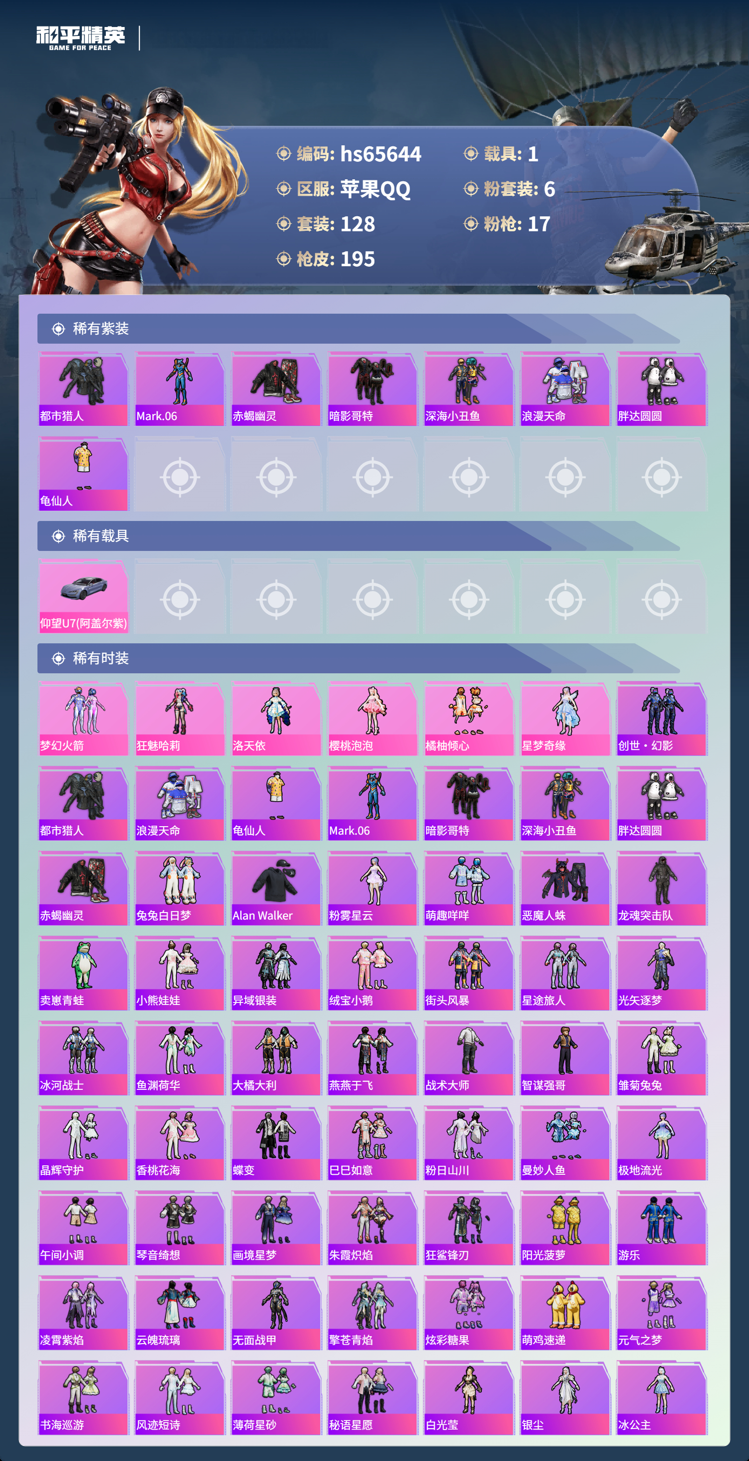 hs65644 苹果手Q-10王牌印记-6粉装-17特效枪-1载具-64497热力值-128套装-195枪皮-3卓越印记-1传奇印记