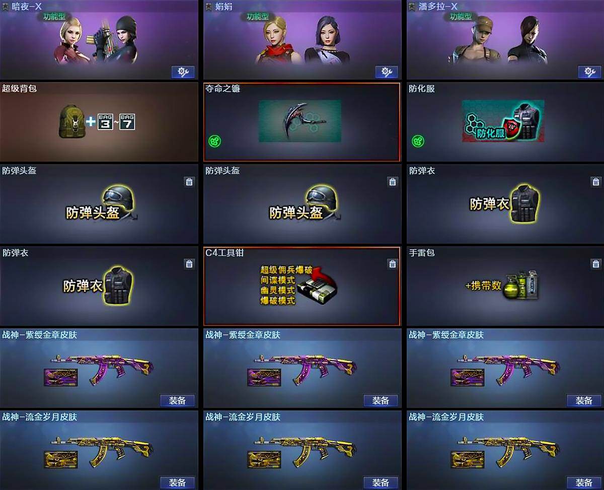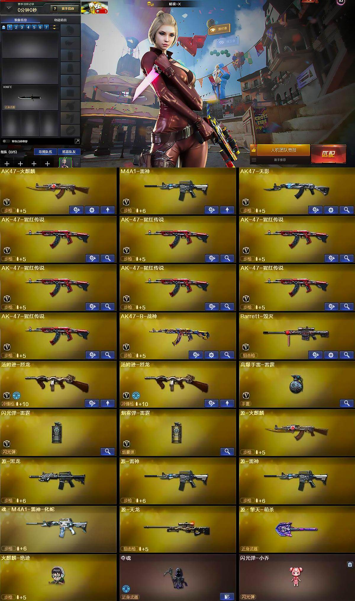 【英雄级武器】:AK47-火麒麟,M4A1-雷神,AK47-无影,AK-47-猩红传说*7,AK47-B-战神,Barrett-毁灭,汤姆逊-烈龙*2,高爆手雷-