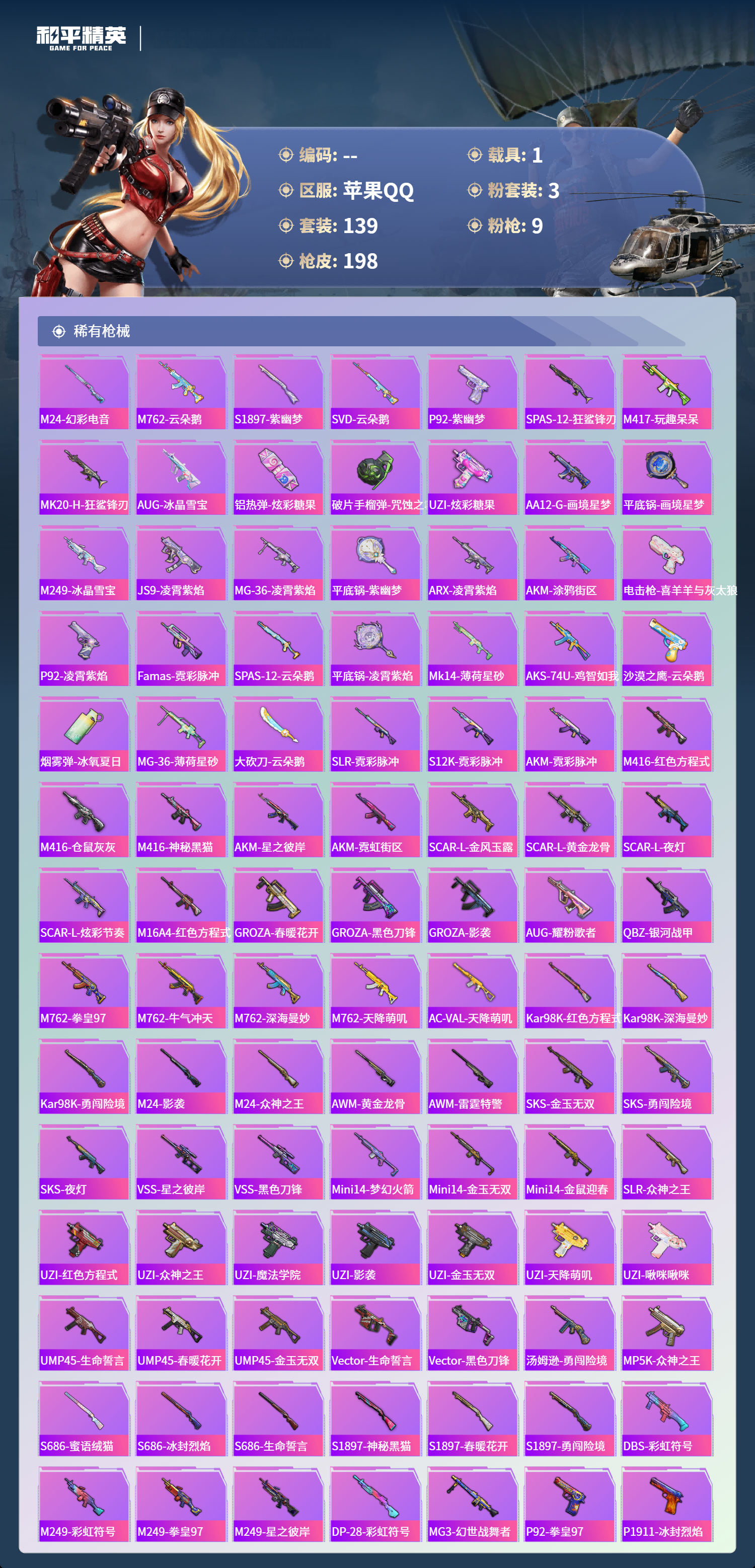 hs65864苹果手Q-10王牌印记-有战神框-3粉装-9特效枪-1载具-61719热力值-139套装-198枪皮-3卓越印记-1传奇印记
