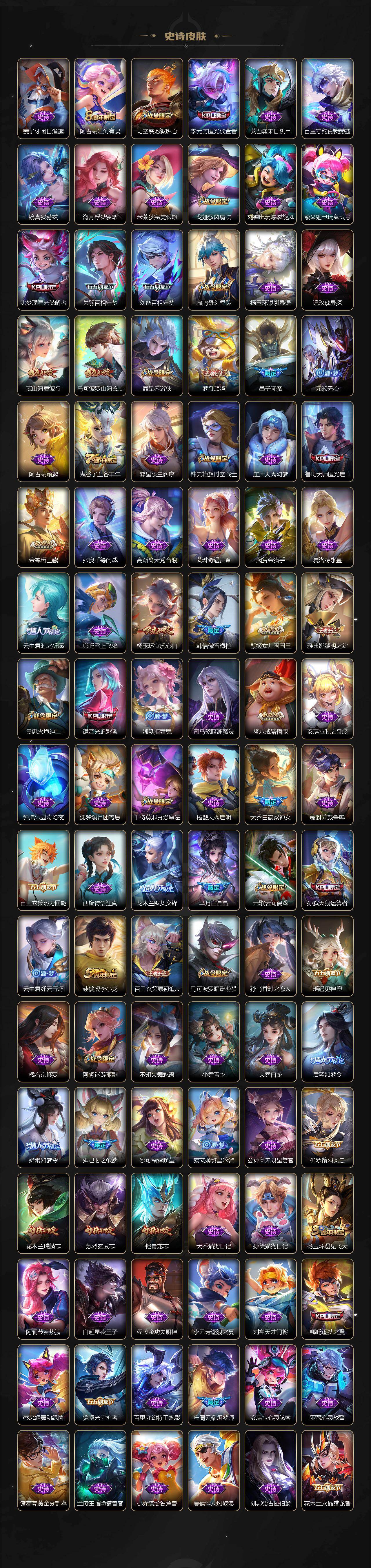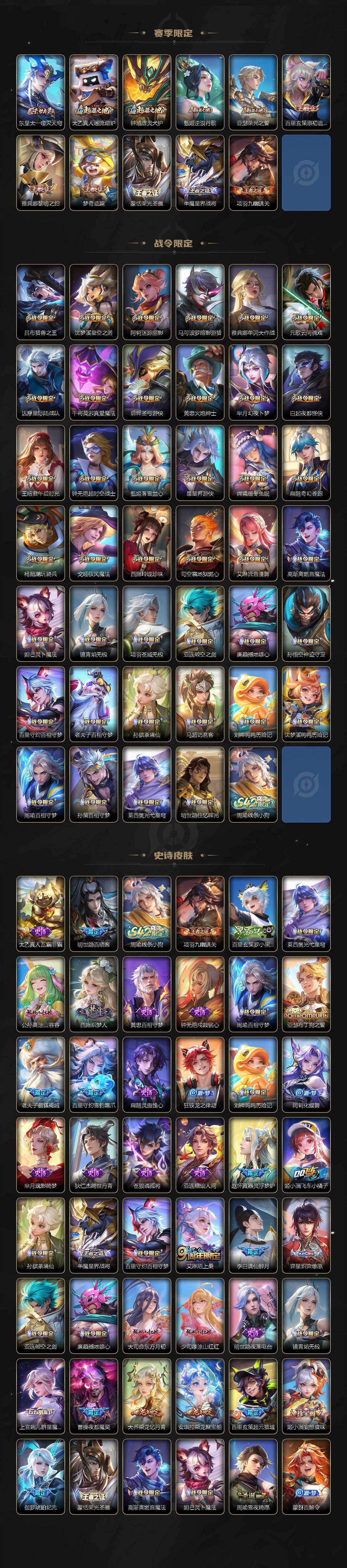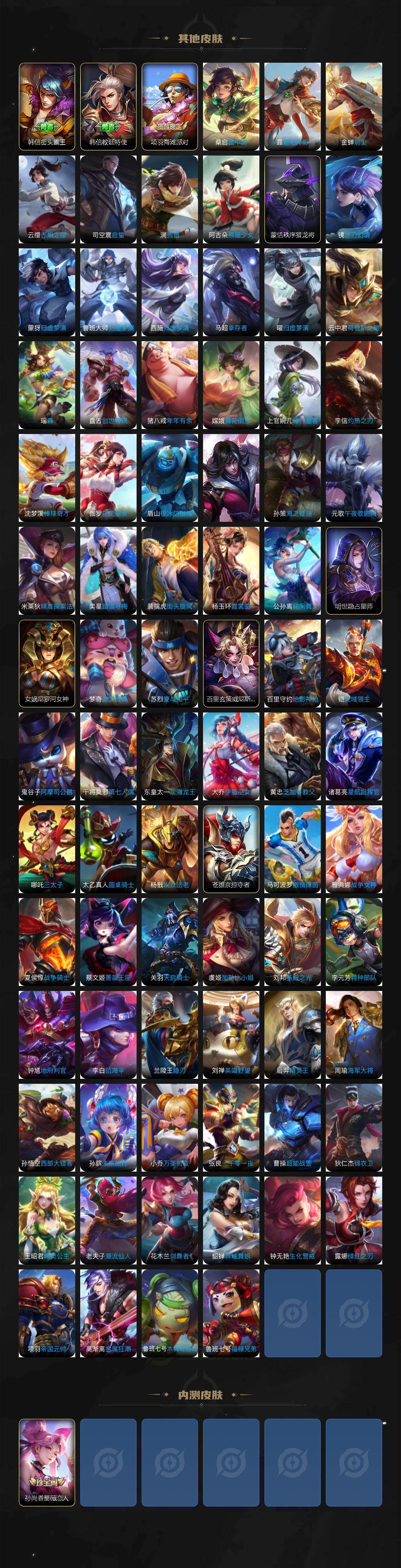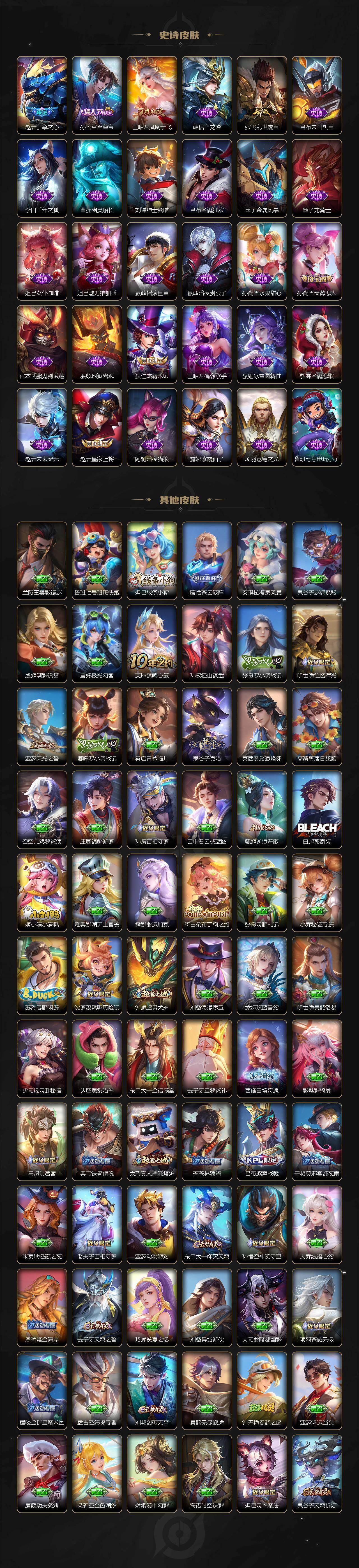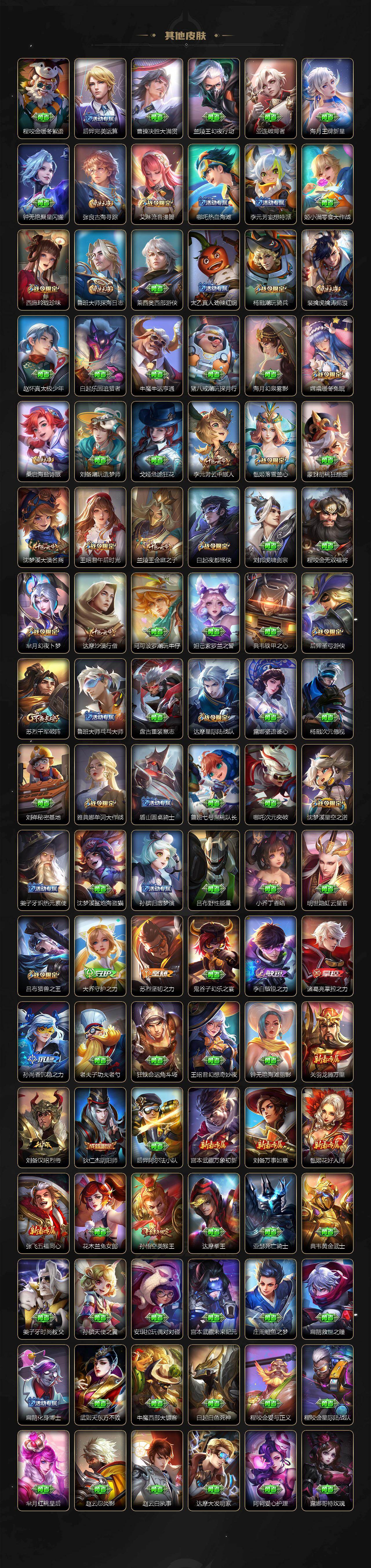 【英雄全皮】:李白全皮,姜子牙全皮,孙权全皮,王昭君全皮,杨玉环全皮,苍全皮,哪吒全皮,苏烈全皮,百里玄策全皮,嫦娥全皮,鲁班大师全皮,镜全皮,阿古朵全皮,夏洛特全皮,司空震全皮,金蝉全皮,莱西奥全皮,戈娅全皮,空空儿全皮