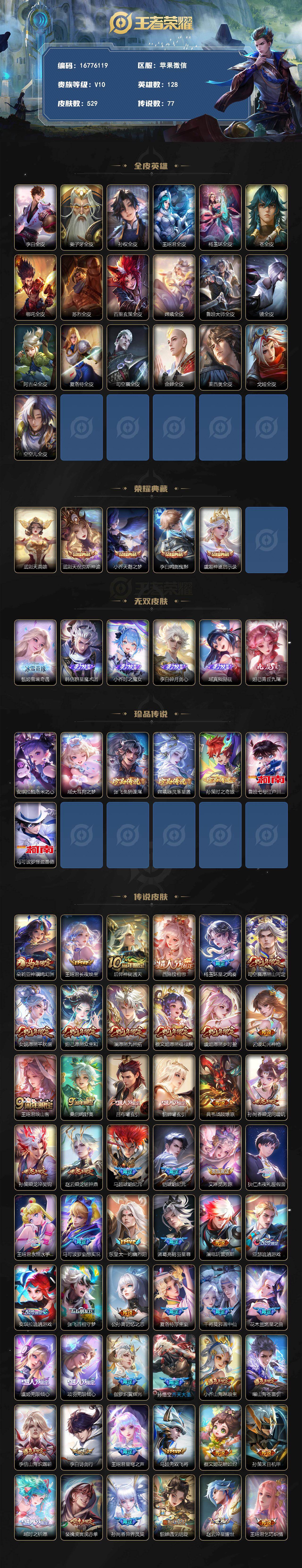 【16776119】苹果WX-V10-最强王者段位-128英雄-529皮肤-4典藏皮肤-1典藏英雄-6无双-7珍品传说-77传说-178史诗