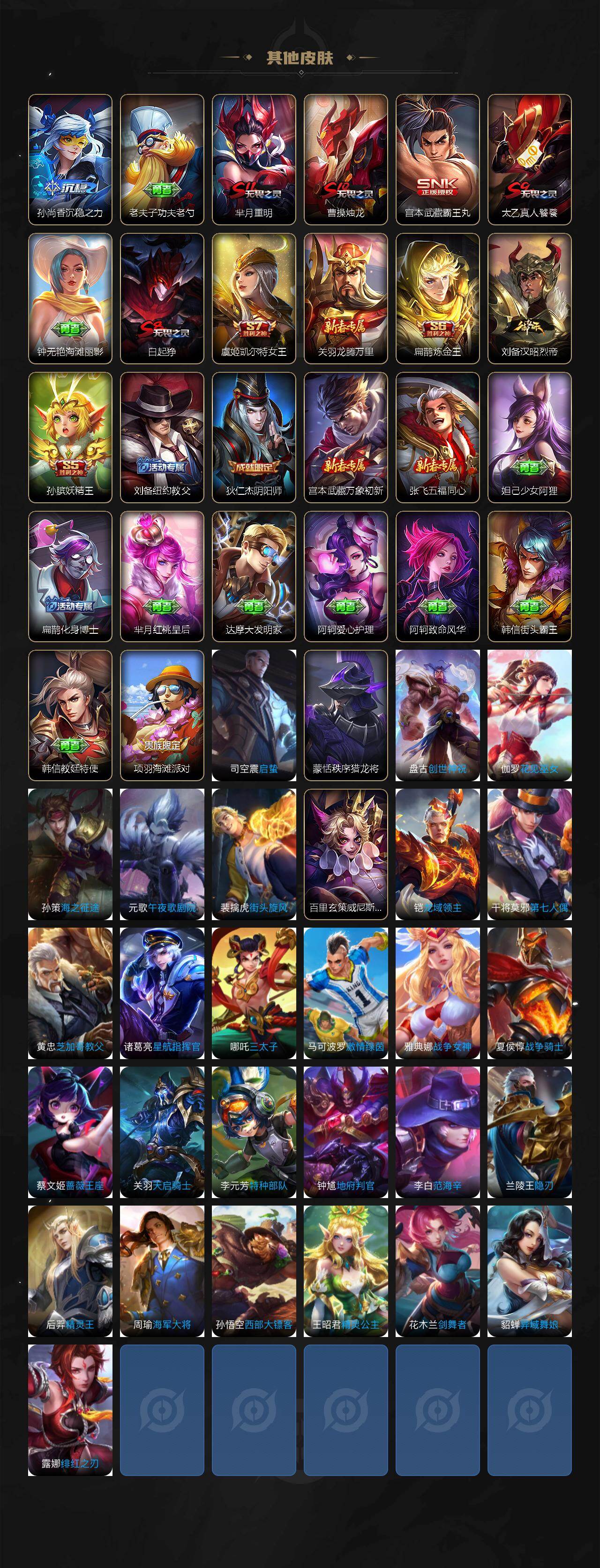 【限定皮肤】:白起狰,狄仁杰阴阳师,虞姬凯尔特女王,赵云皇家上将,鲁班七号狮舞东方,孙膑妖精王,扁鹊炼金王,芈月重明,夏侯惇朔风刀,曹操烛龙,典韦穷奇,狄仁杰魔术师,项羽海滩派对,关羽冰锋战神,韩信飞衡,牛魔御旌,钟馗神迹守卫,杨玉环遇见飞天,蔡文