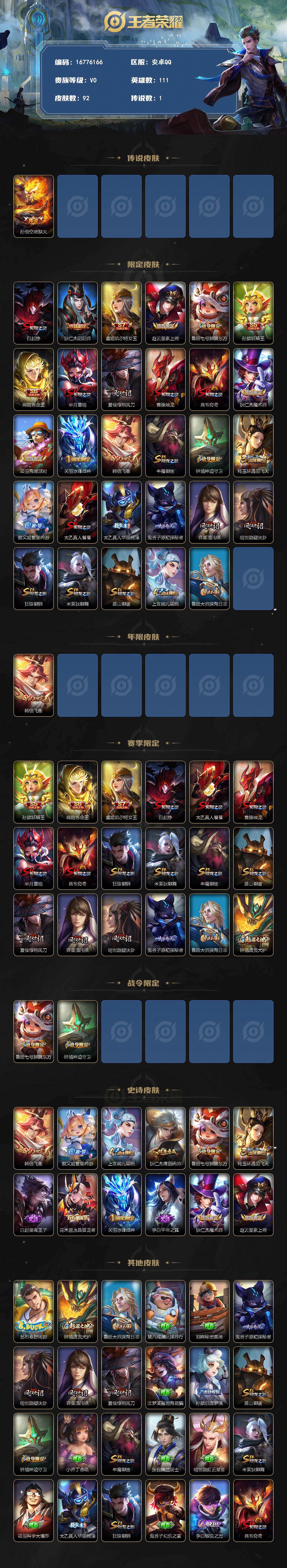 【16776166】安卓Q-V0-荣耀黄金IV段位-111英雄-92皮肤-1传