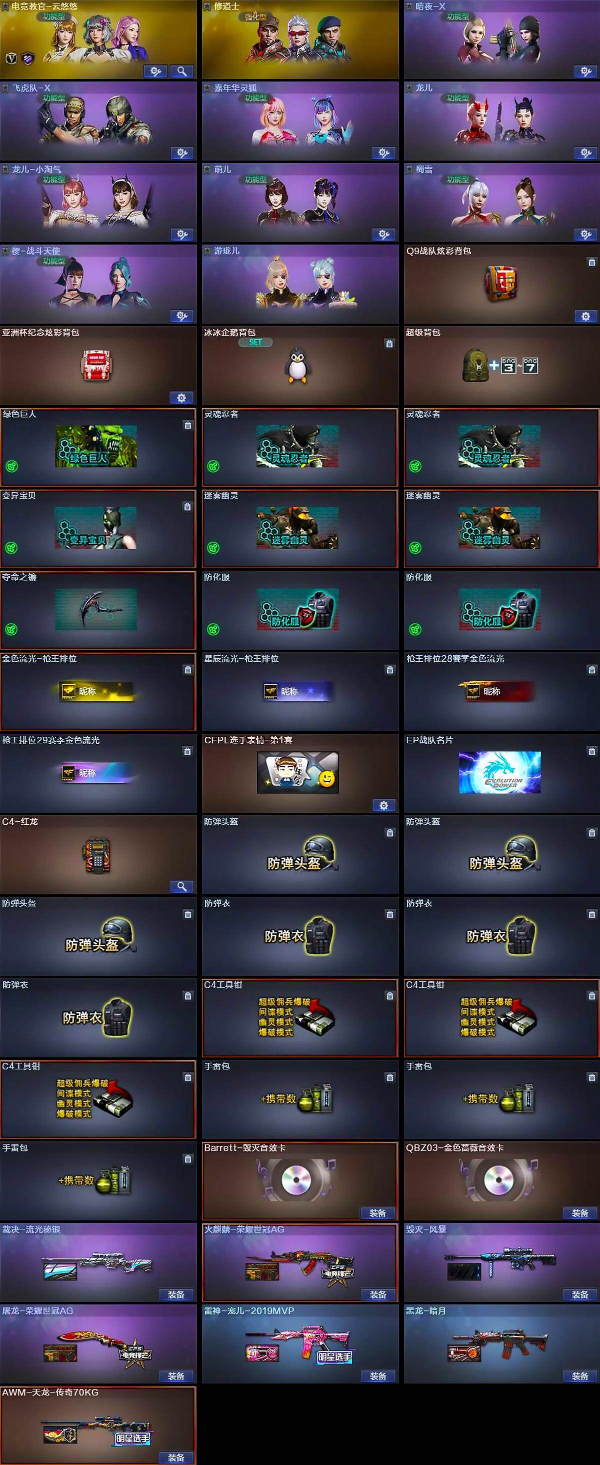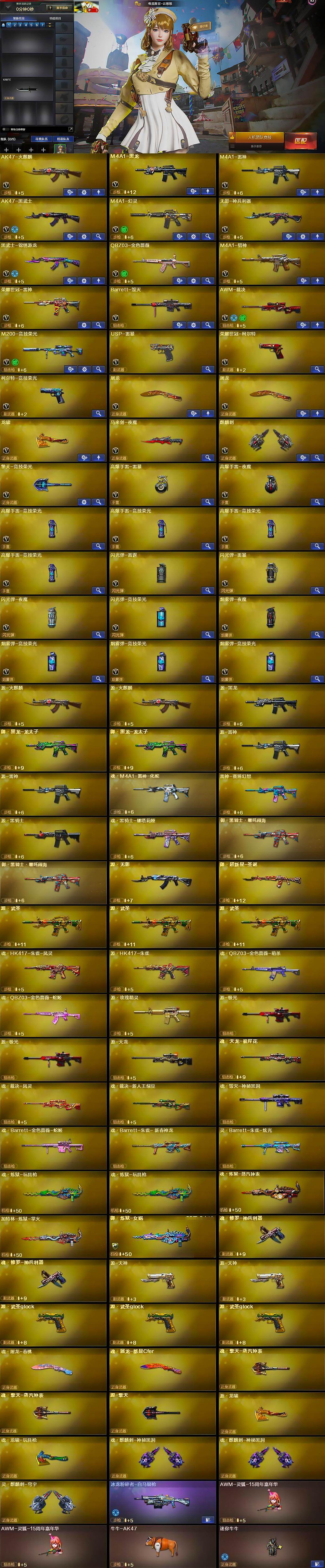 【皮肤】:裁决-流光秘银,雷神-宠儿-2019MVP,火麒麟-荣耀世冠AG,毁灭-风暴,黑龙-暗月,AWM-天龙-传奇70KG,屠龙-荣耀世冠AG