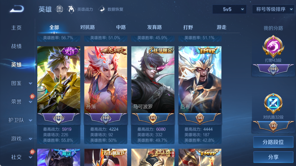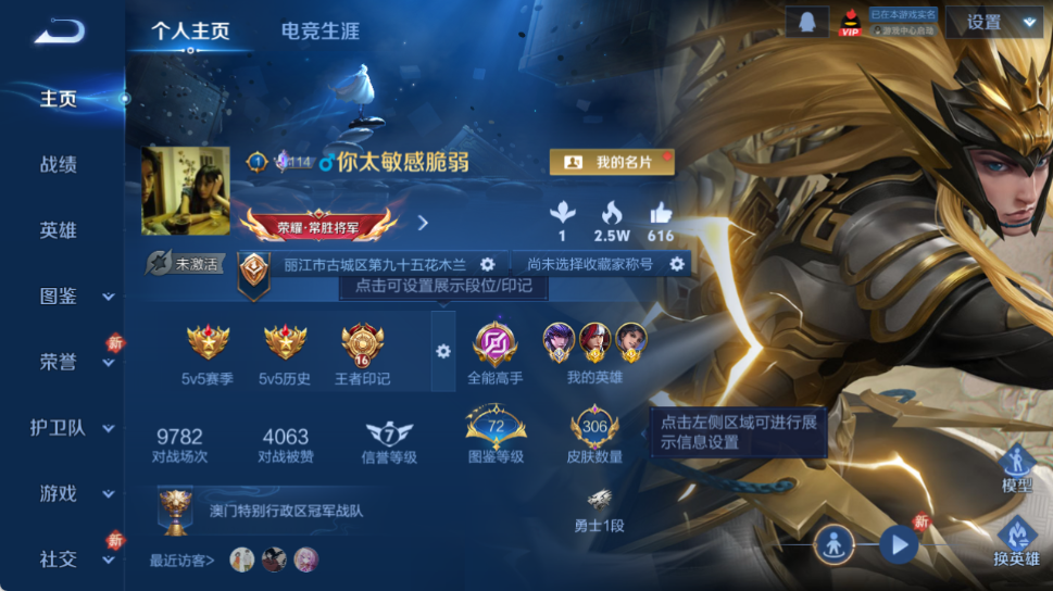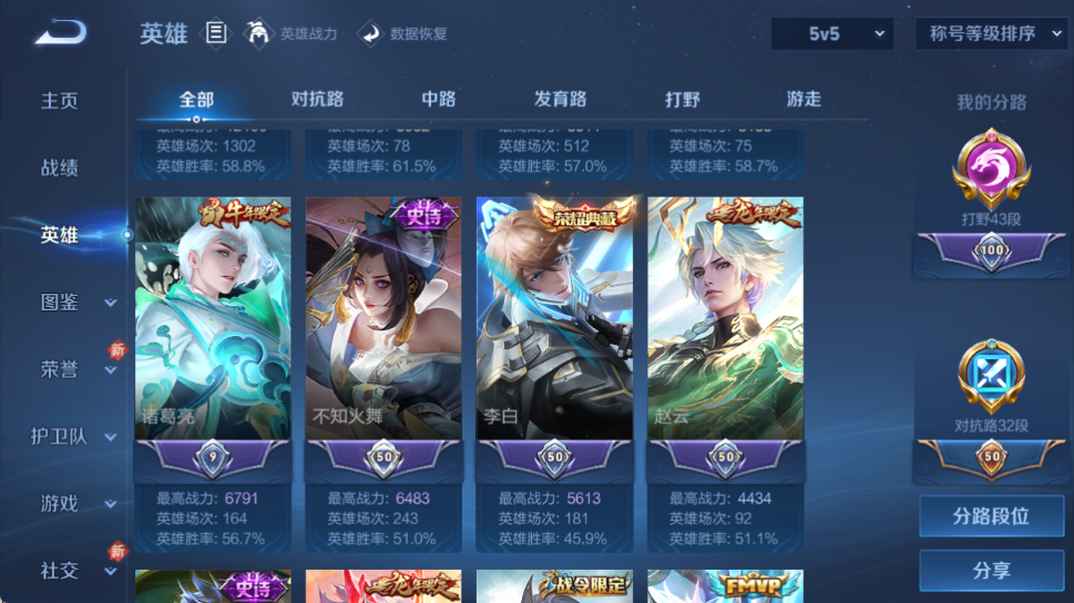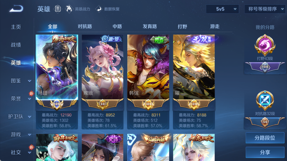 1.2w小国马超!3金标!43段打野!皮肤数量306印记总数