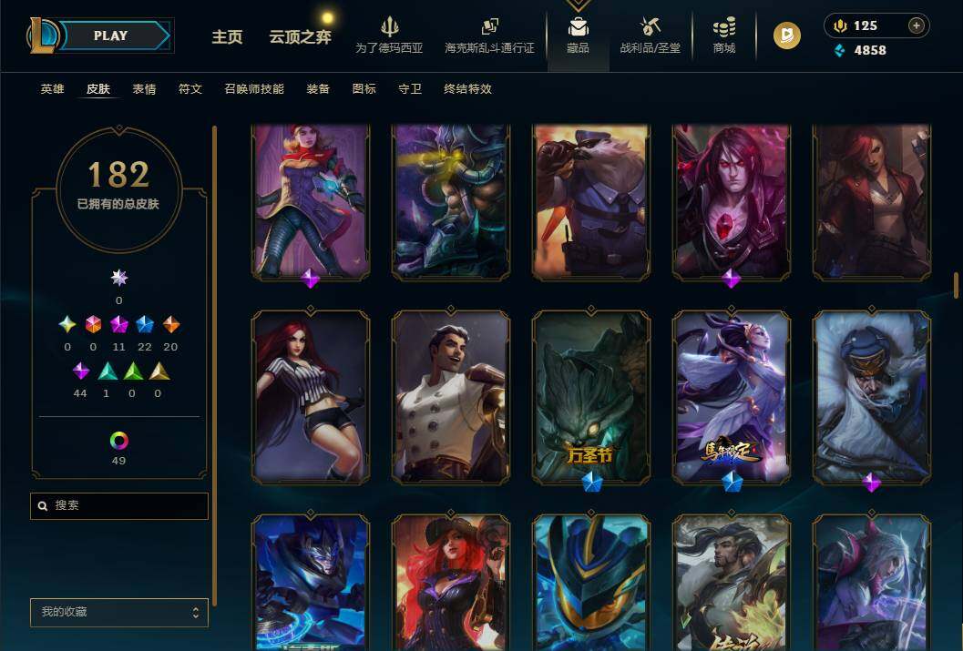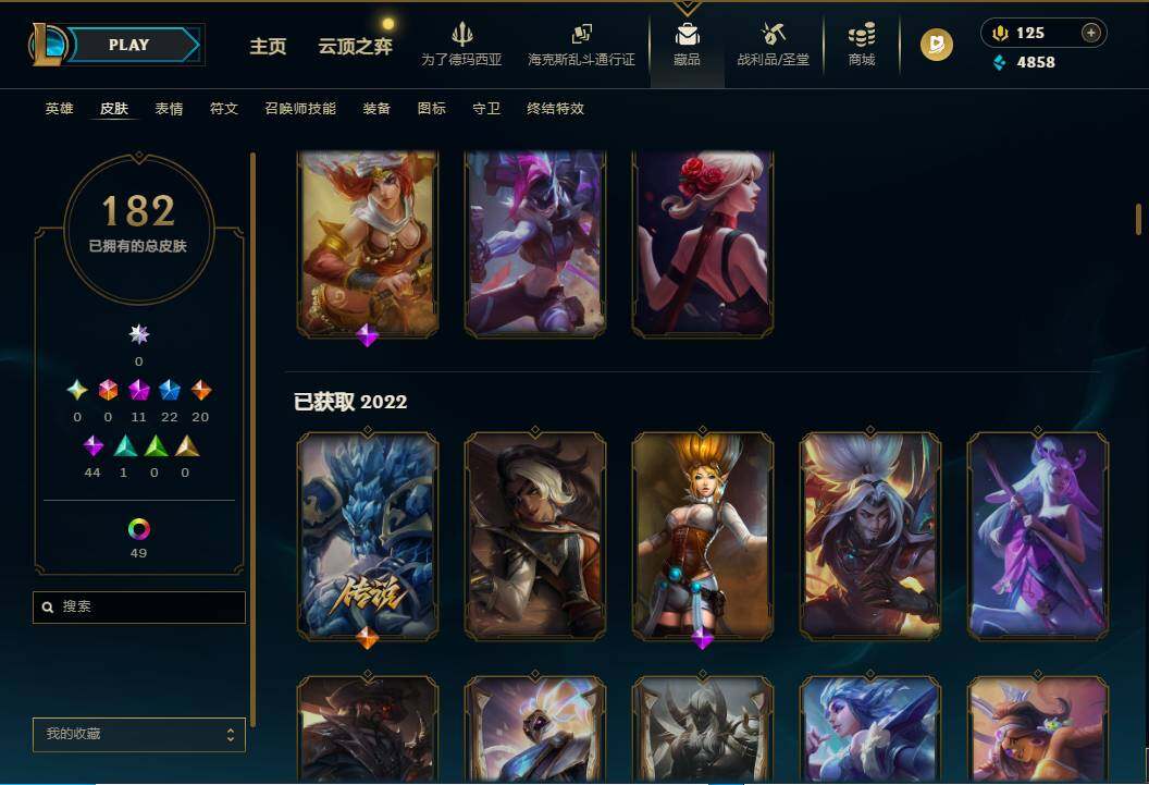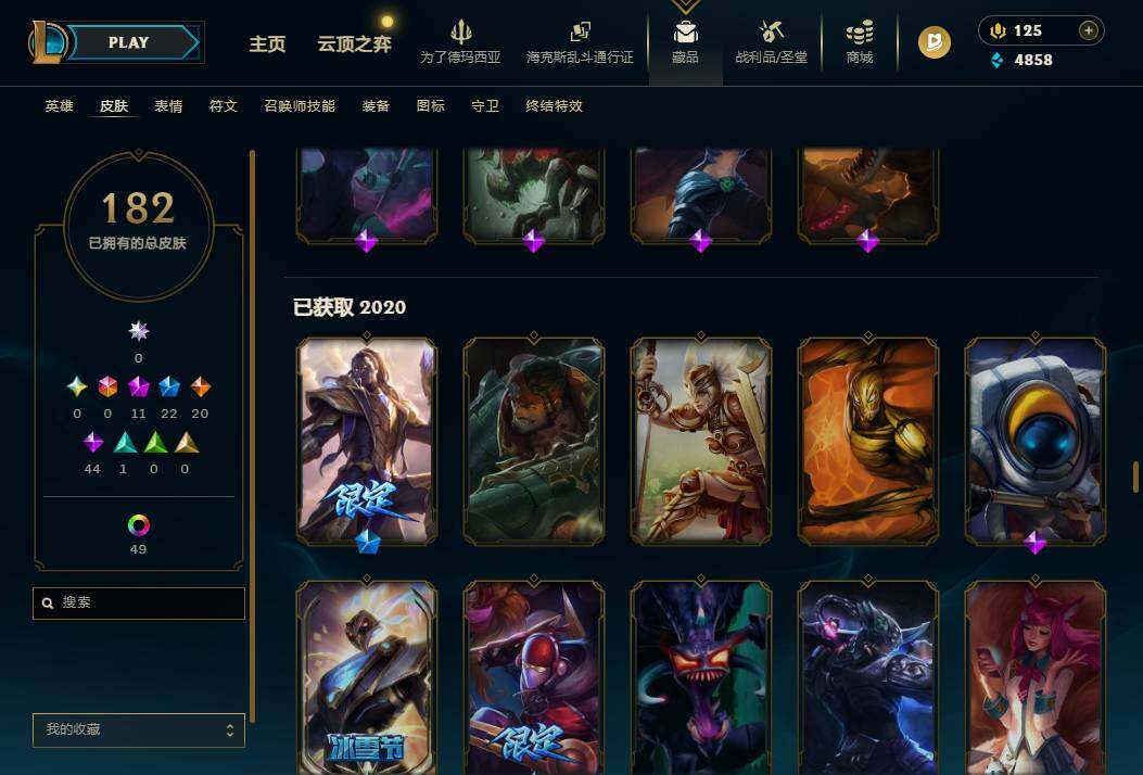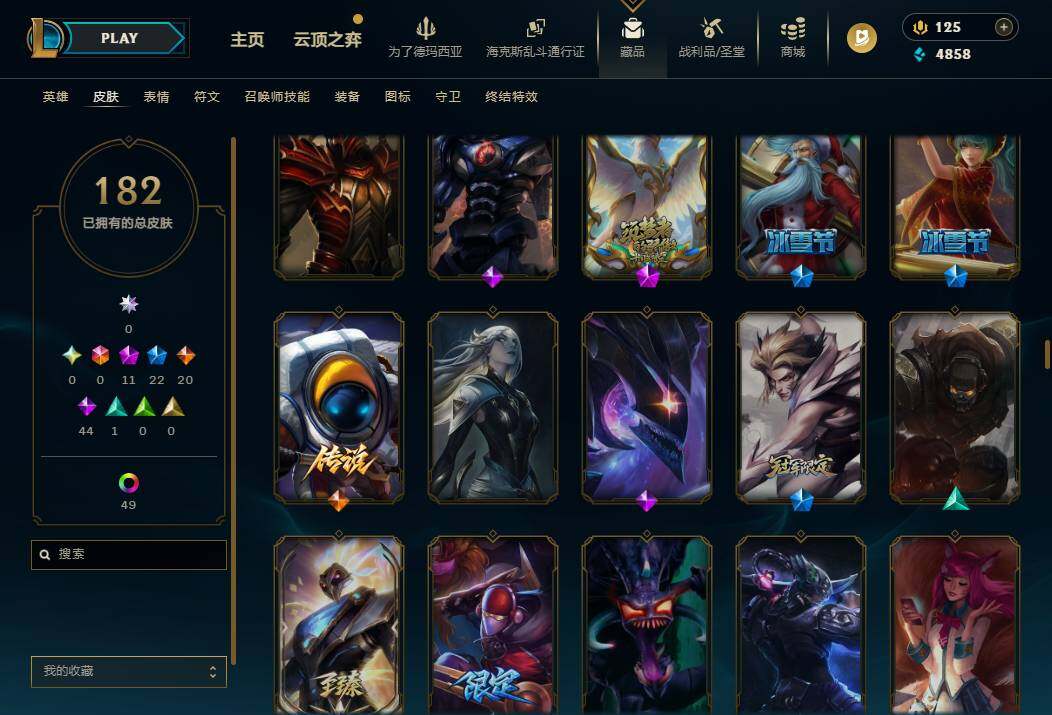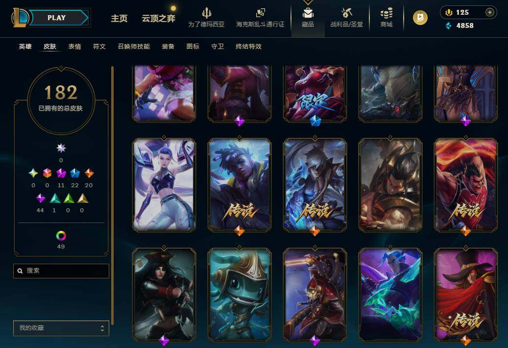 168英雄/182皮肤/11神话/22限定/1臻彩/55炫彩/